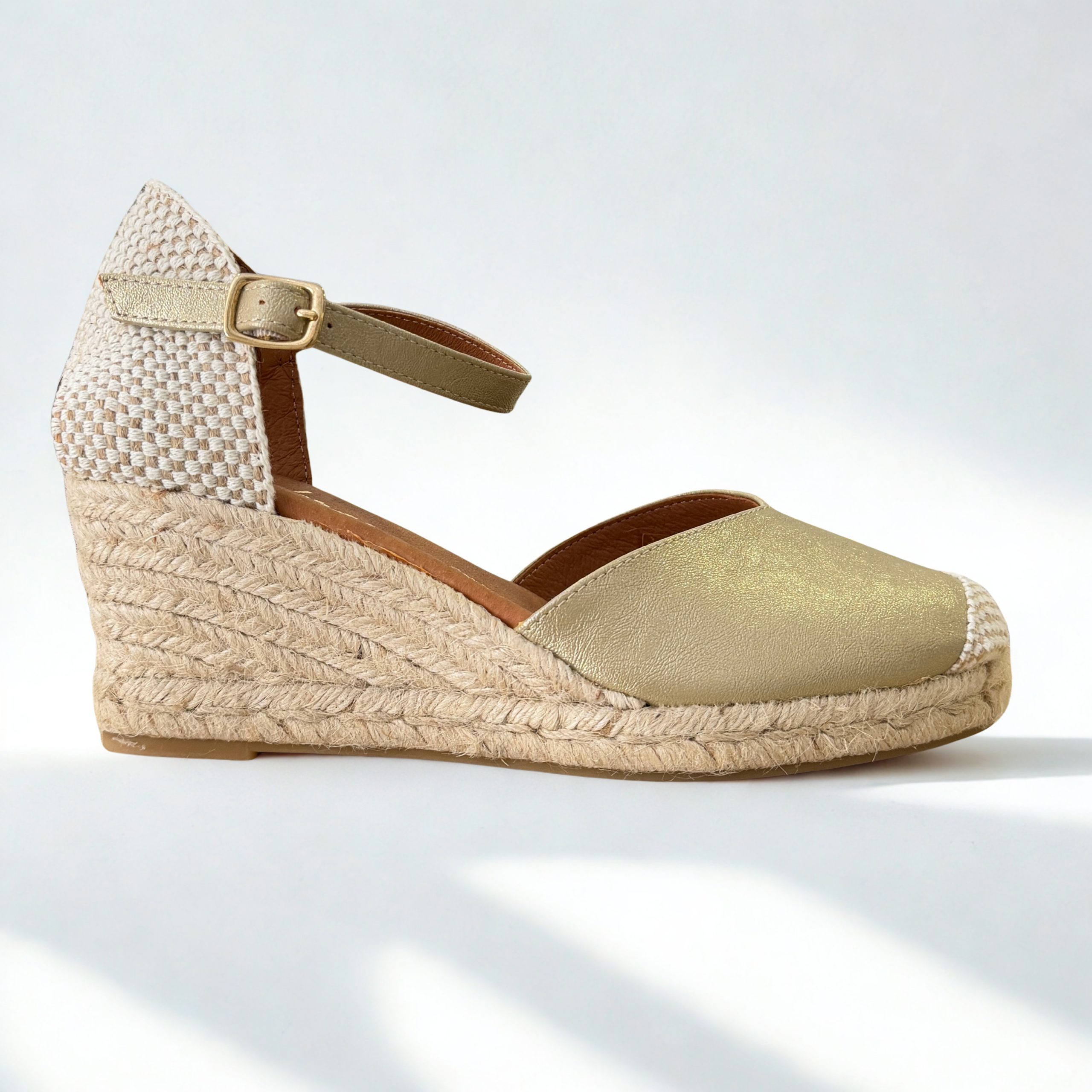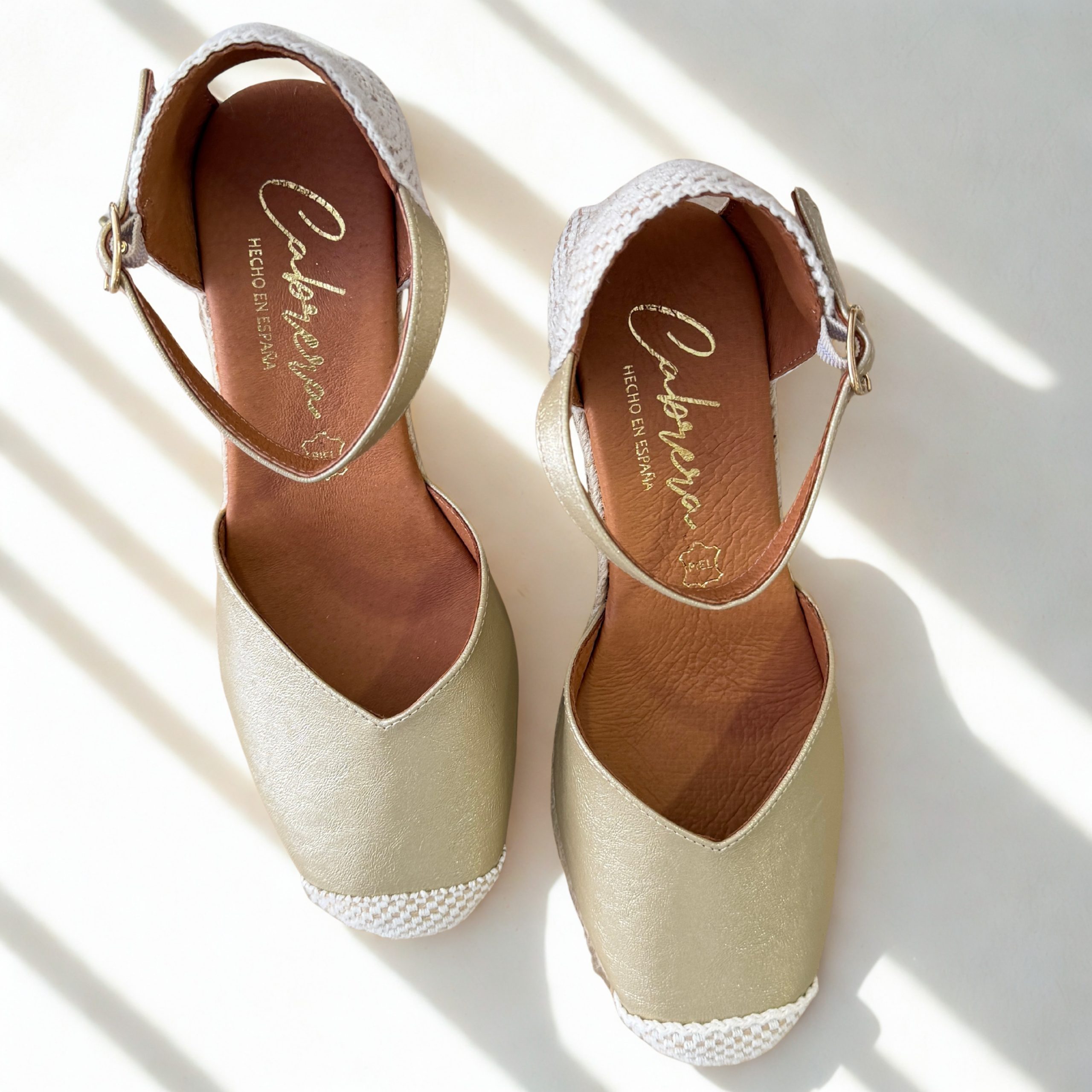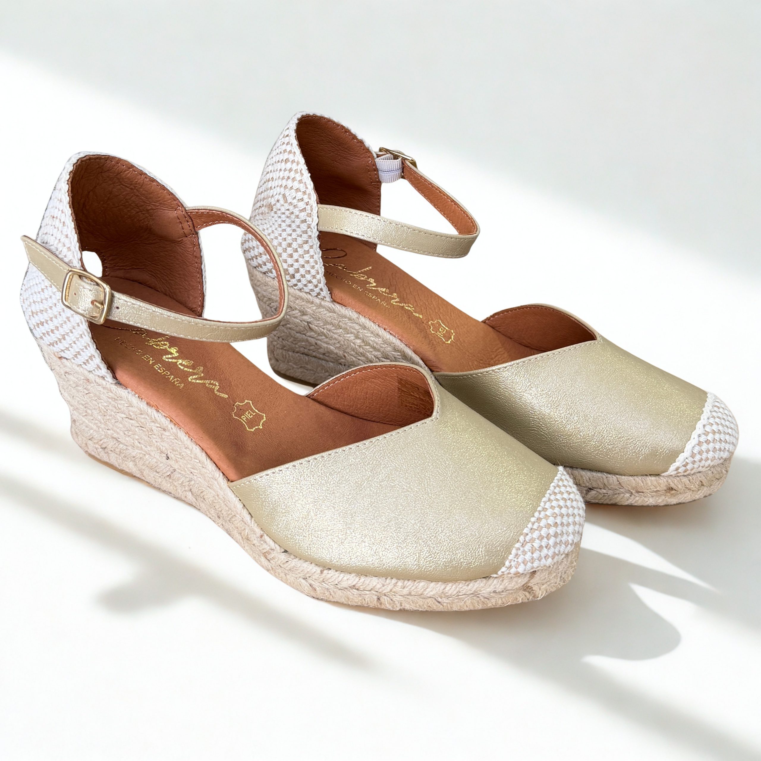 Alpargatas de Cabrera en piel color dorado. Escote en v. Cierre al tobillo con pulsera y hebilla regulable.Plantillas de piel acolchadas. Suela de goma antideslizante muy ligera y flexible. 100% fabricados en España con materiales de primera calidad.
