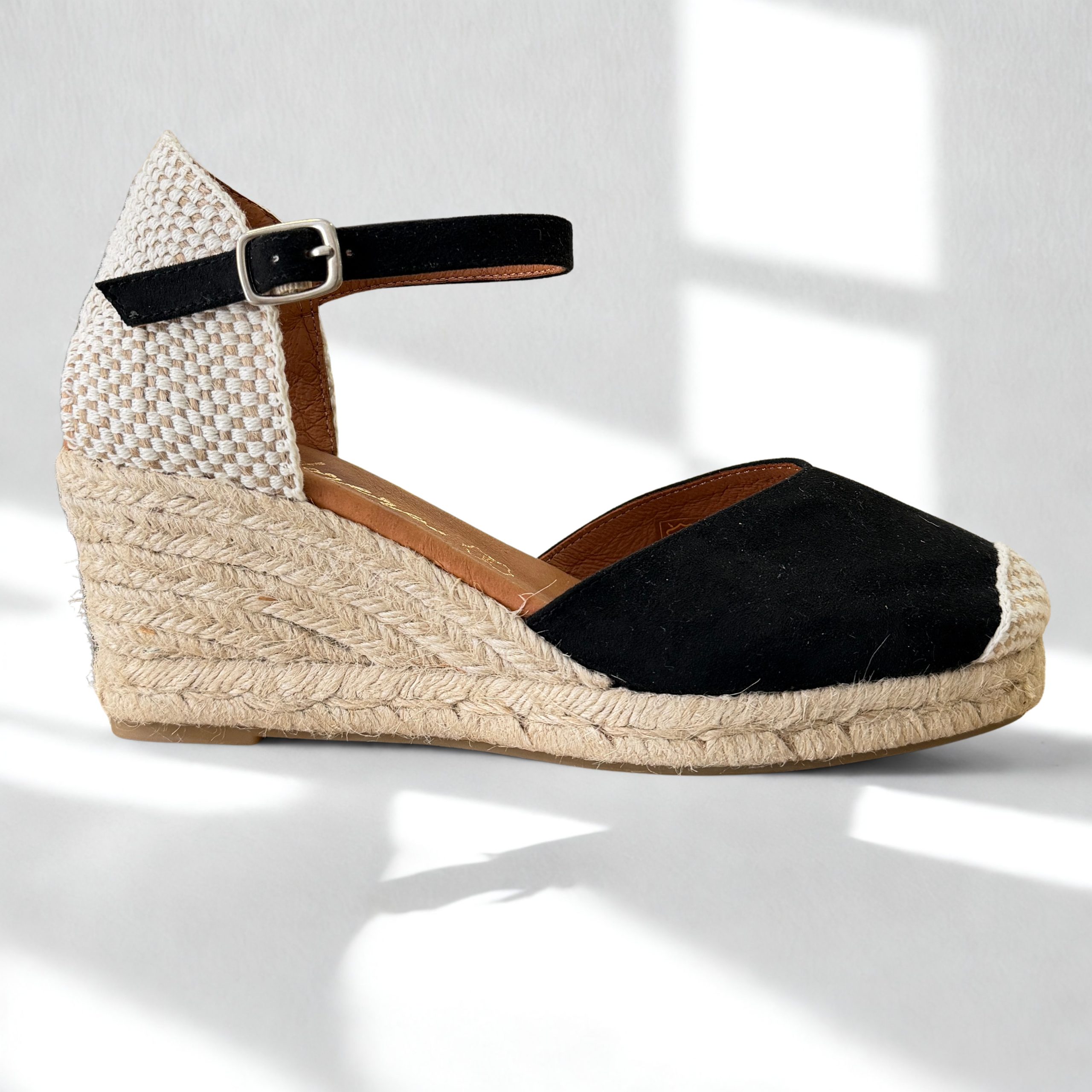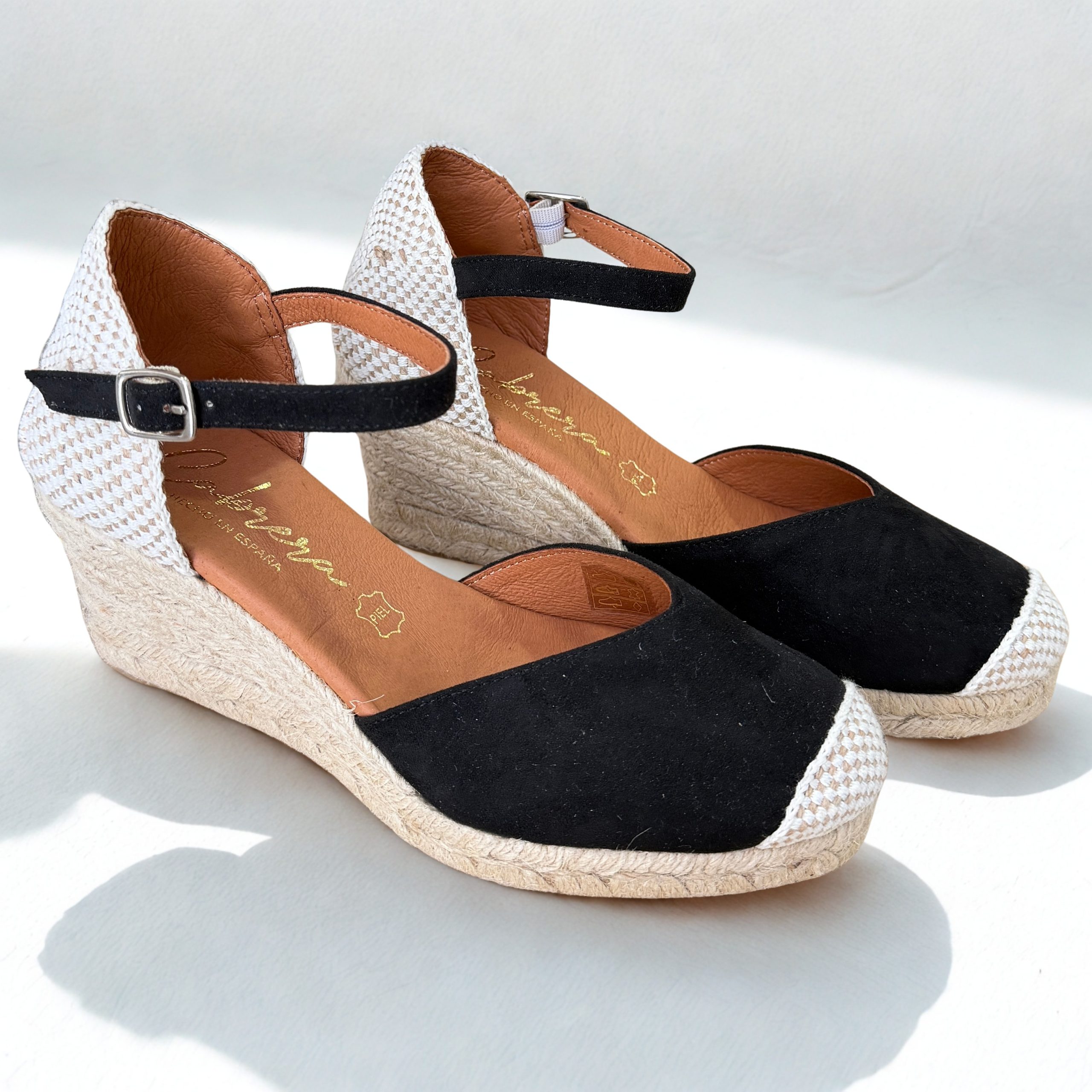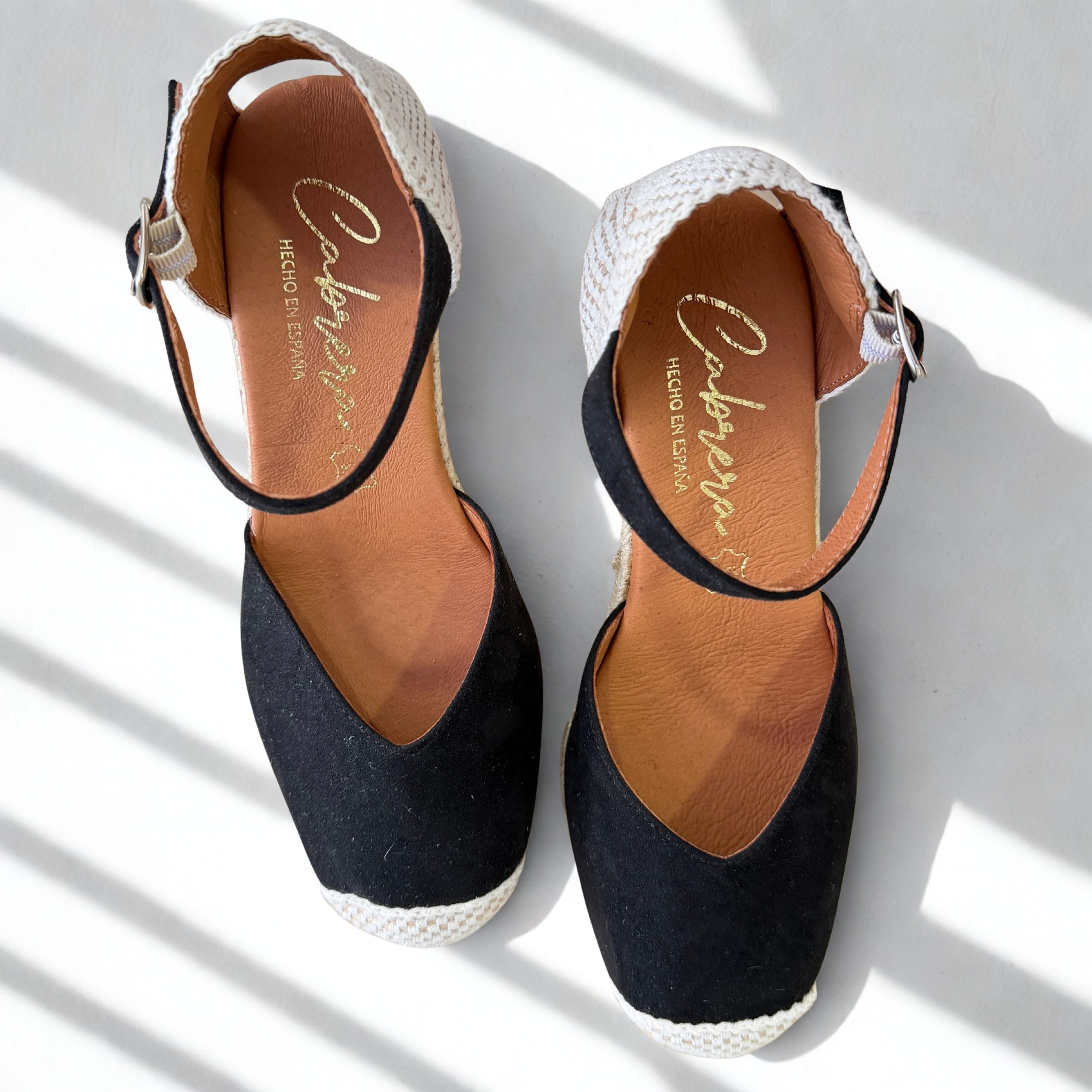 Alapargatas de Cabrera en serraje color negro. Escote en v. Abrochadas al tobillo con pulsera y hebilla regulable. Plantillas de piel acolchadas. Suela de goma antideslizante muy ligera y flexible. 100% fabricadas en España con materiales de primera calidad.