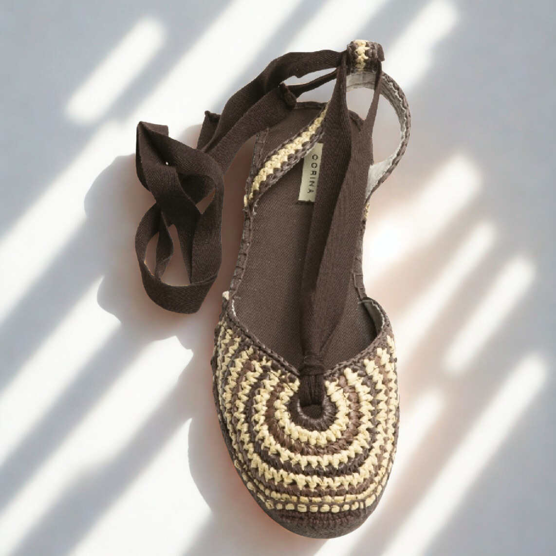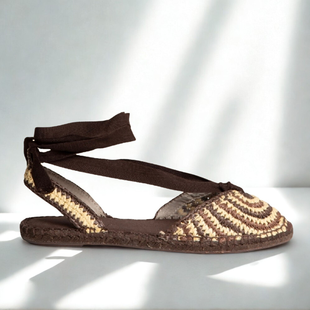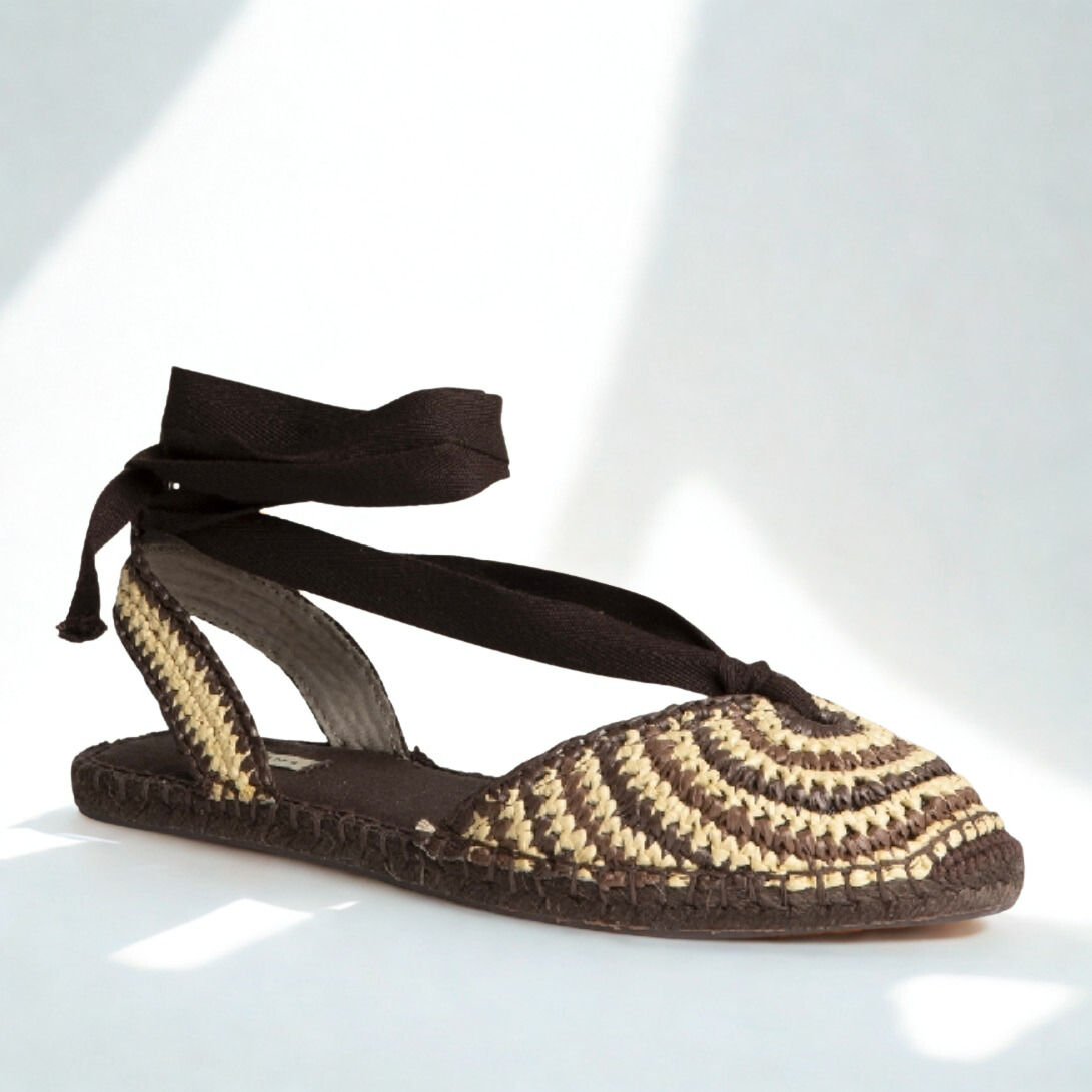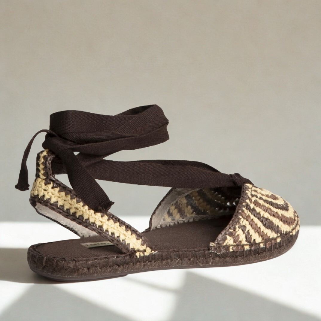 Alpargata de Corina en rafia en tonos marron y beige con cierre de lazada en chocolate, suela de goma antideslizante muy flexible.