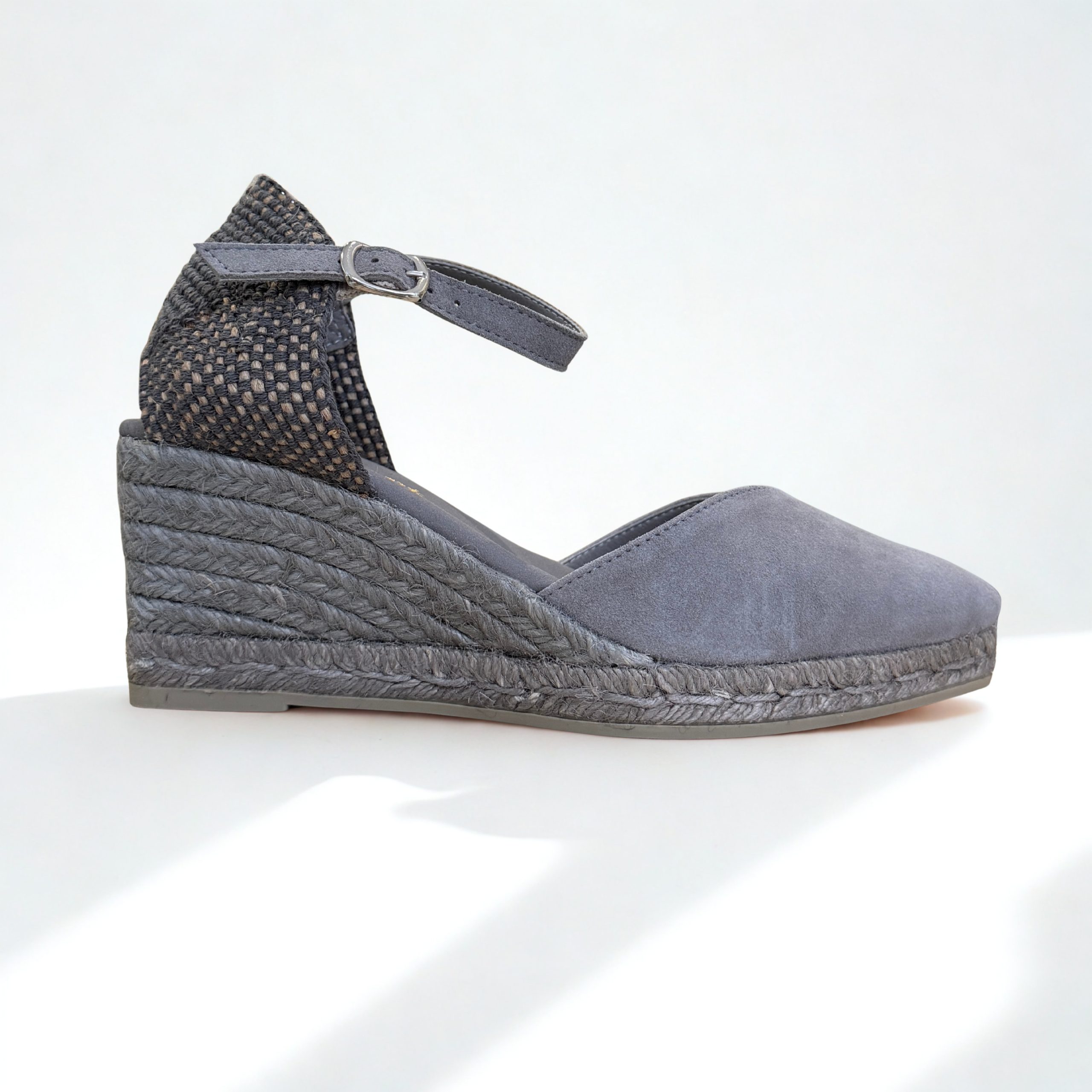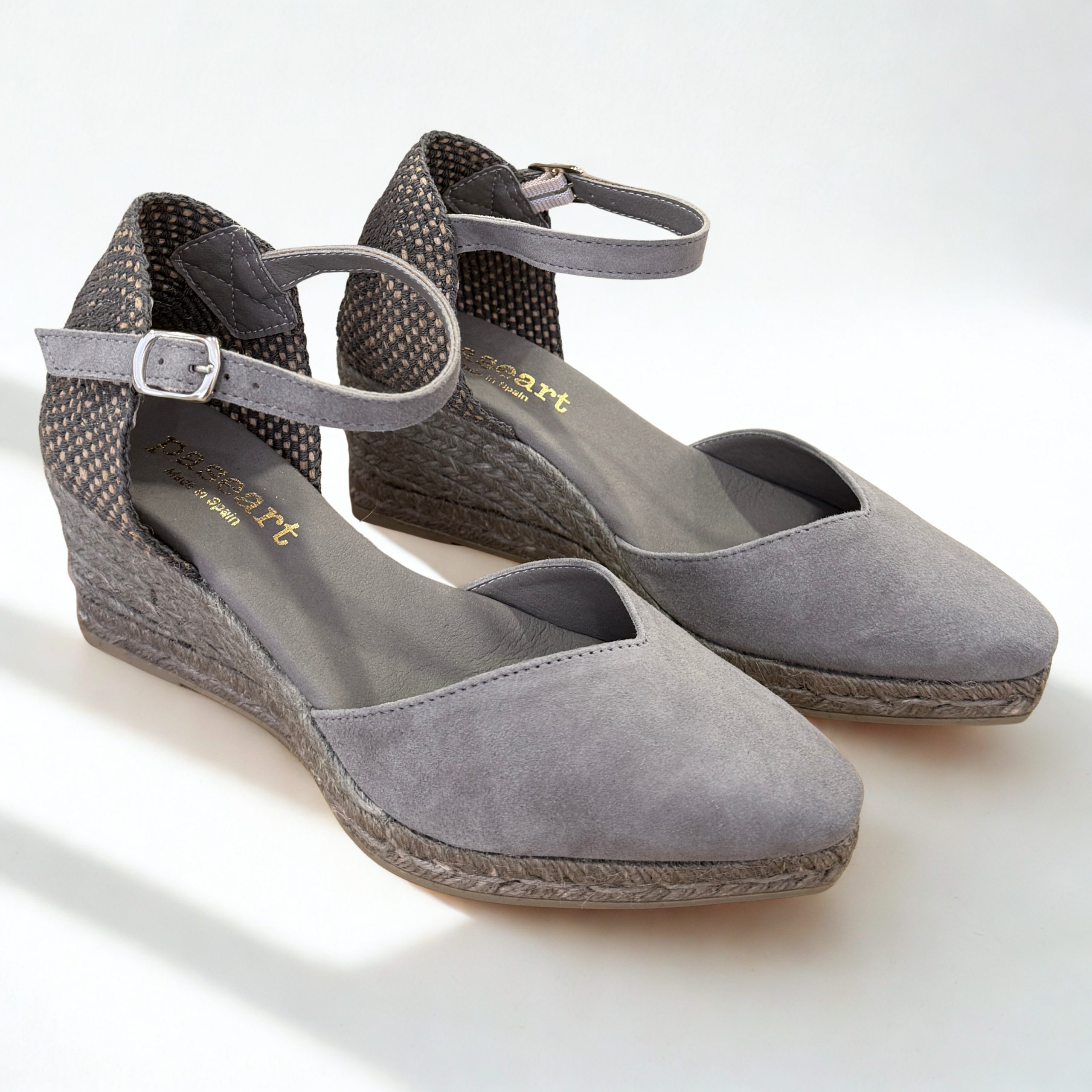 Alpargata de Paseart en piel de serraje color gris. Cierre con pulsera y hebilla al tobillo para una perfecta sujeción. Plantillas de piel acolchadas. Acabada en punta para estilizar la silueta. Cuña de yute a tono. Un modelo cómodo y sofisticado que no te quitarás en todo el verano.