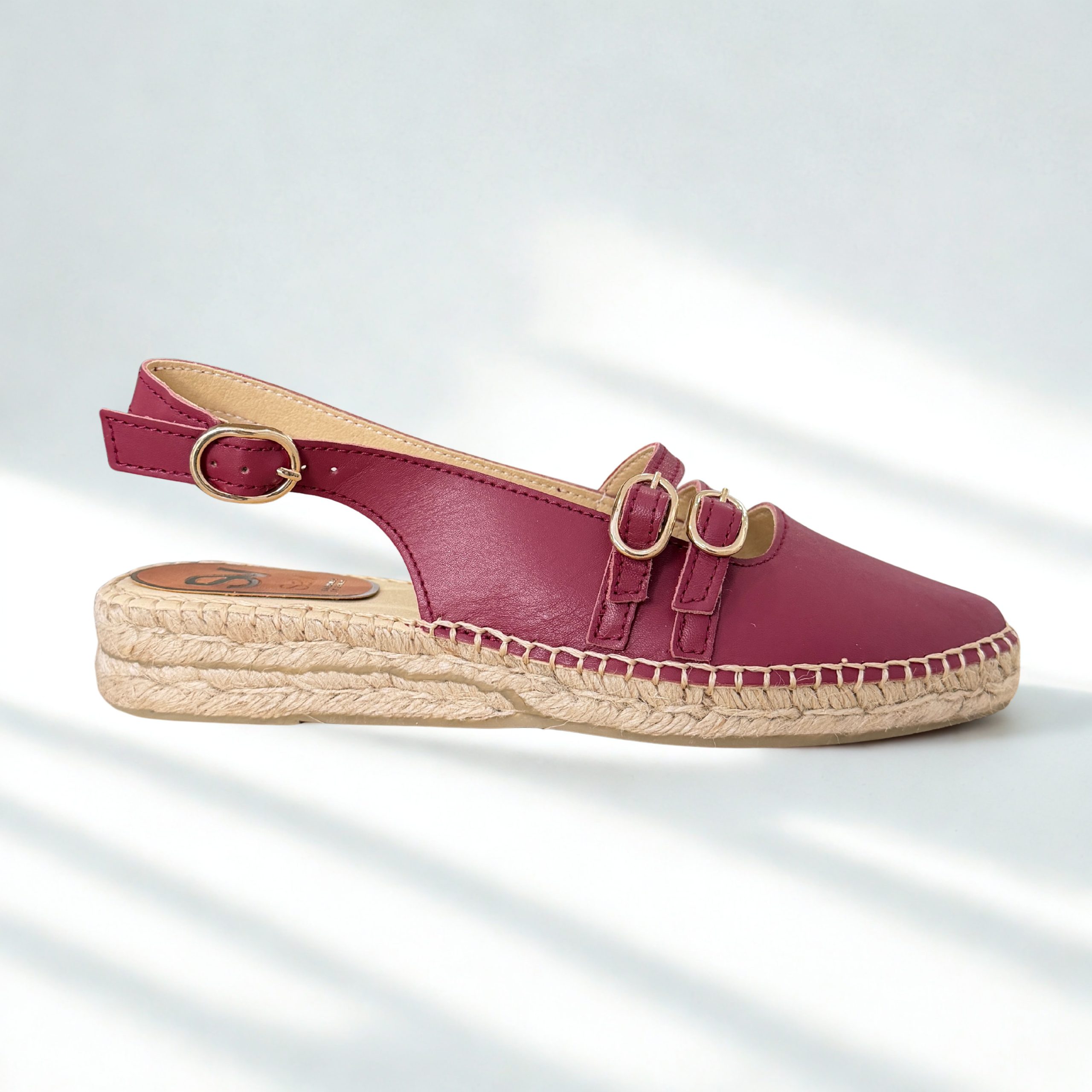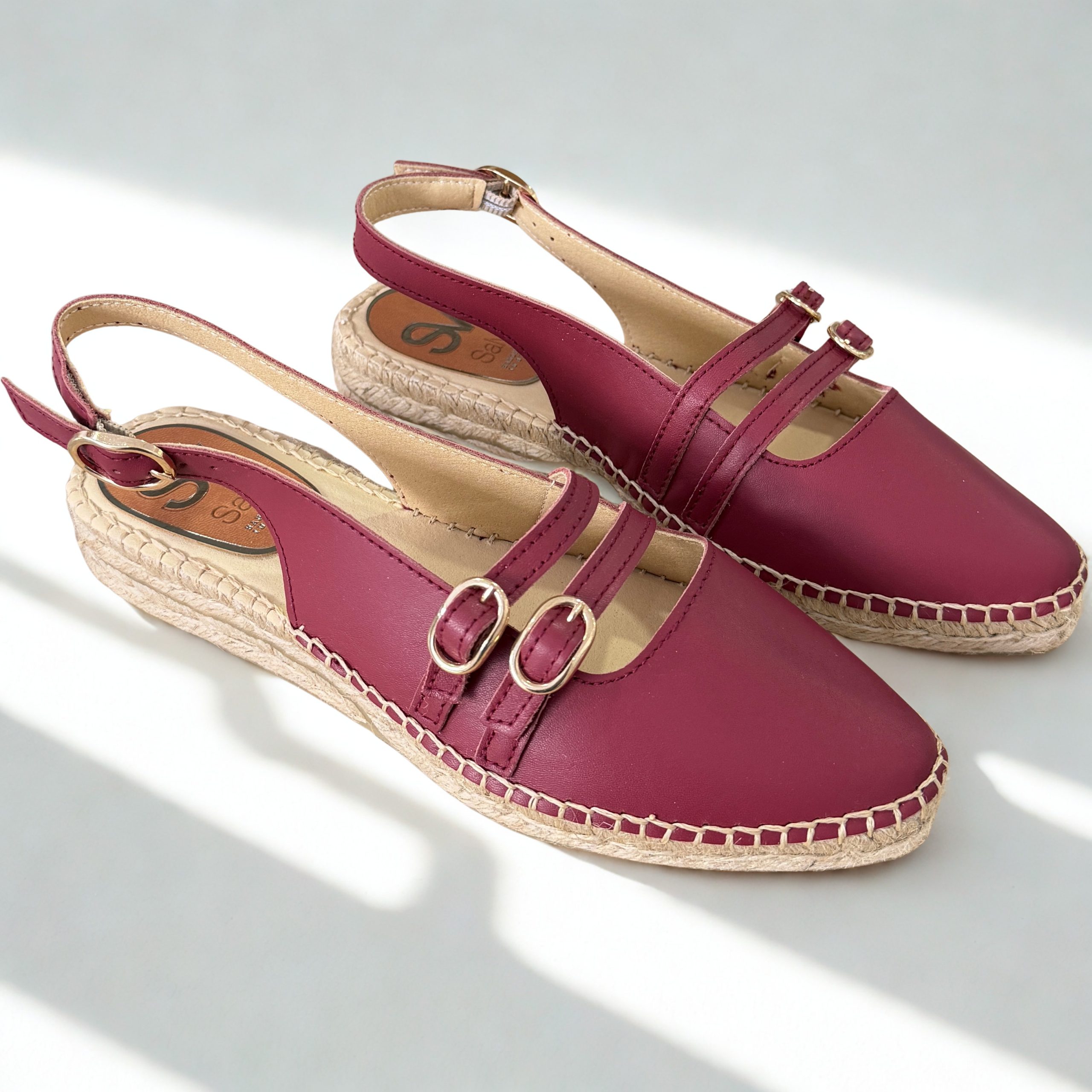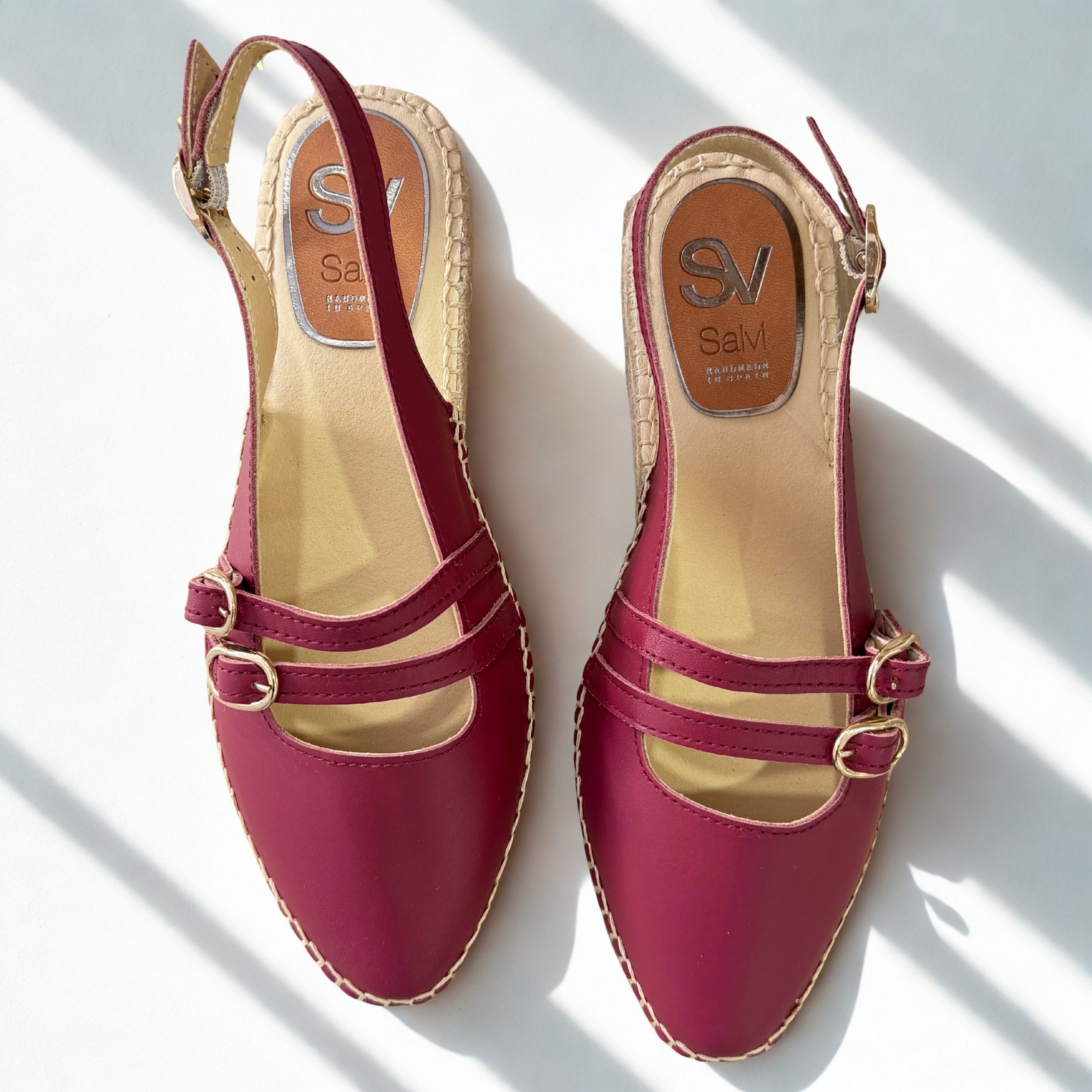 Alapargatas de Salvi en piel color cereza. Se adapatan al pie con suavidad y ligereza. Fabricadas con una piel muy suave y suela de yute muy flexible. Plantillas de piel acolchadas que aportan un toque extra de comodidad. Tira elástica en la parte trasera para un ajuste perfecto. Hebillas en el empeine regulables. 100% fabricadas en España de manera artesanal con matriales naturales y transpirables.