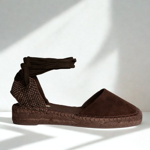 Alpargata de Corina en color chocolate, fabricada en tejido de antelina. Esparto a tono. Atada a la pierna con lazada a tono.