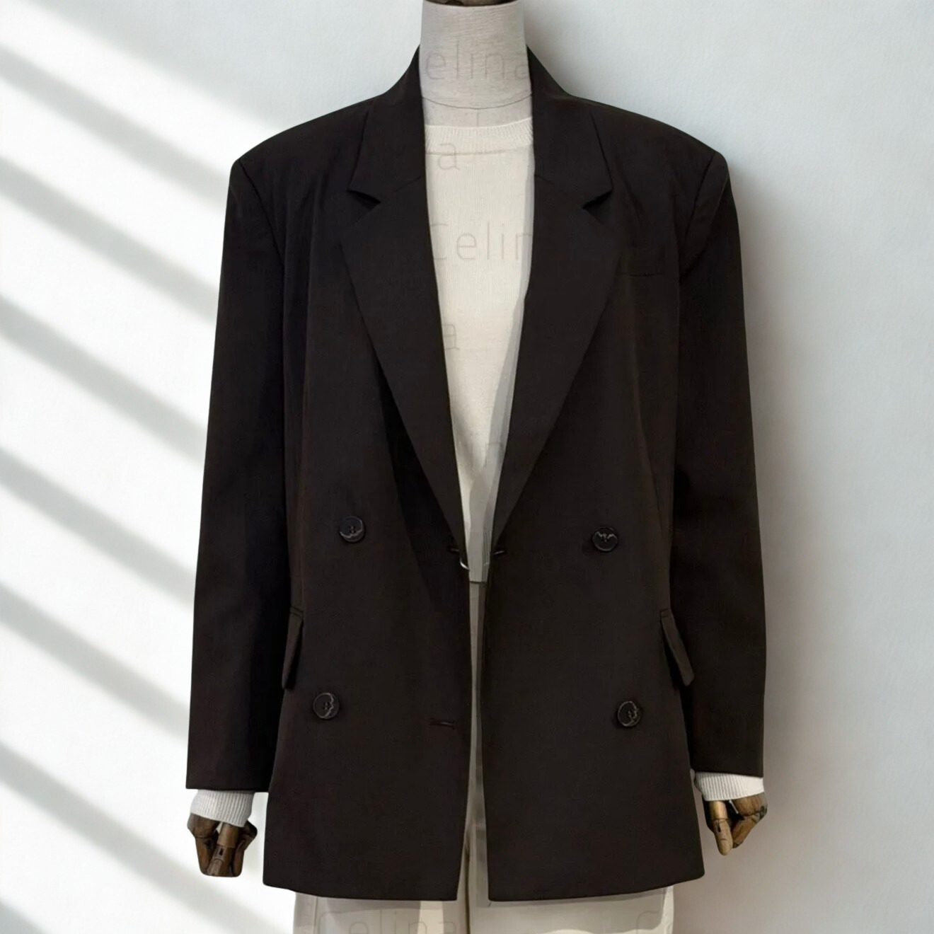 Bazer en color chocolate de corte oversize, cruzada en la parte delantera, cierre con botones a tono. Forro interior.