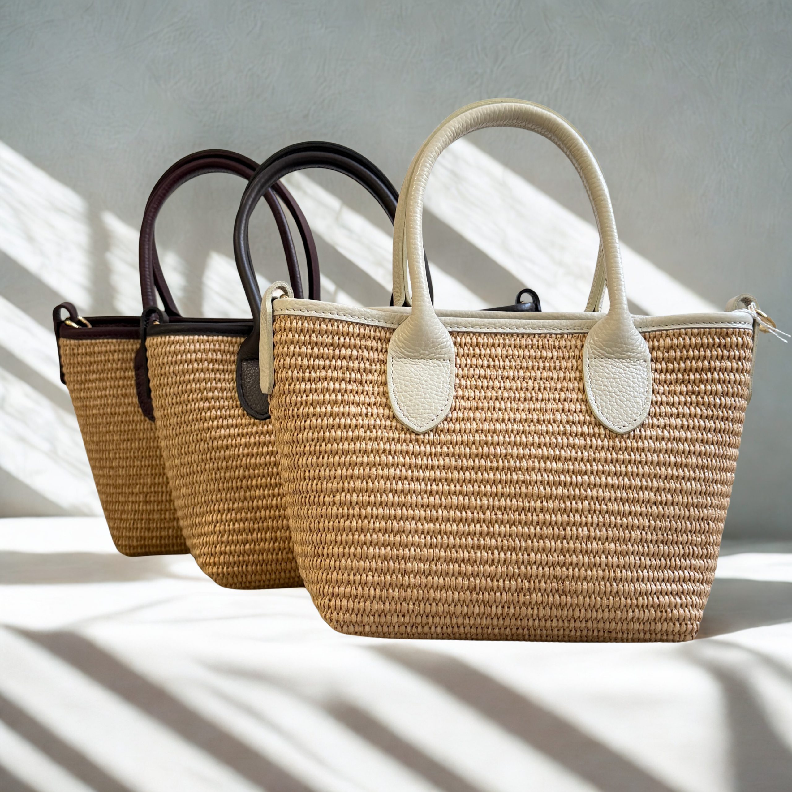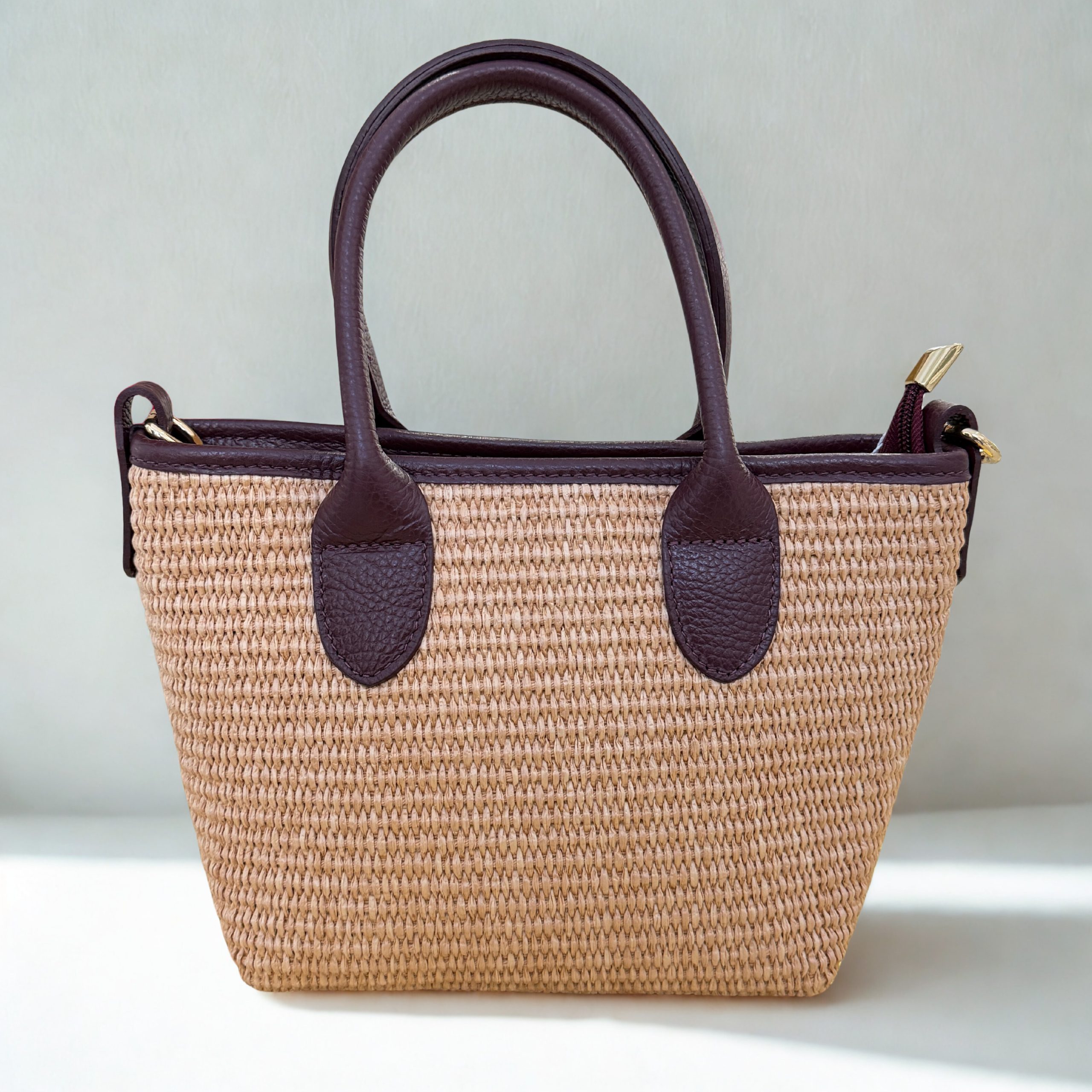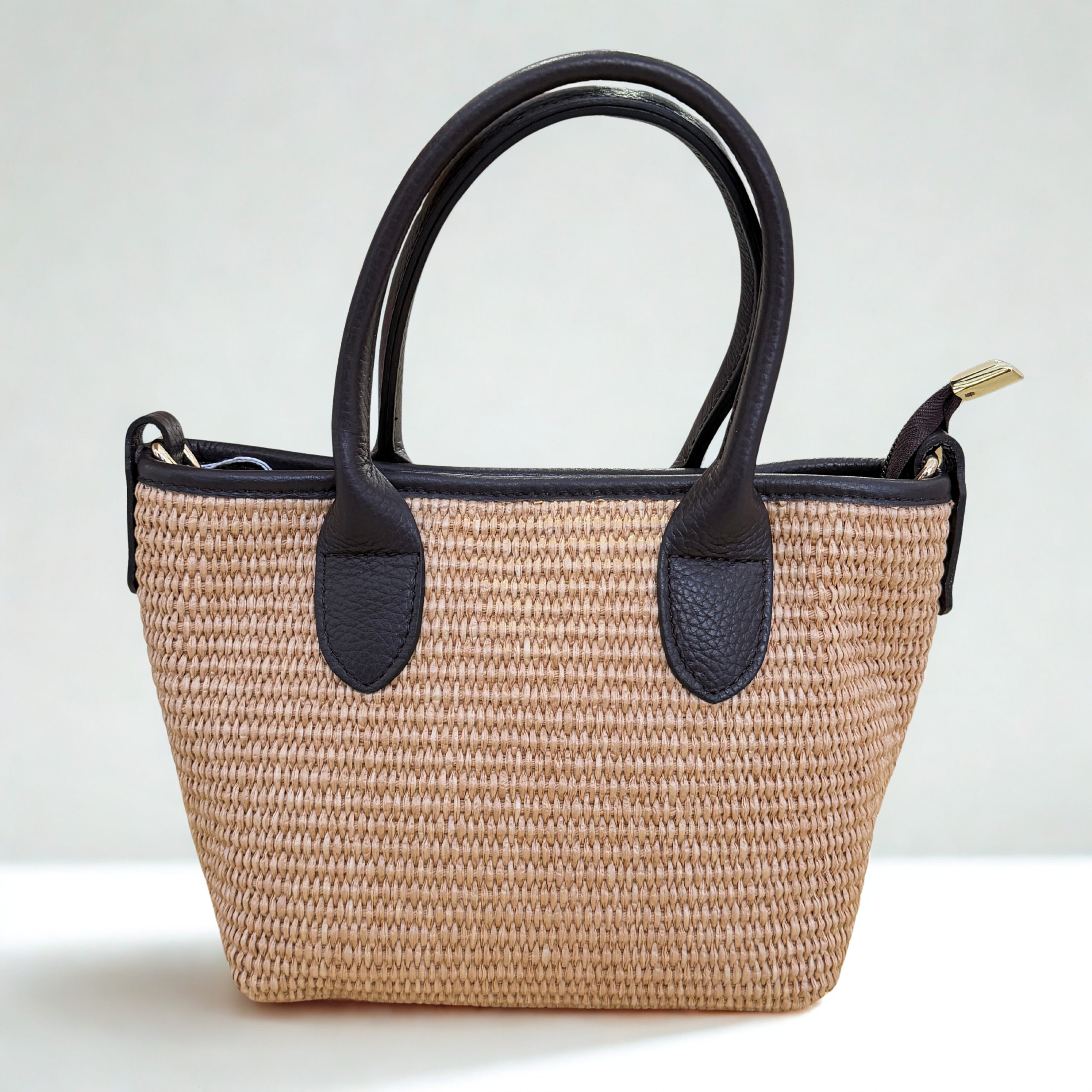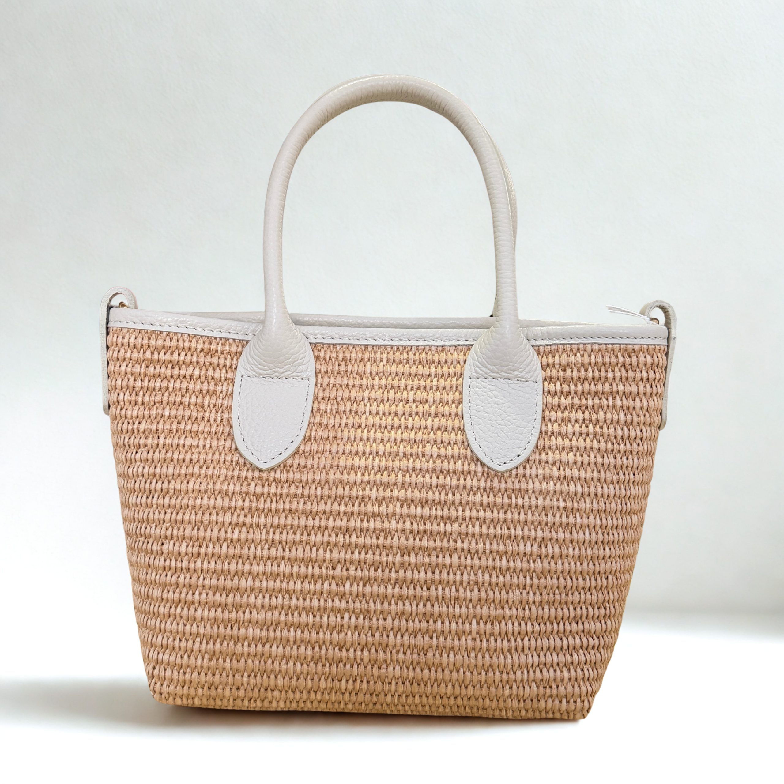 Bolso de rafia combinado con piel, incluye asa corta y asa larga de piel a tono regulable. Cierre con cremallera. Forro interior textil. Bolsillo interior.