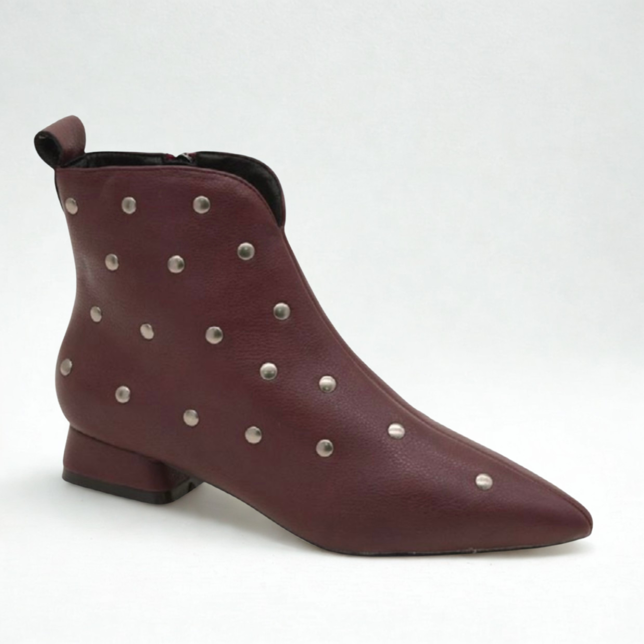 Botín de Azarey en color burdeos con adorno de tachas. Acabado en punta que estiliza la pierna. Forro interior, plantillas acolchadas. Cremallera lateral para facilitar su puesta.