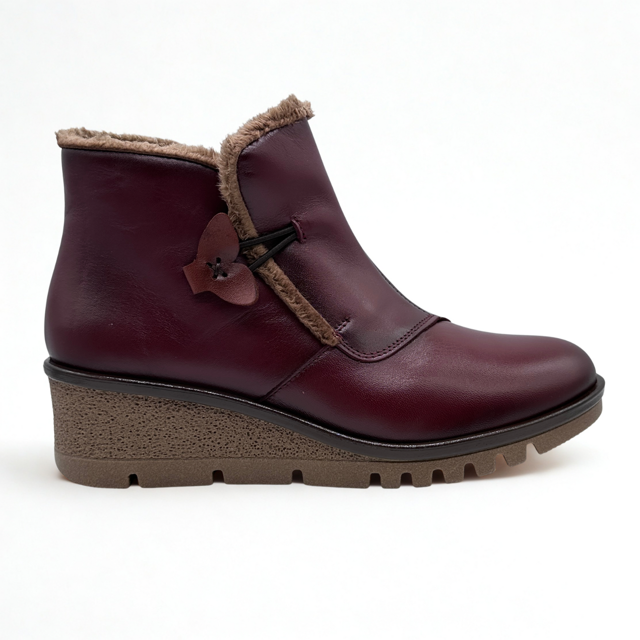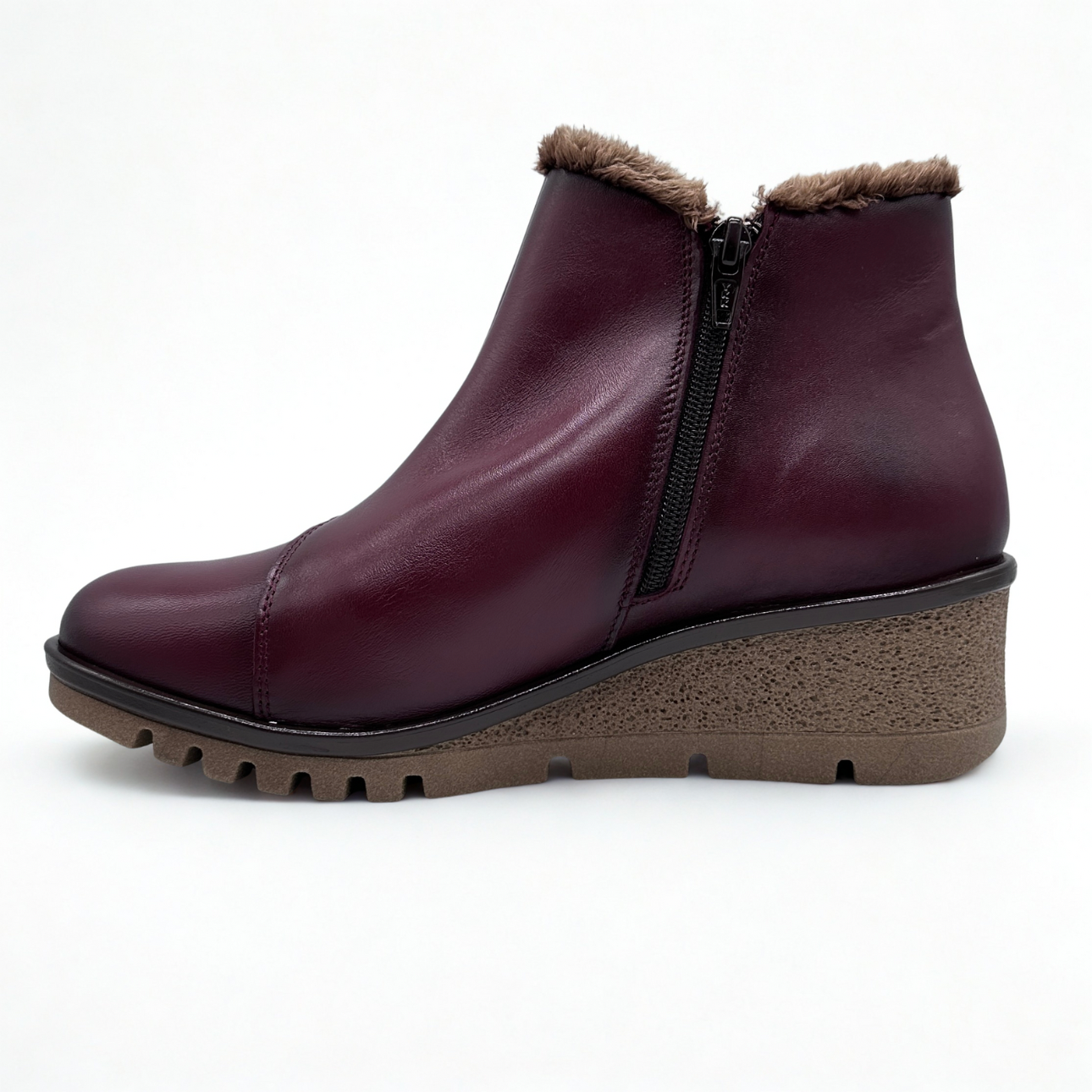 Botín de Doctor Cutillas en piel color burdeos, forro interior de pelito, cierre con cremallera lateral en la parte interior. Plantillas de piel acolchadas extraíbles. Suela de goma antideslizante muy ligera y flexible.