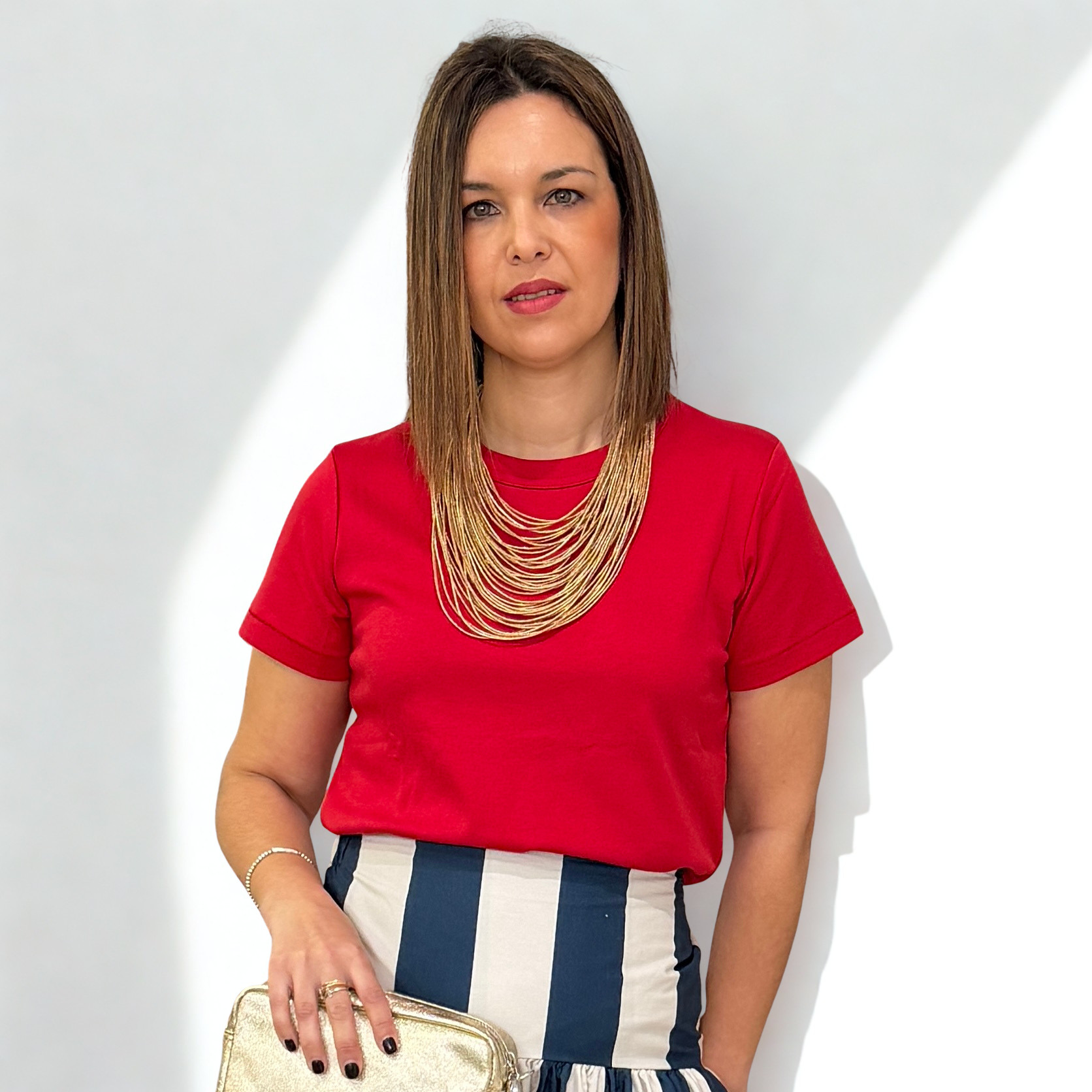 Camiseta básica de algodón con cuello redondo y manga corta.
