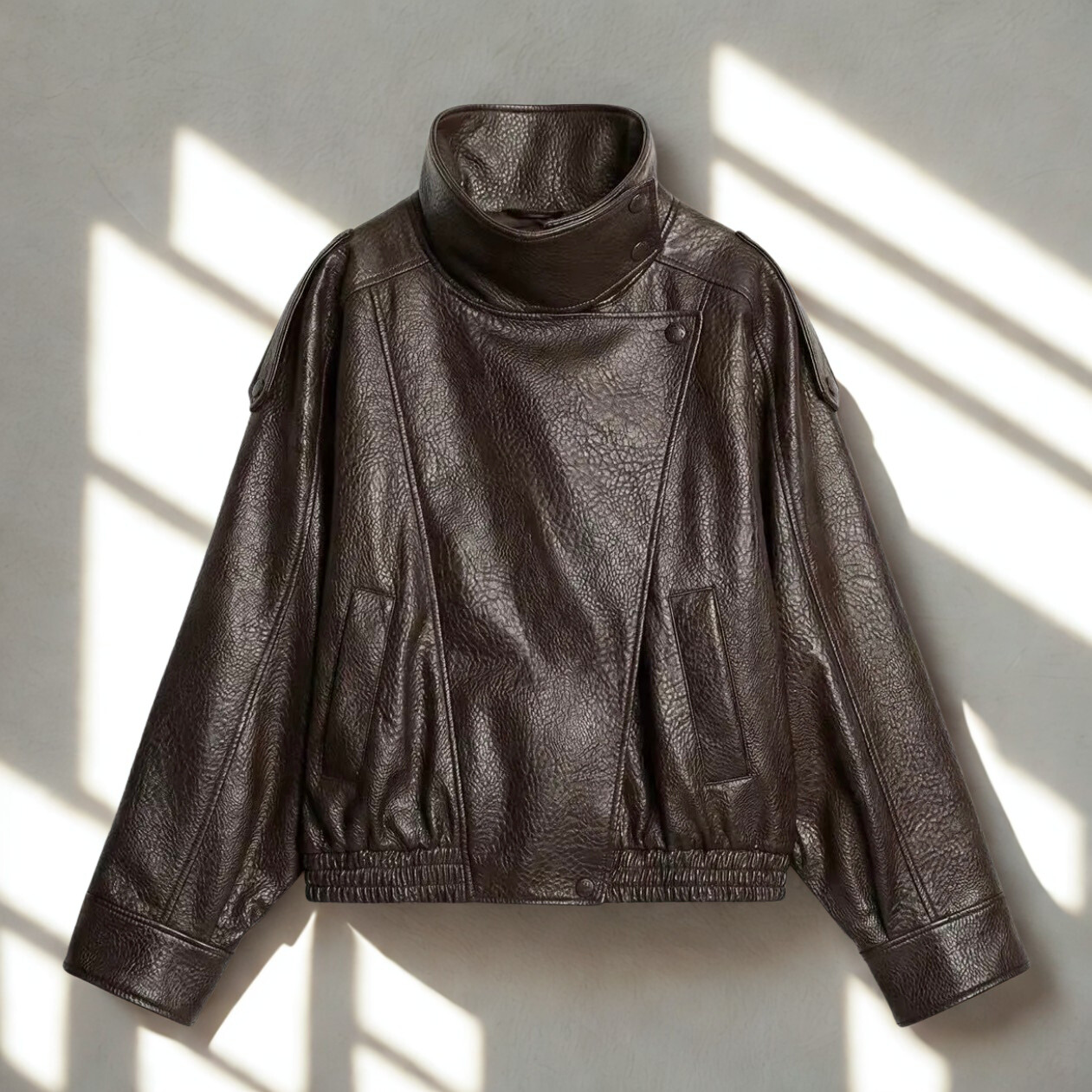 Cazadora de polipiel en color marrón chocolate, corte oversize. Cierre con cremallera y corchetes. Forro interior y bolsillos laterales.