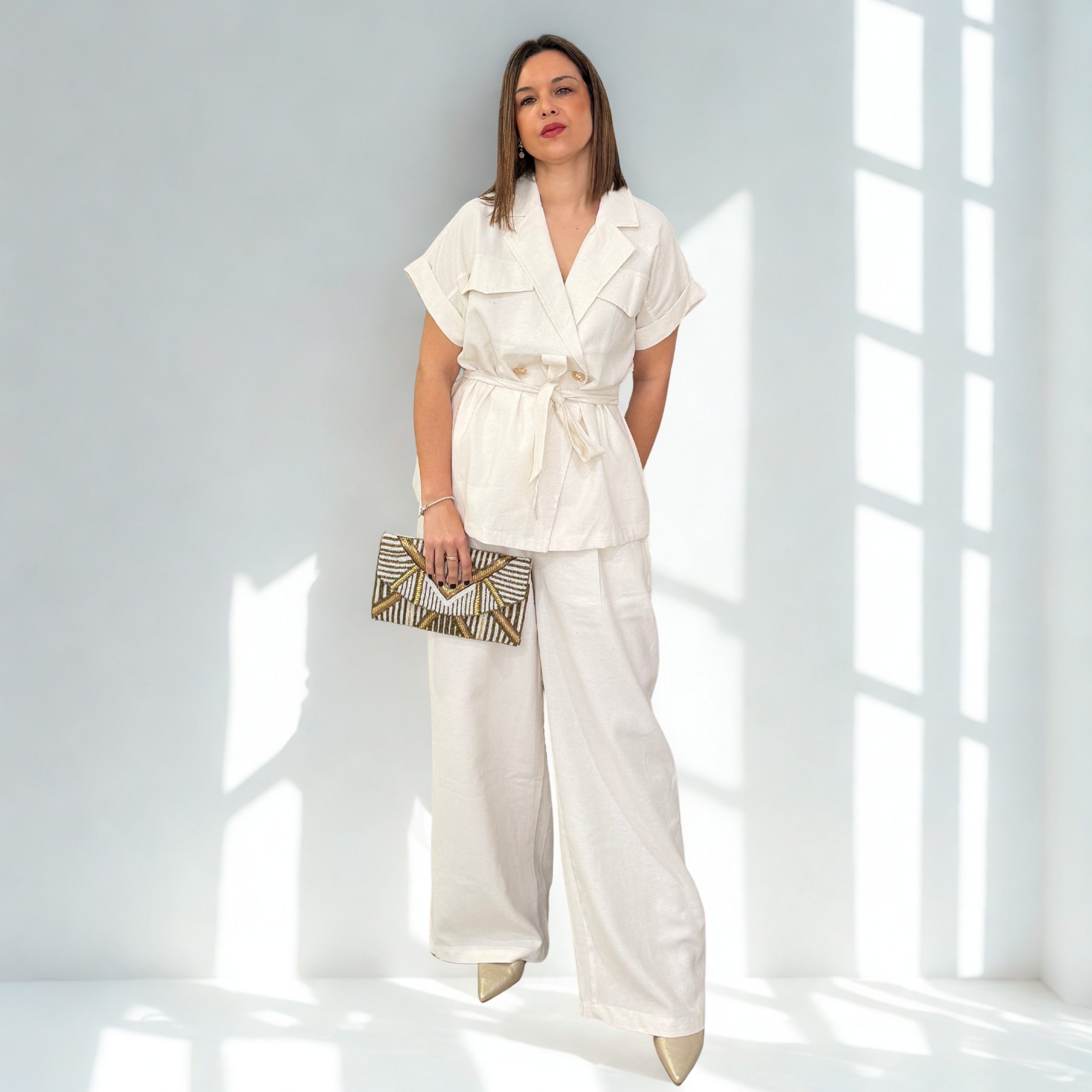Conjunto de lino en color blanco roto compuesto por pantalón ancho con bolsillos laterales cierre con botón en la parte delantera y goma en la parte trasera. Chaqueta de manga corta cruzada y botones dorados. Incluye cinturón.