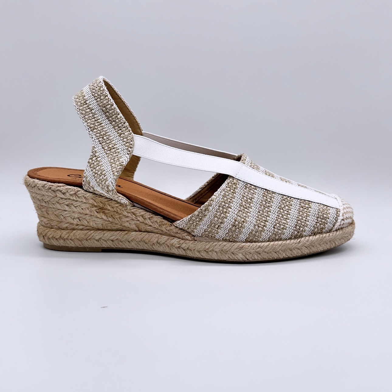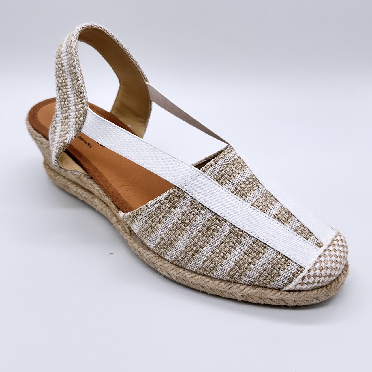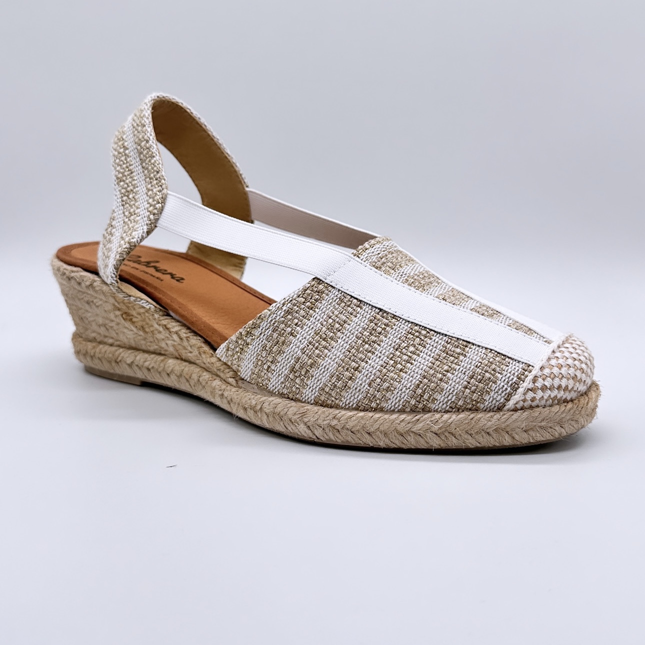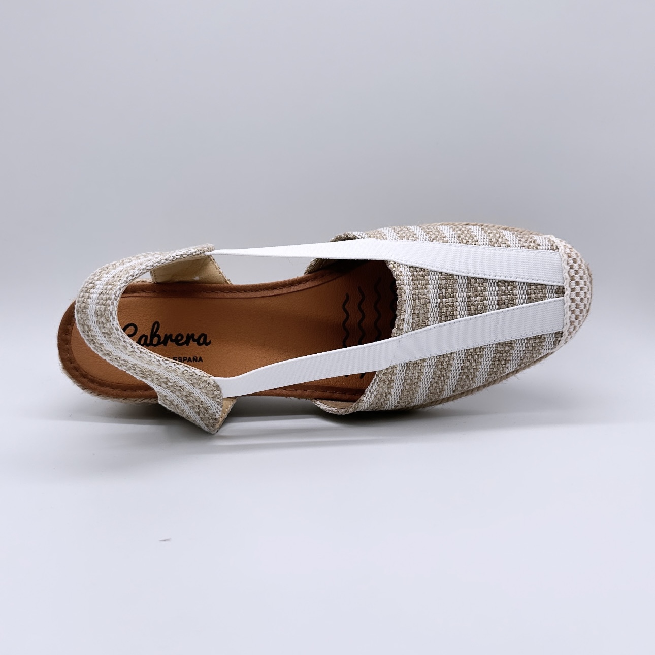 Cuña de Cabrera en lona color beige y dorado con goma para ajustar al pie en color beige. Plantillas de piel y suela de goma muy ligera y flexible. 100% fabricadas en España.