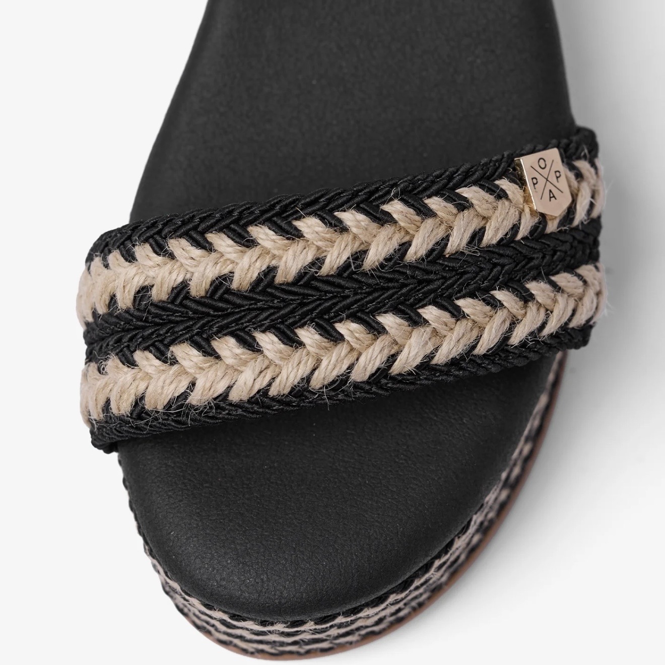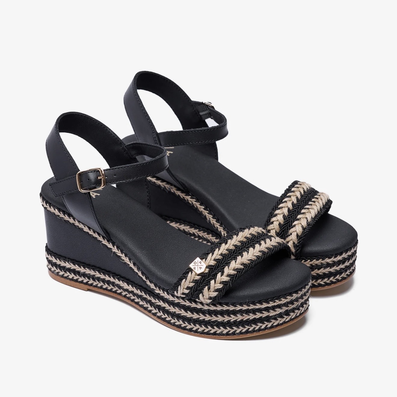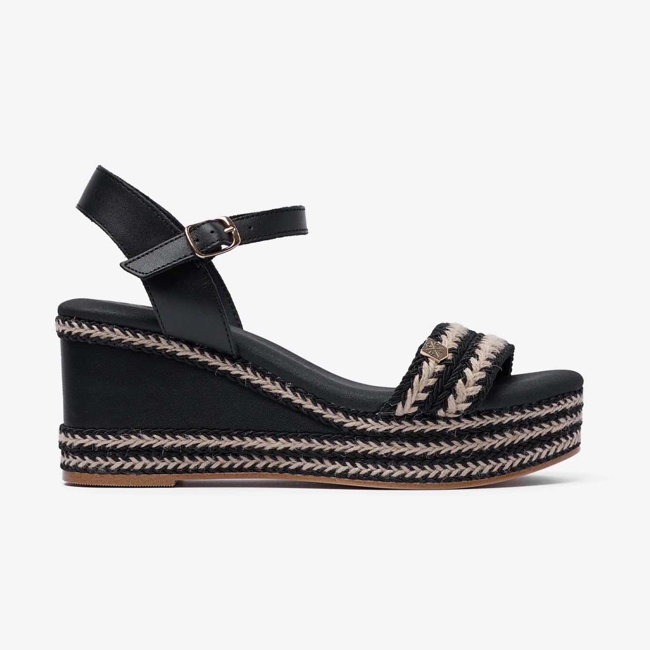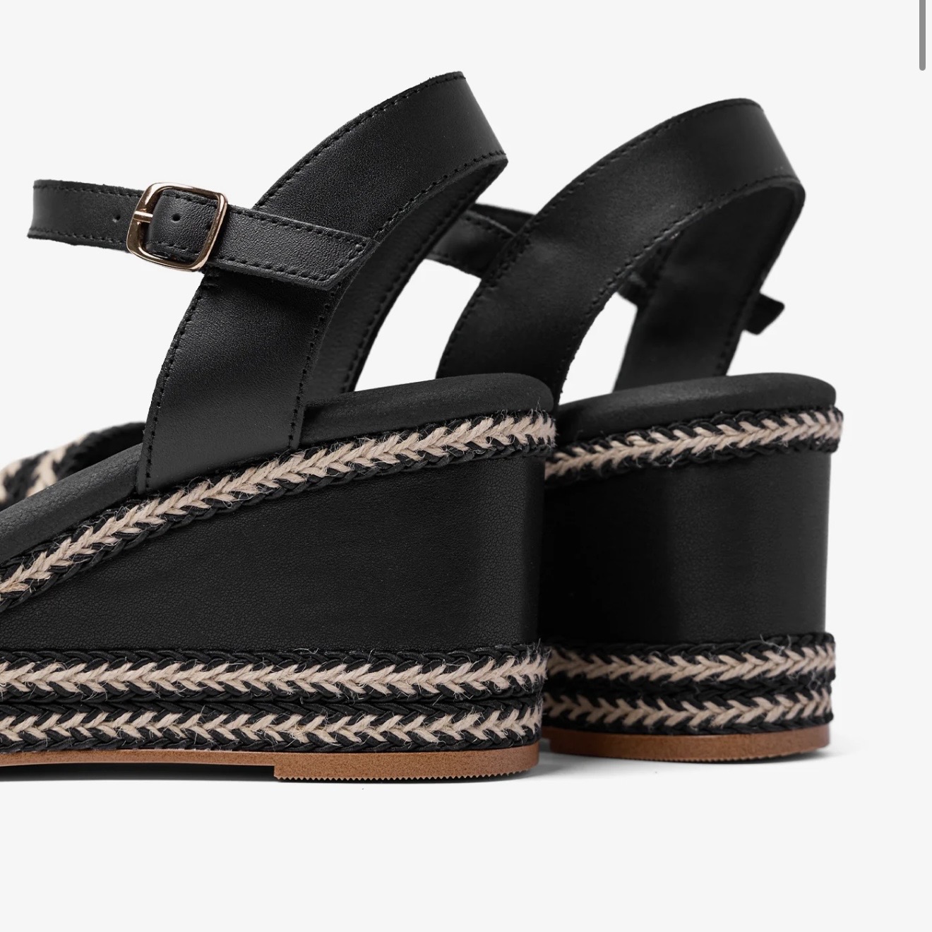 Cuñas de Popa en piel color negro combinado con yute. Cierre al tobillo con hebilla regulable. Piso de corcho ultra ligero. Plantillas de piel alcolchadas.