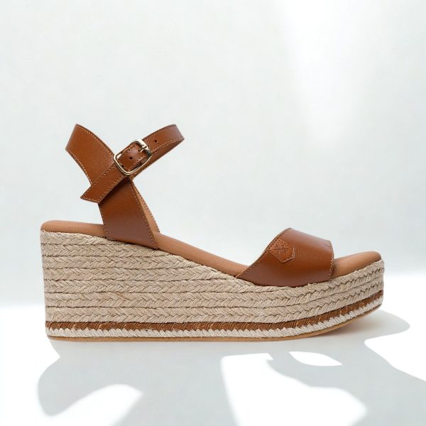 Cuña de Popa en piel color cuero, plantillas de piel acolchadas. Cierre al tobillo con hebilla regulable. Piso de corcho ultra ligero con acabado efecto yute.