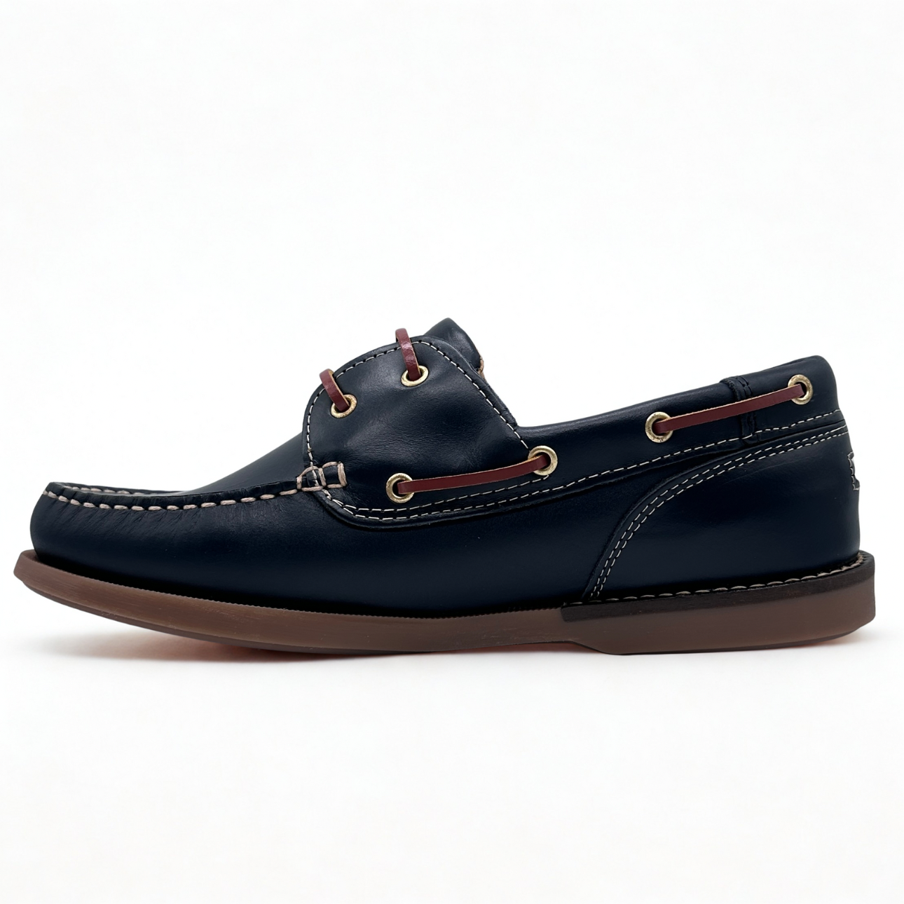 Naútico de Suave By Leyland en piel color azul marino, corte clasico. Cierre de cordones de piel en color cuero. Suela de goma antideslizante.