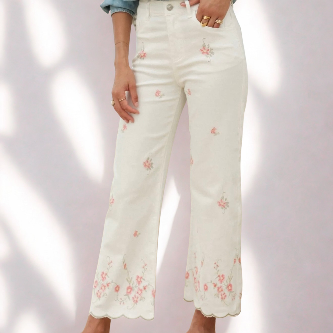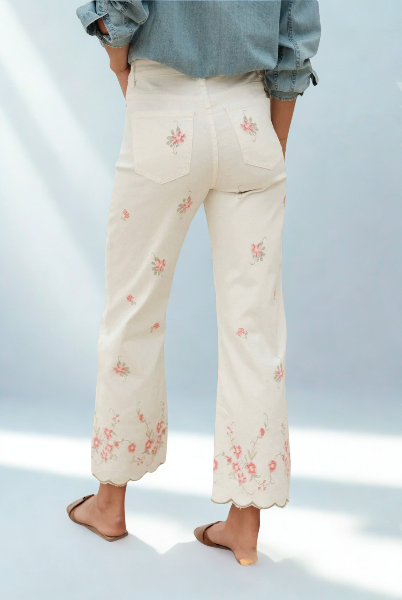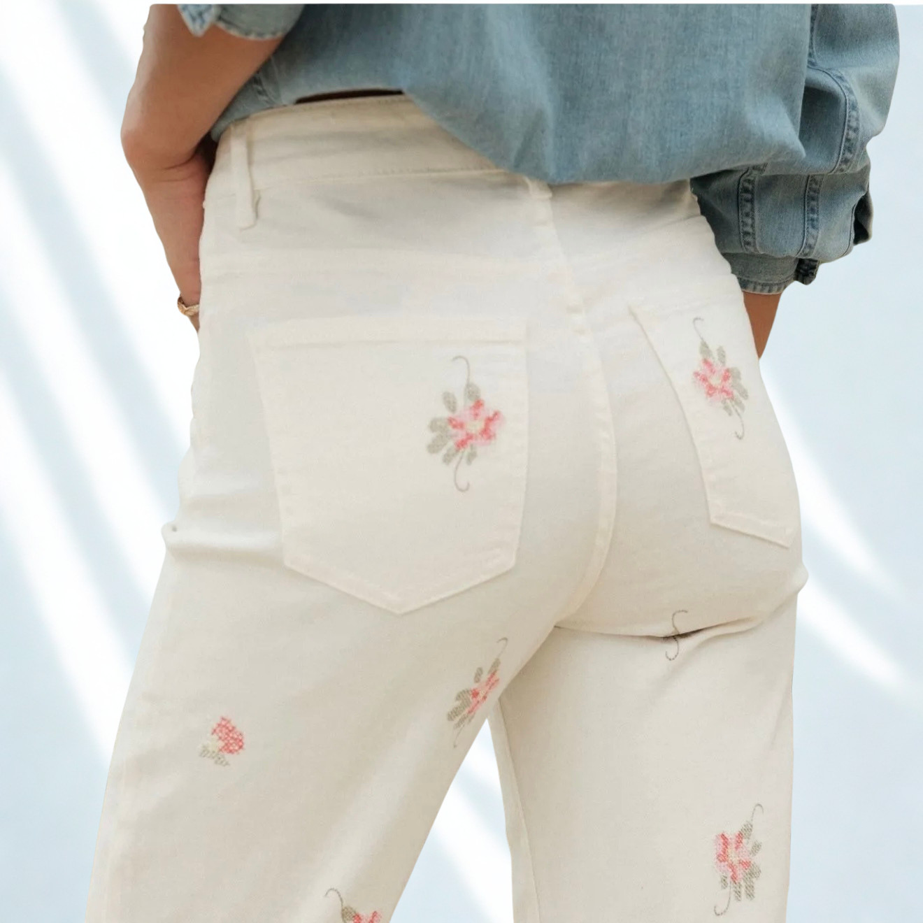 Pantalón tejano en color blanco con flores bordadas en tonos rosa y verde. Cierre con cremallera y botón. Bolsillos delanteros y trseros.