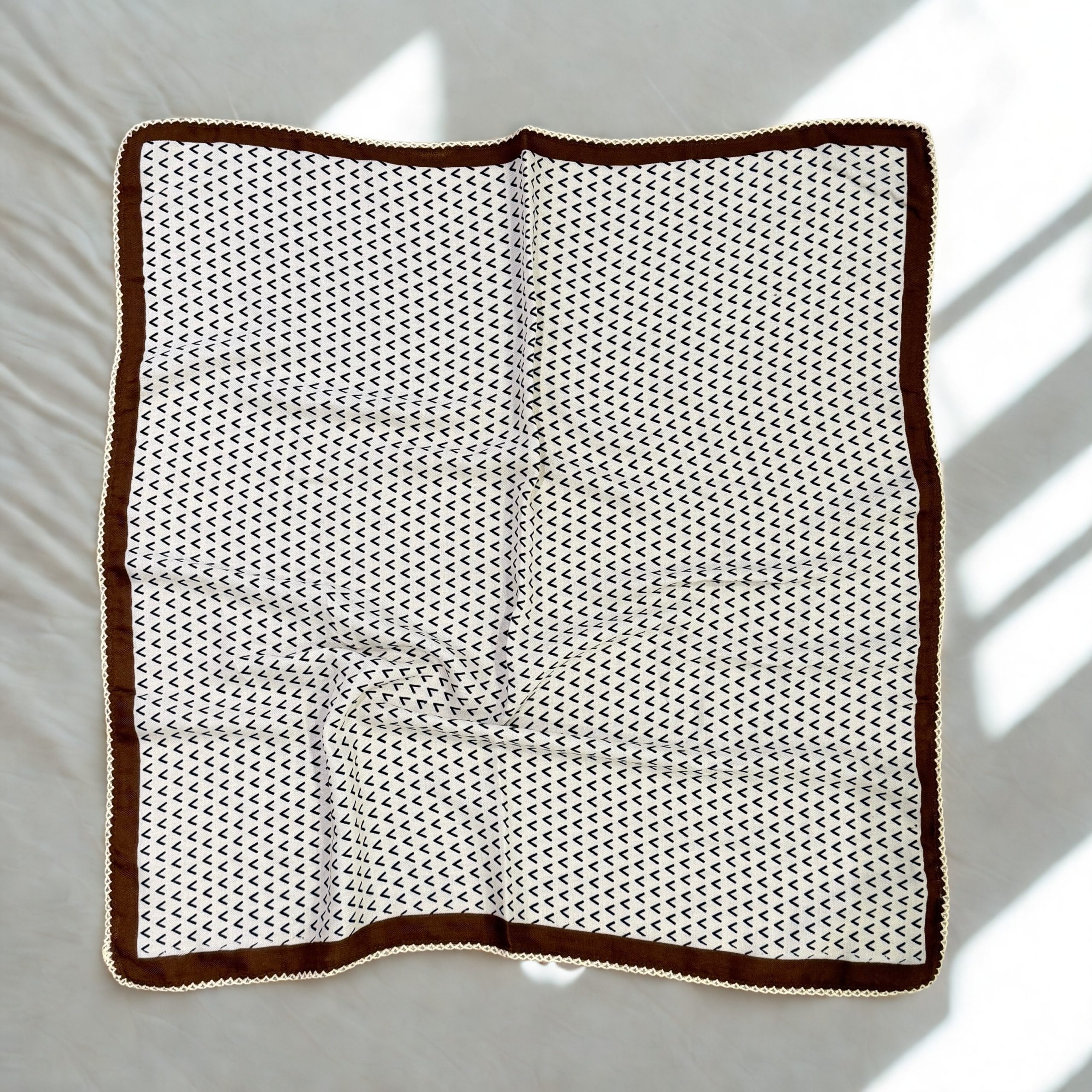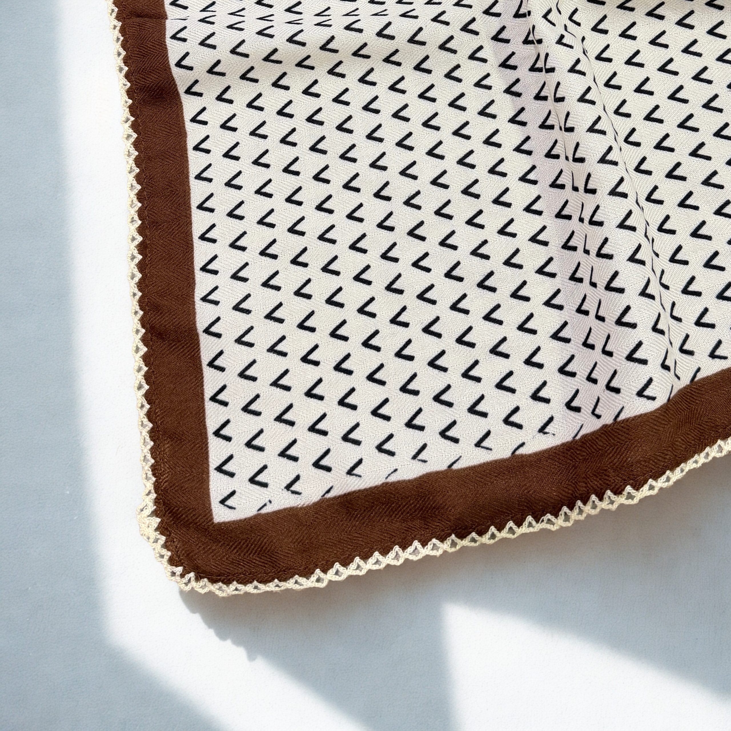Pañuelo estampado en color beige con destalles en negro y marrón chocolte.