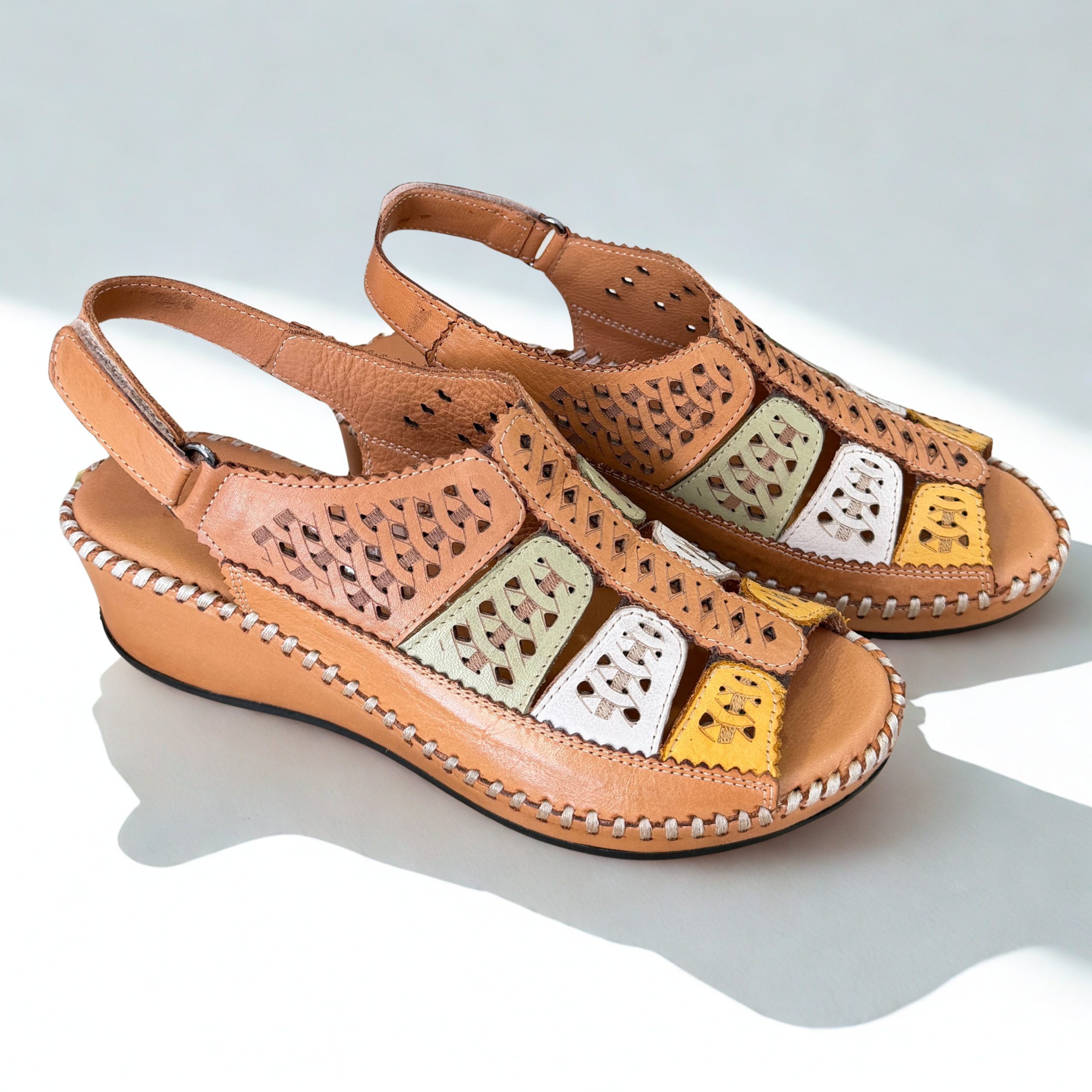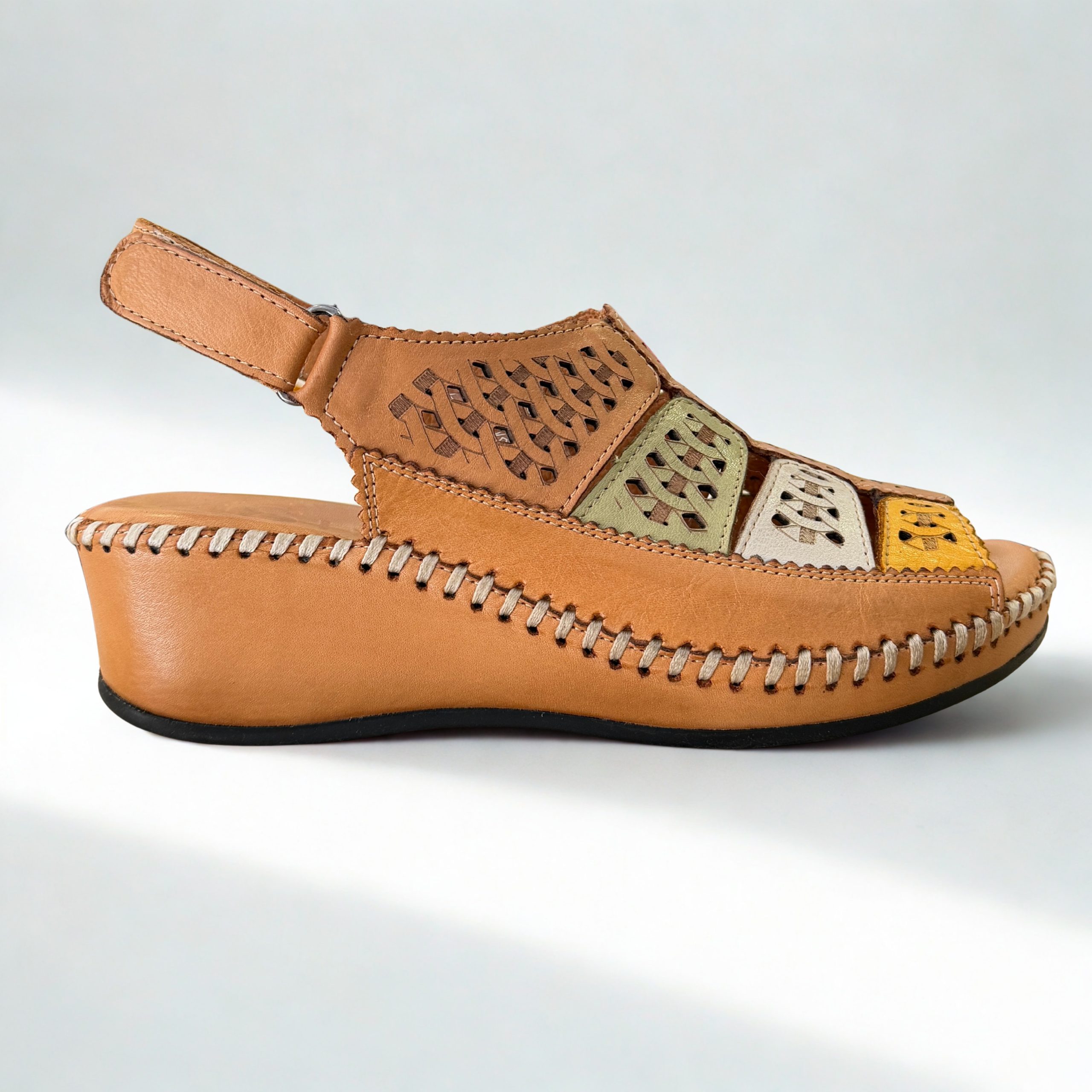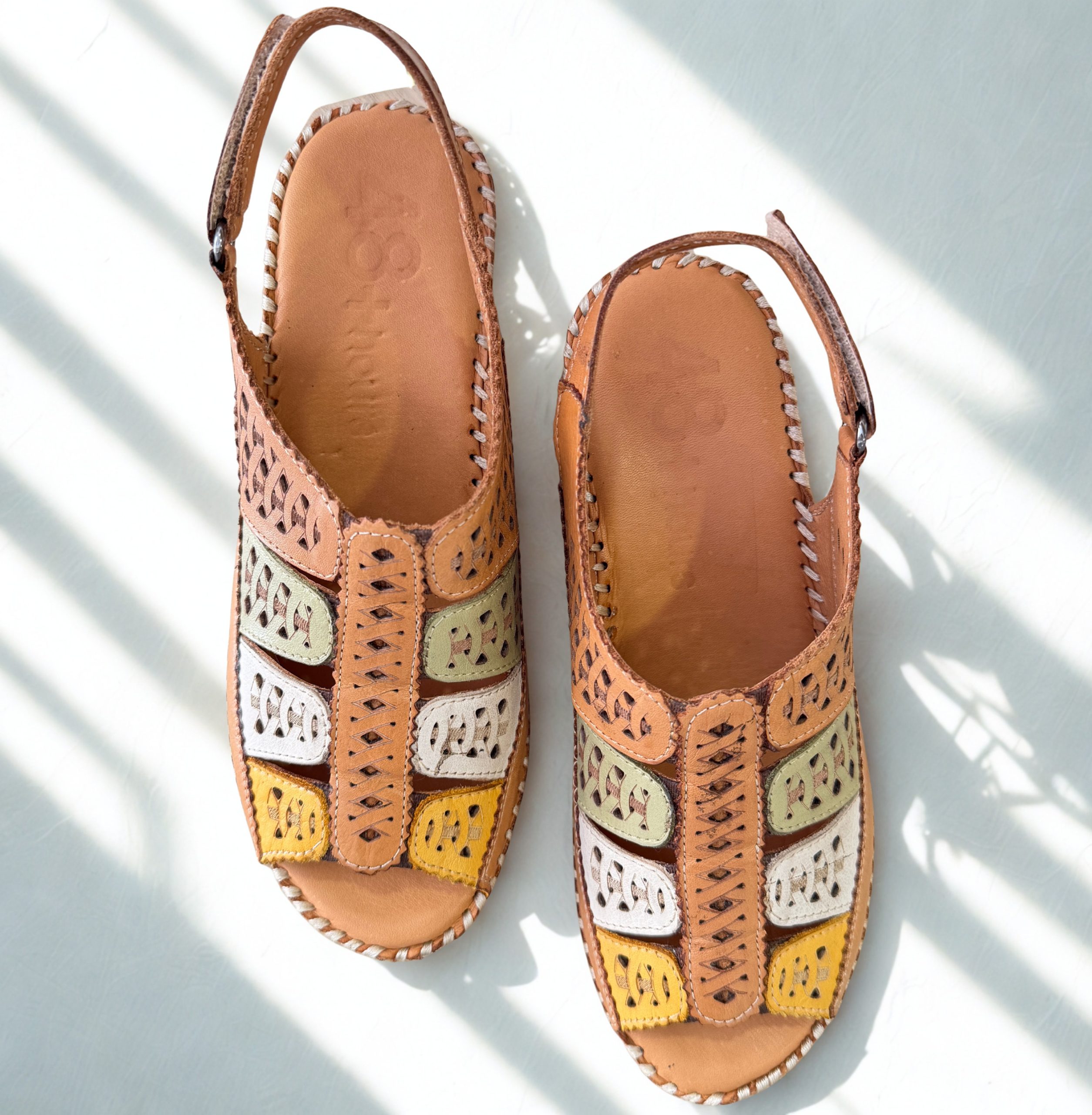 Sandalia de 48+Hours fabricada en piel color cuero con combinación de colores. Cierre al talón con velcro para facilitar su puesta. Plantillas de piel acolchadas. Suela de goma antideslizante muy ligera. Máxima comodidad.