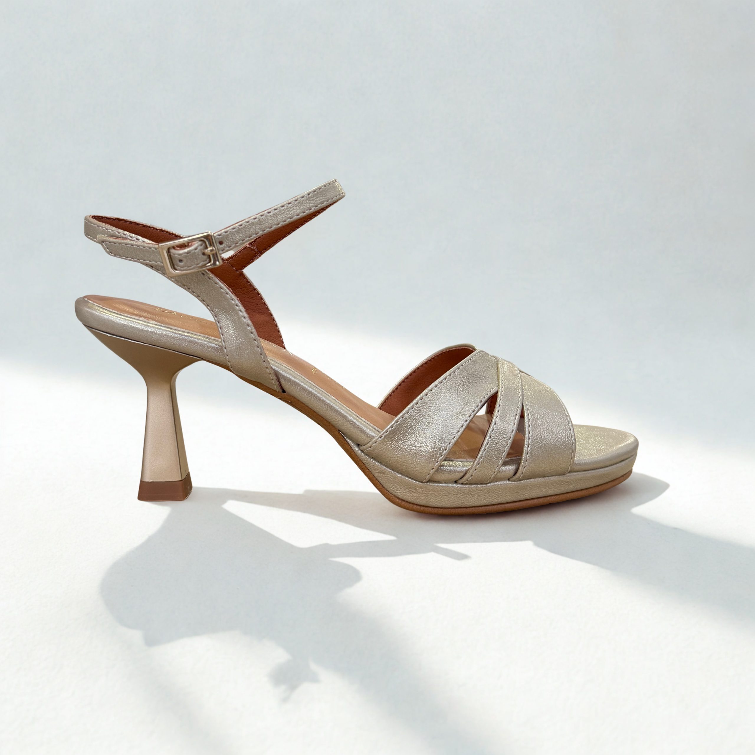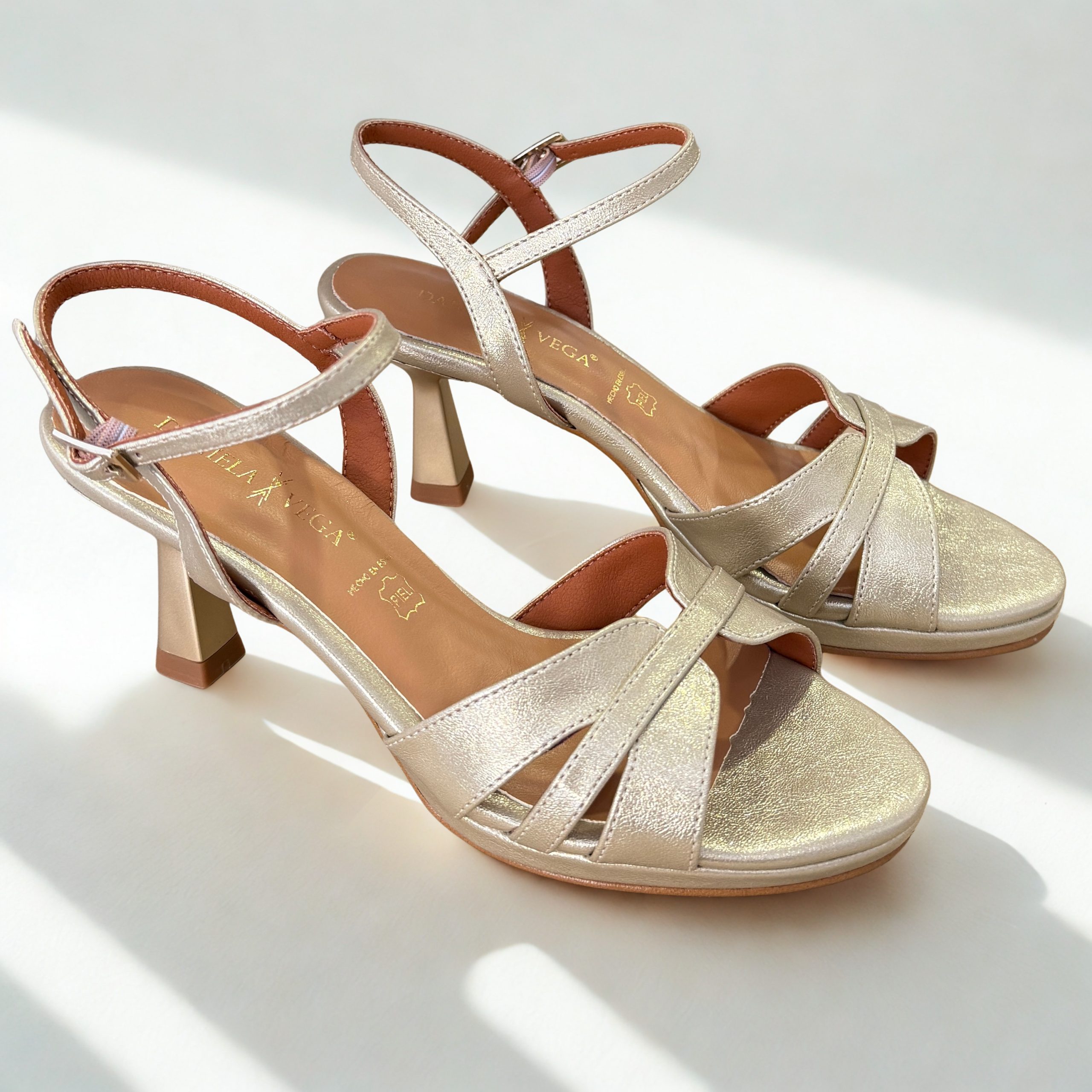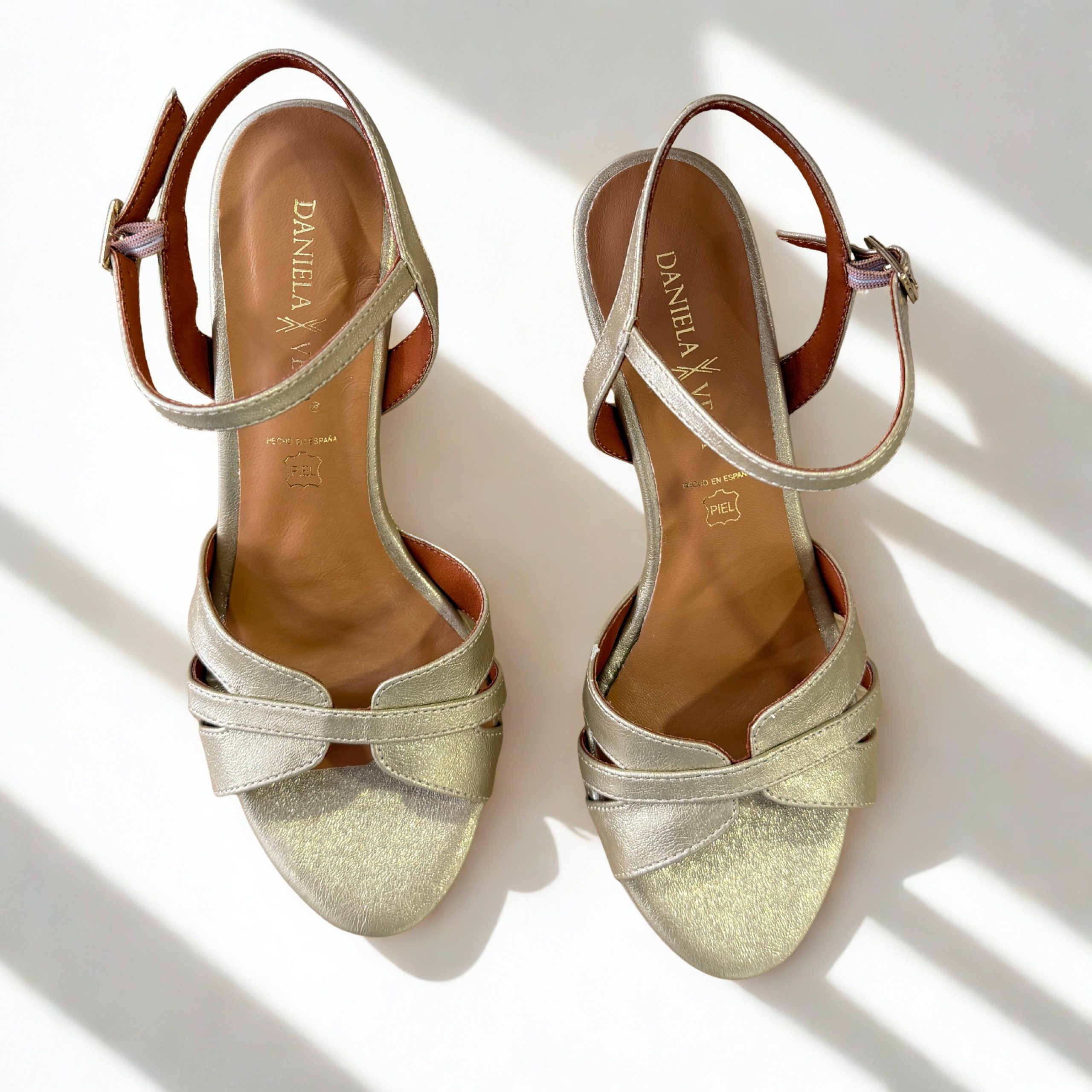 Sandalia de Daniela Vega en piel color dorado. Abrochadas al tobillo con hebilla regulable para mayor sujeción. Plantillas de piel acolchadas. Suela de goma antideslizante.Base del tacón ancha para mayor estabilidad y comodidad. 100% fabricadas en España con materiales de primera calidad.