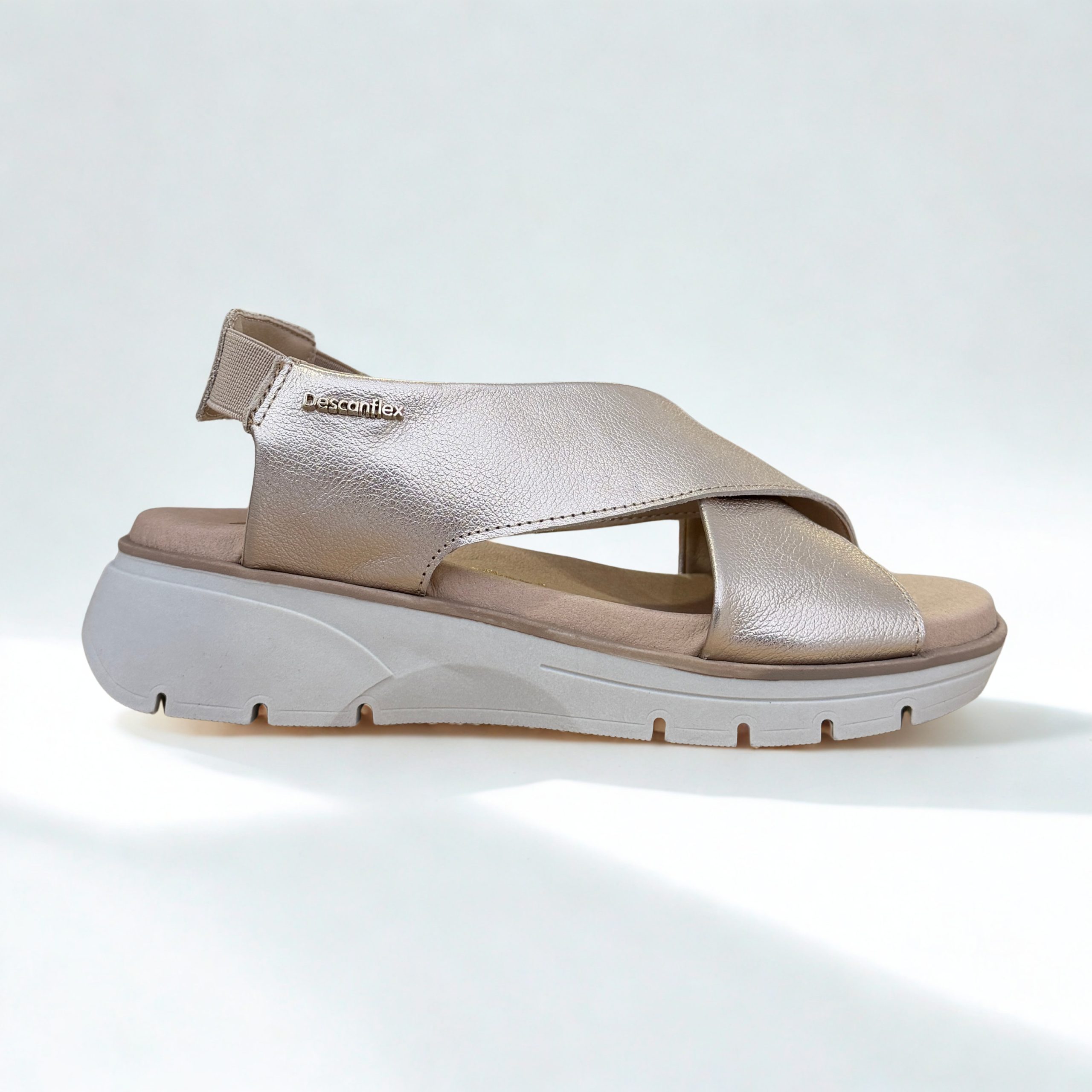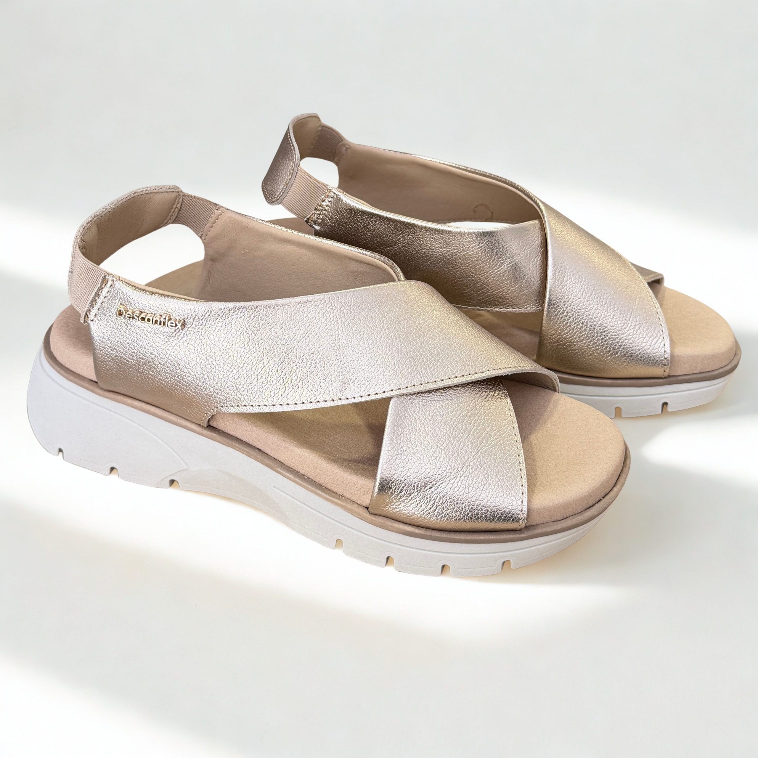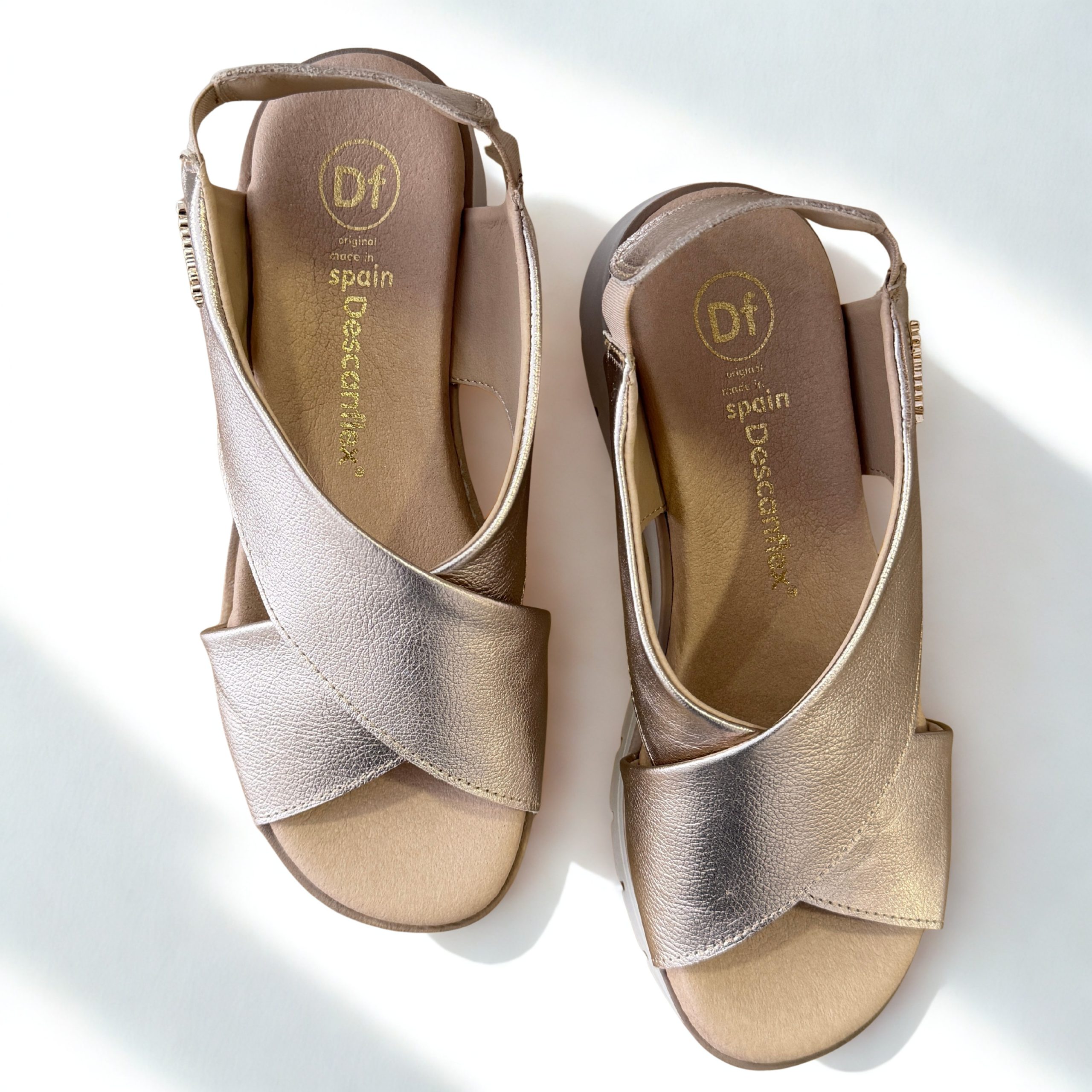 Sandalias de Descanflex en piel color dorado. Tiras cruzadas en el empiene con horma ancha, sujetas al talón con goma para un perfecto ajuste. Plantillas de piel acolchdas. Suela de goma antideslizante muy ligera y flexible. 100% fabricadas en España con materiales naturales de primera calidad.