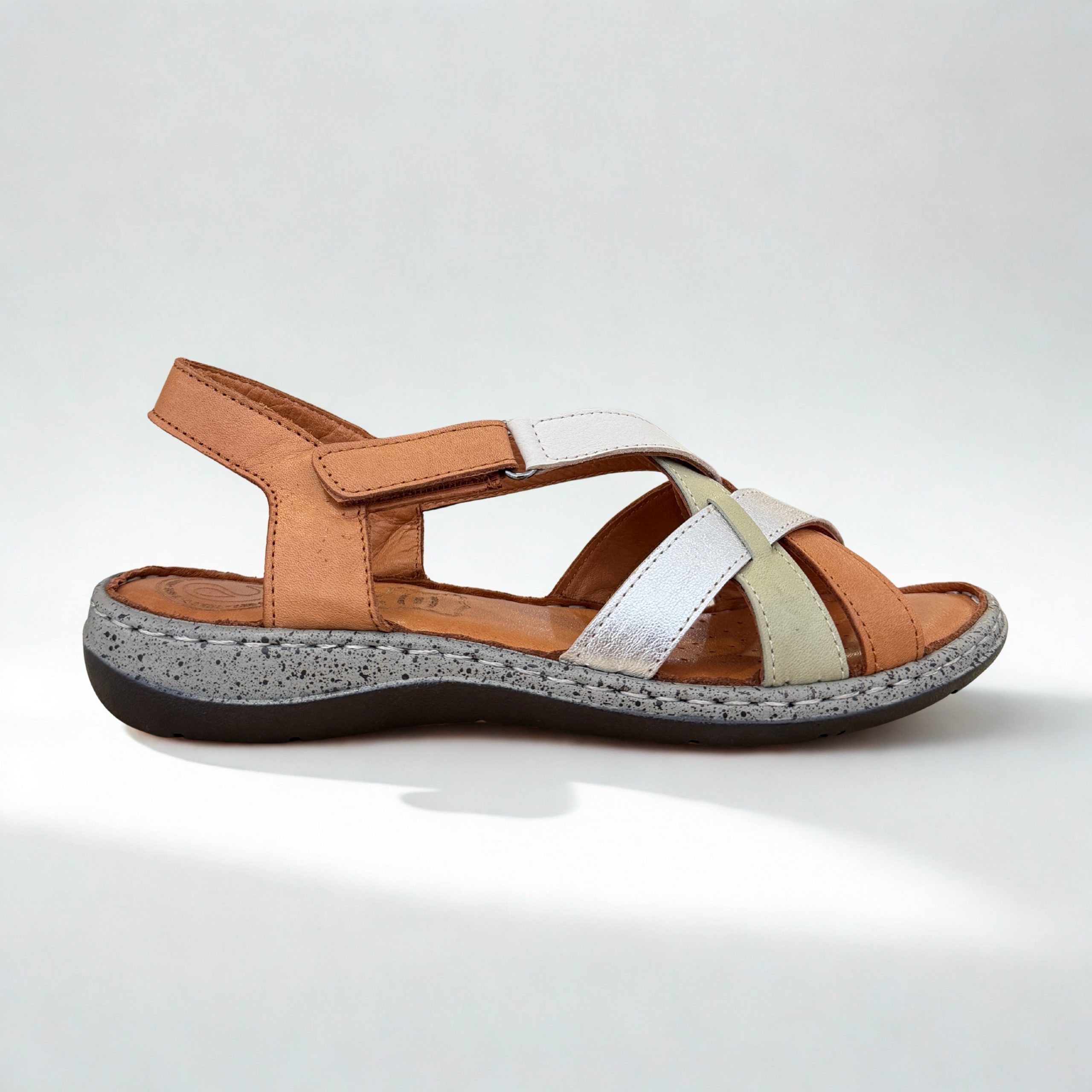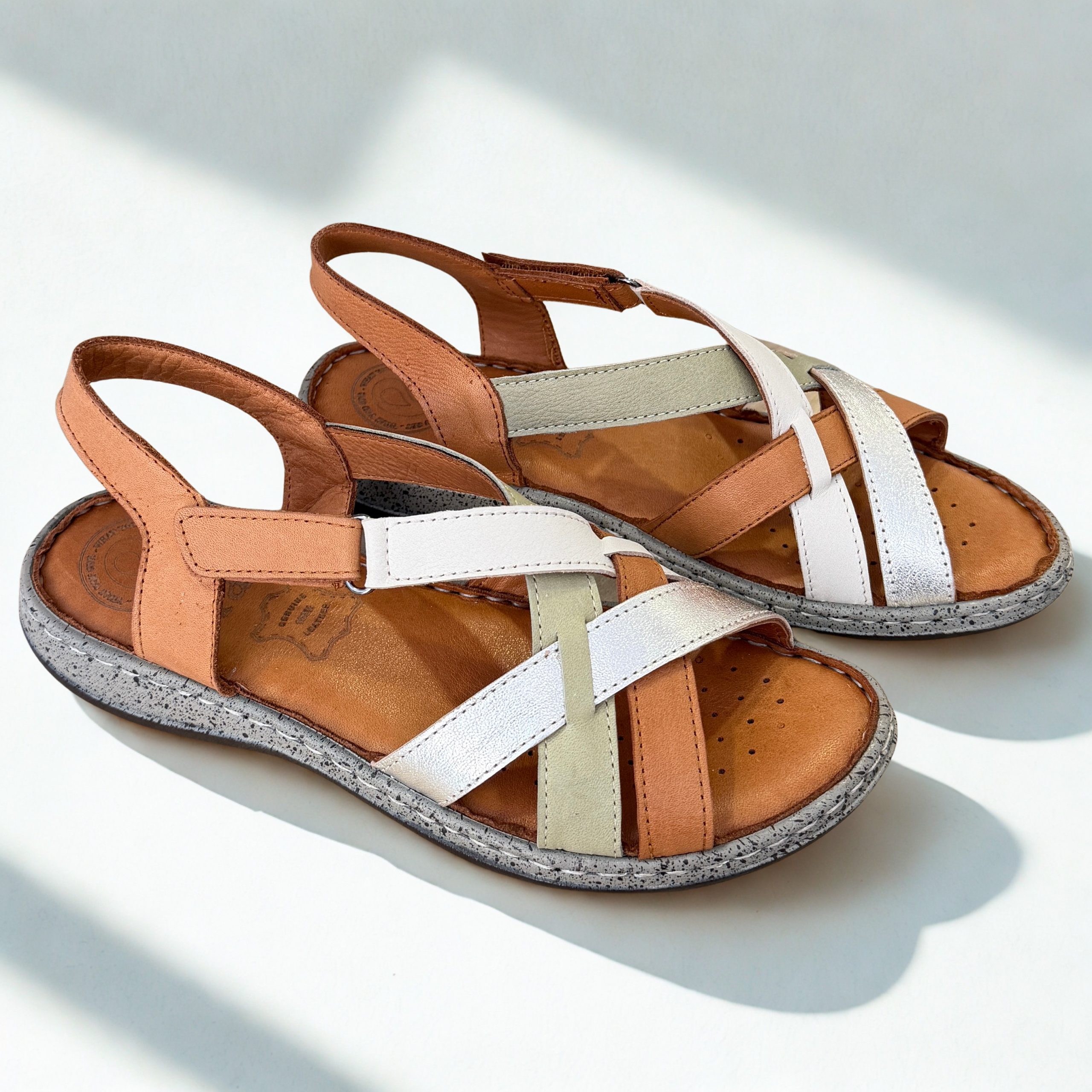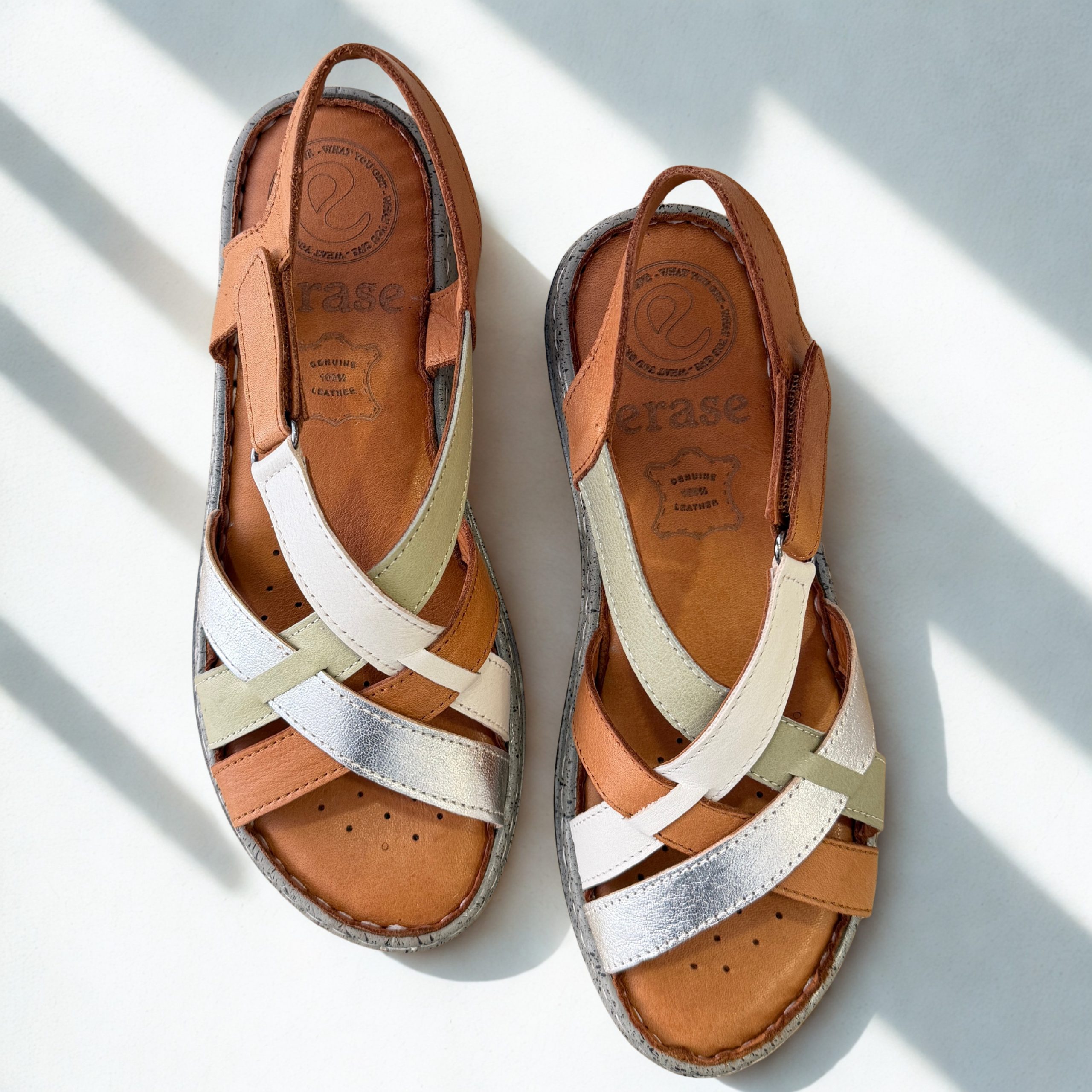 Sandalias de Erase en piel color cuero, beige, dorado y verde. Tiras cruzadas en el empeine que aportan sujeción. Abrochadas al tobillo con cierre de velcro para mayor comodidad al calzar. Plantillas de piel acolchadas. Suela de goma antideslizanete muy flexible. Fabricadas en piel muy suave y blandita lo que aporta comodidad, ligereza y durabilidad.