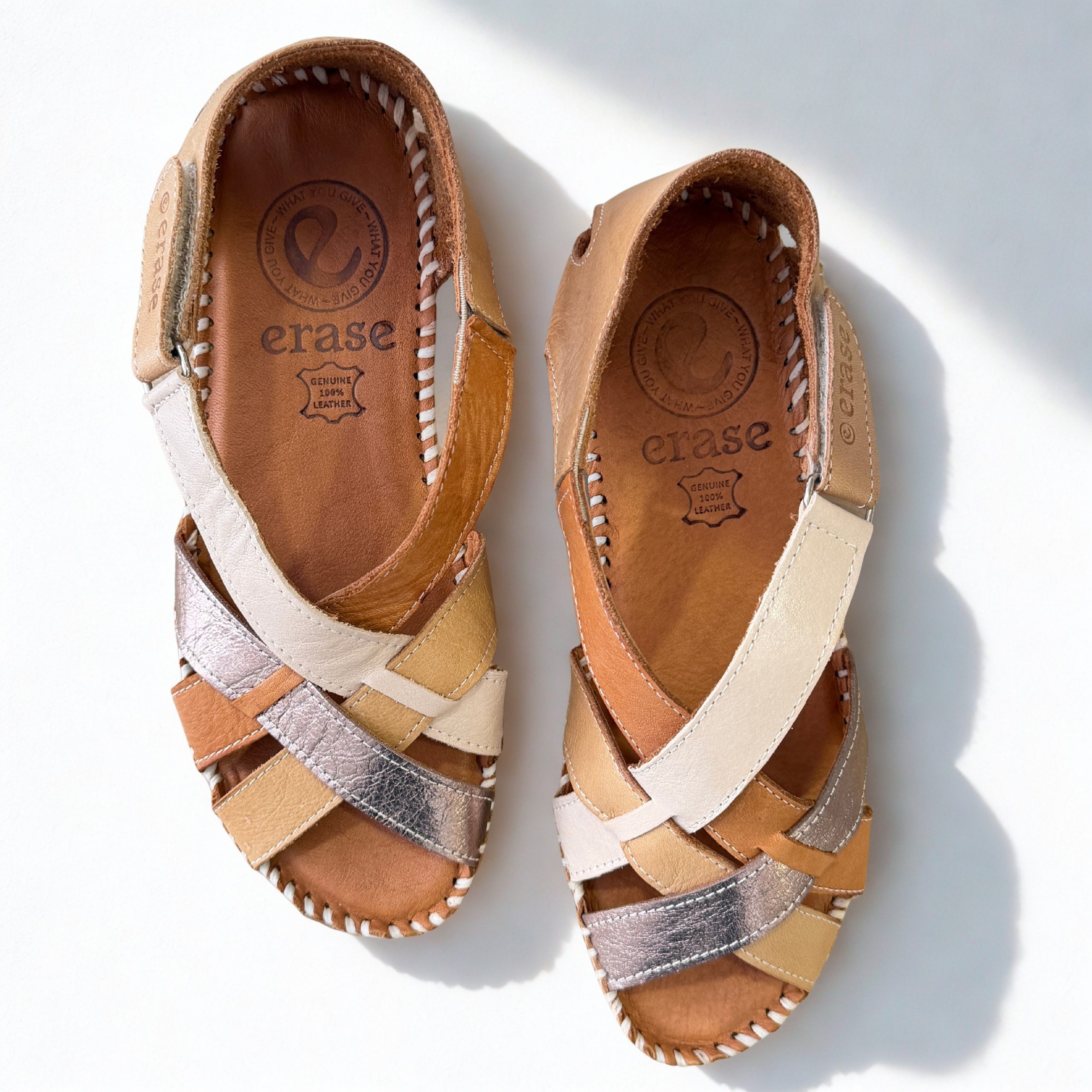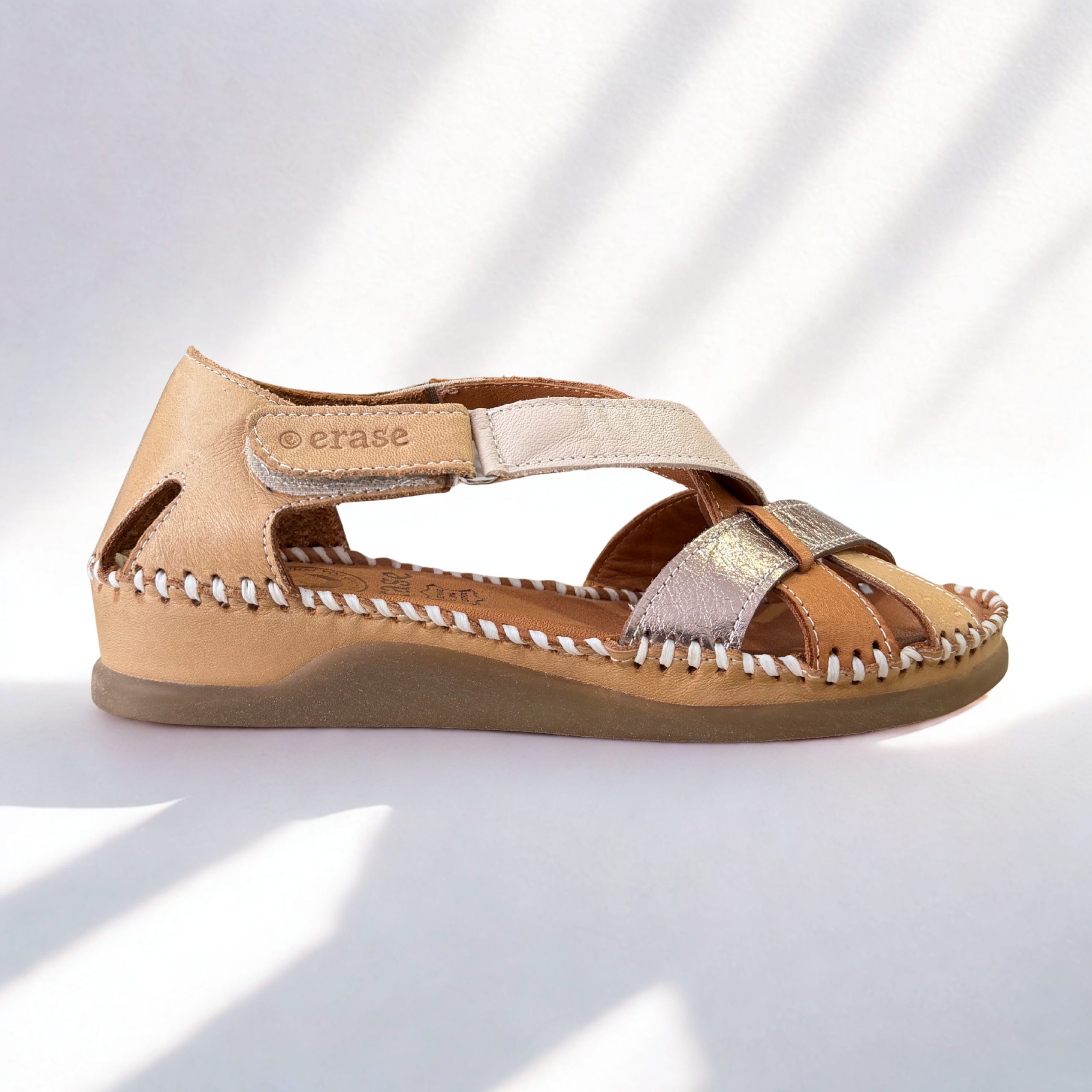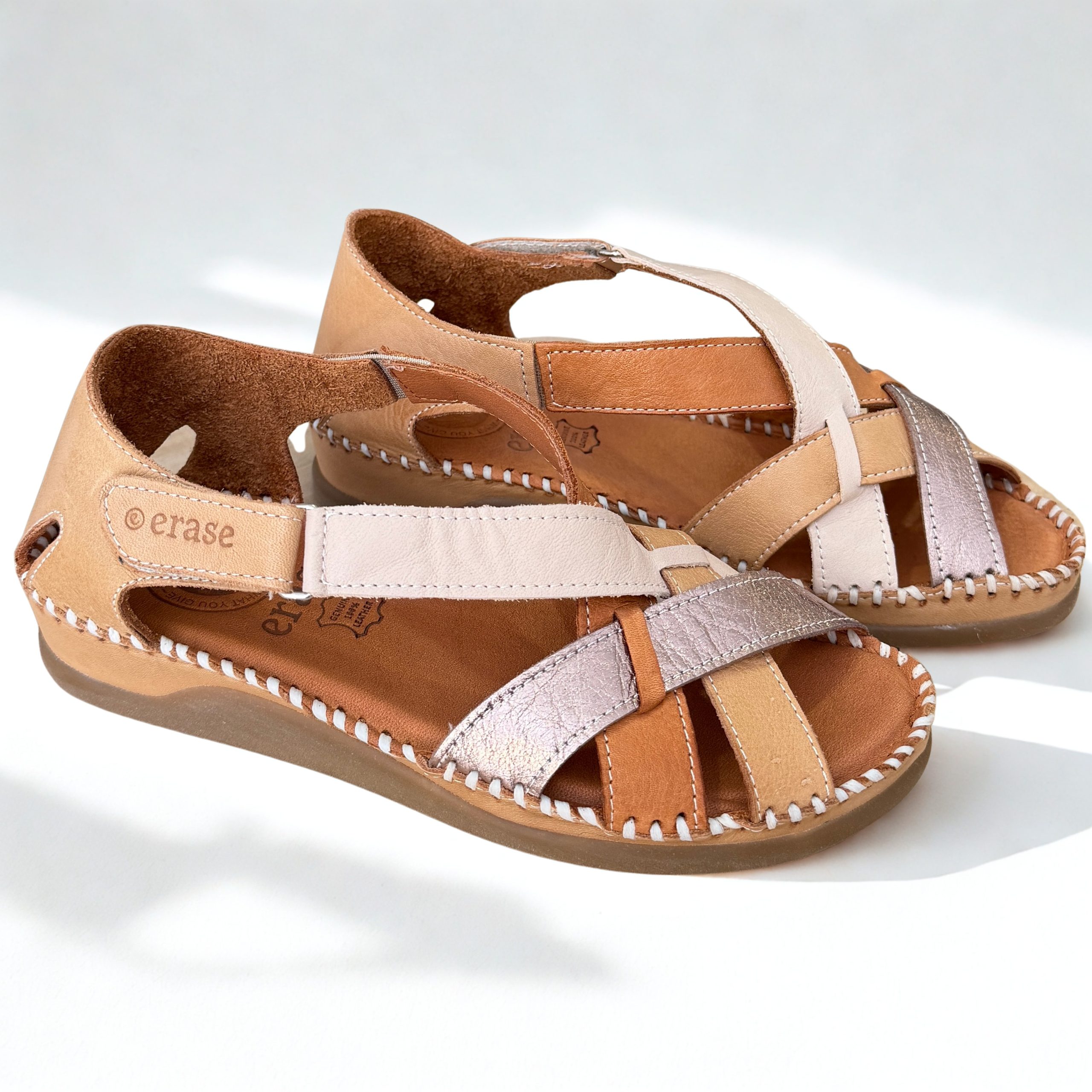 Sandalias de Erase en piel color beige combinado con cuero y dorado. Tiras cruzadas en el empeine para mayor sujeción. Abrochadas al tobillo con velcro para facilitar el calce rápido y cómodo. Plantillas de piel acolchadas. Suela de goma antidelizante muy ligera y flexible. Fabricadas con piel muy suave y resistente lo que aporta un extra de comodidad y durabilidad.