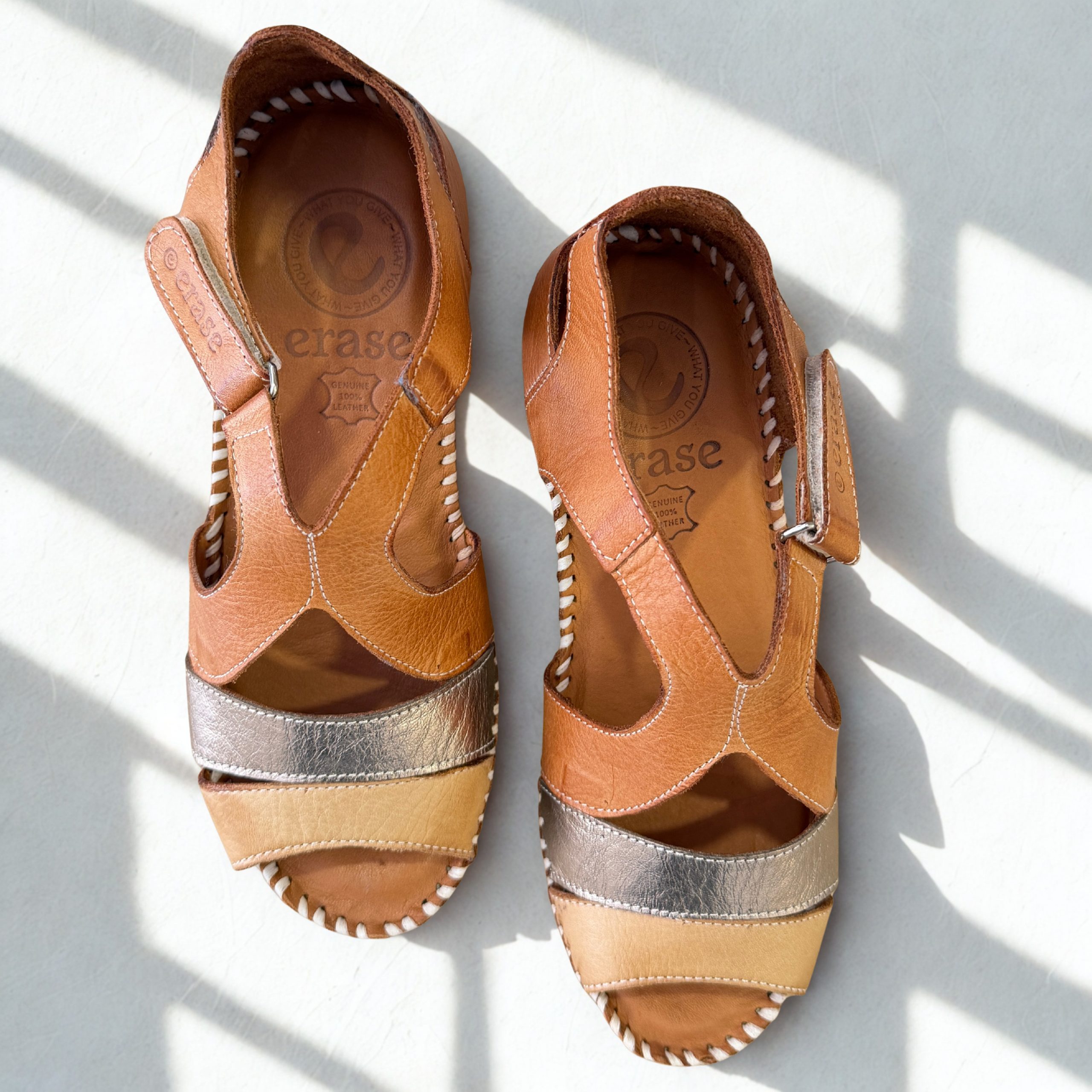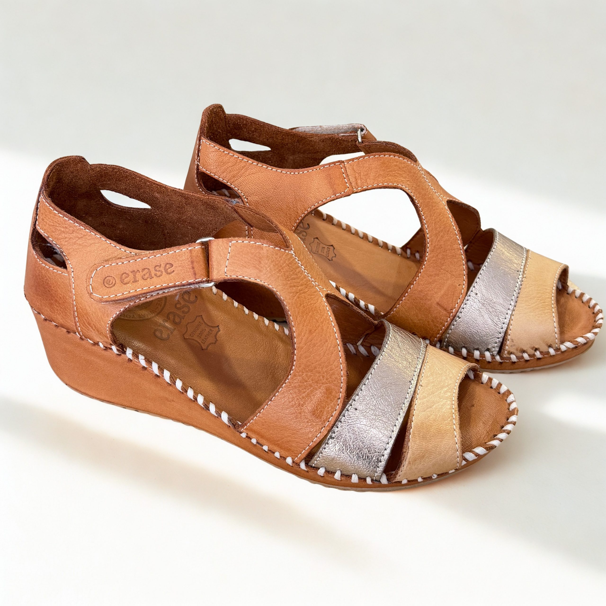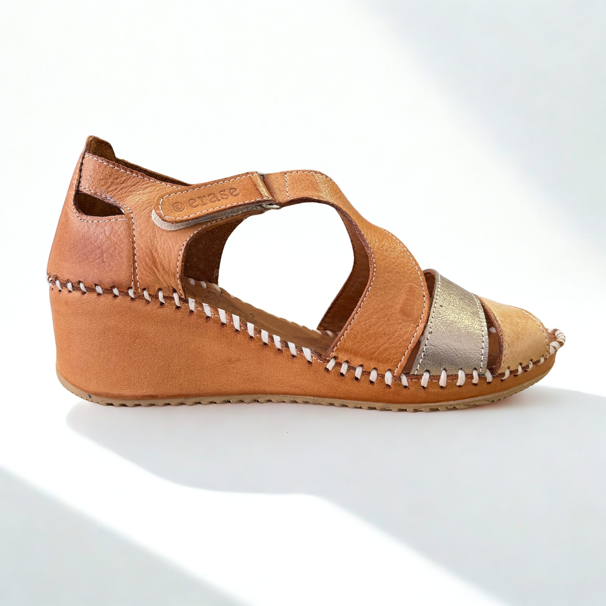Sandalias de Erase en piel color cuero combinado con dorado. Abrochada al tobillo con cierre de velcro para mayor facilidad al calzar. Plantillas de piel acolchadas. Ligera cuña que aporta la altura perfecta. Suela de goma antideslizate muy ligera y flexible. Fabricadas con piel muy suave y resistente lo que aporta un toque extra de comodidad y durabilidad.
