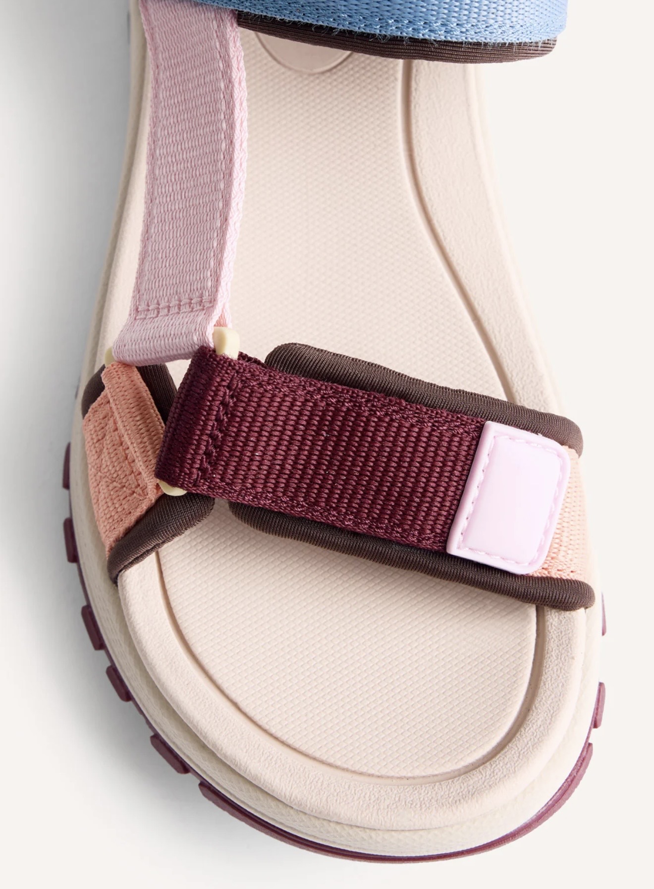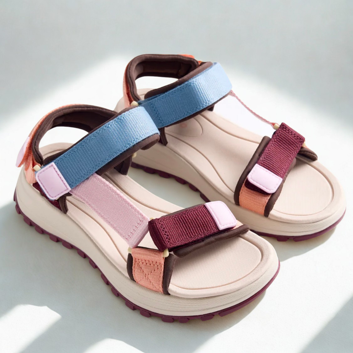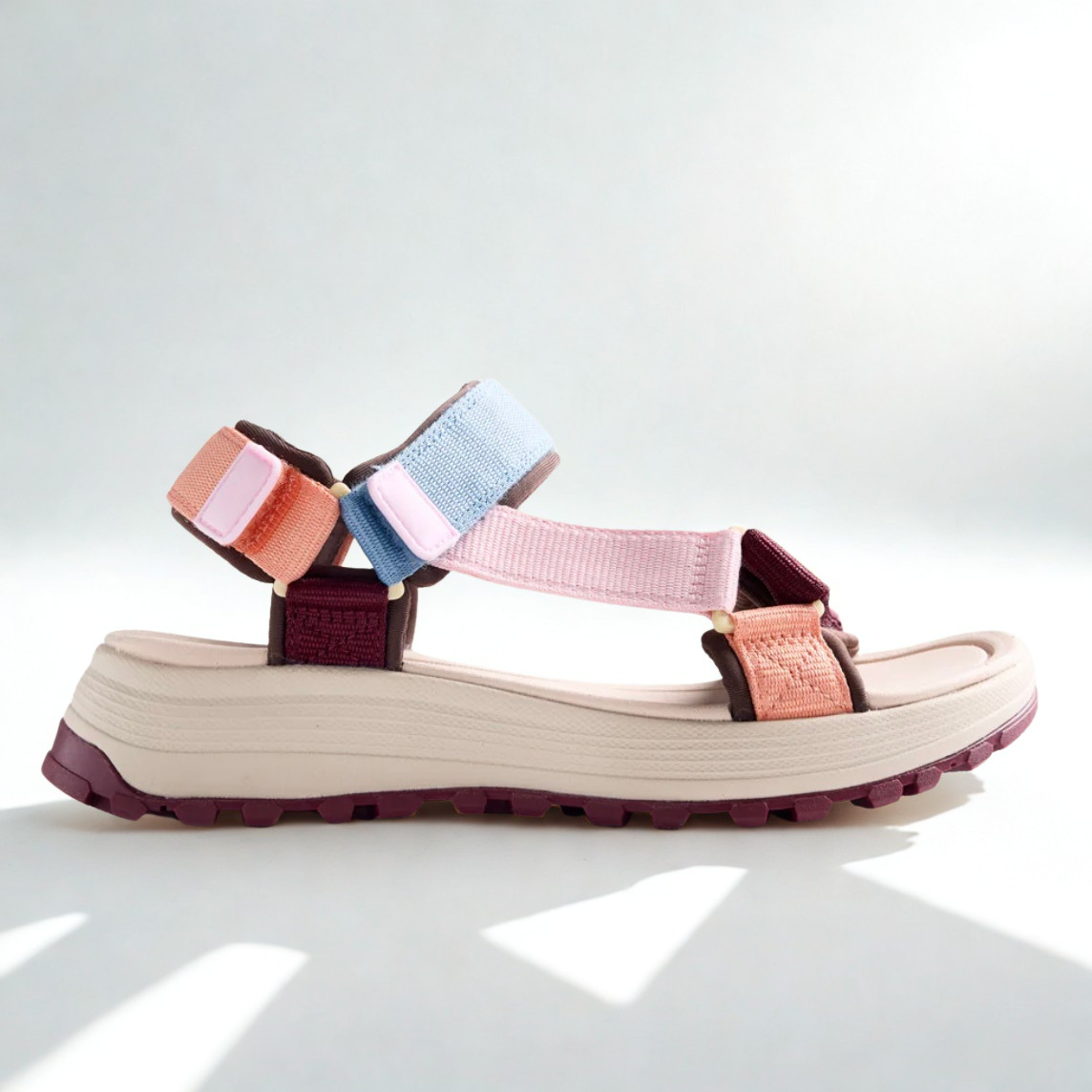 Sandalias de Gioseppo tipo californianas multicolor. Planta acolchada, cierre ajustable al tobillo y suela tipo track. Muy ligeras. Planta de fylon, un material amortiguador, antidelizante y ultraligero. Suela de caucho flexible.