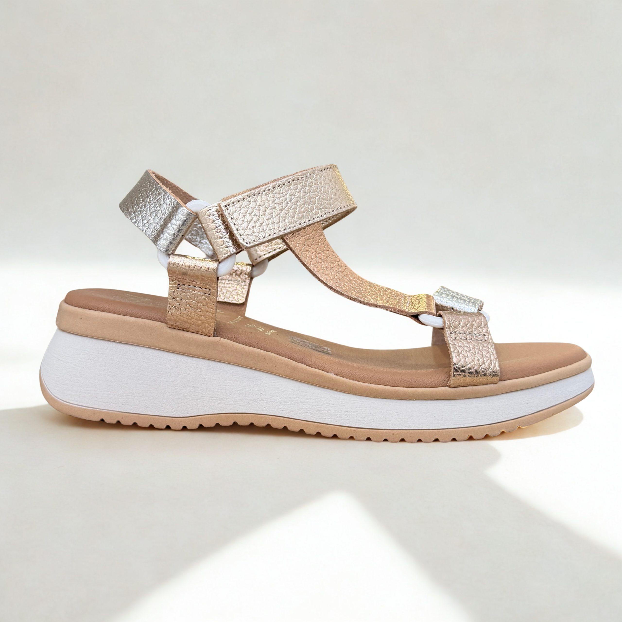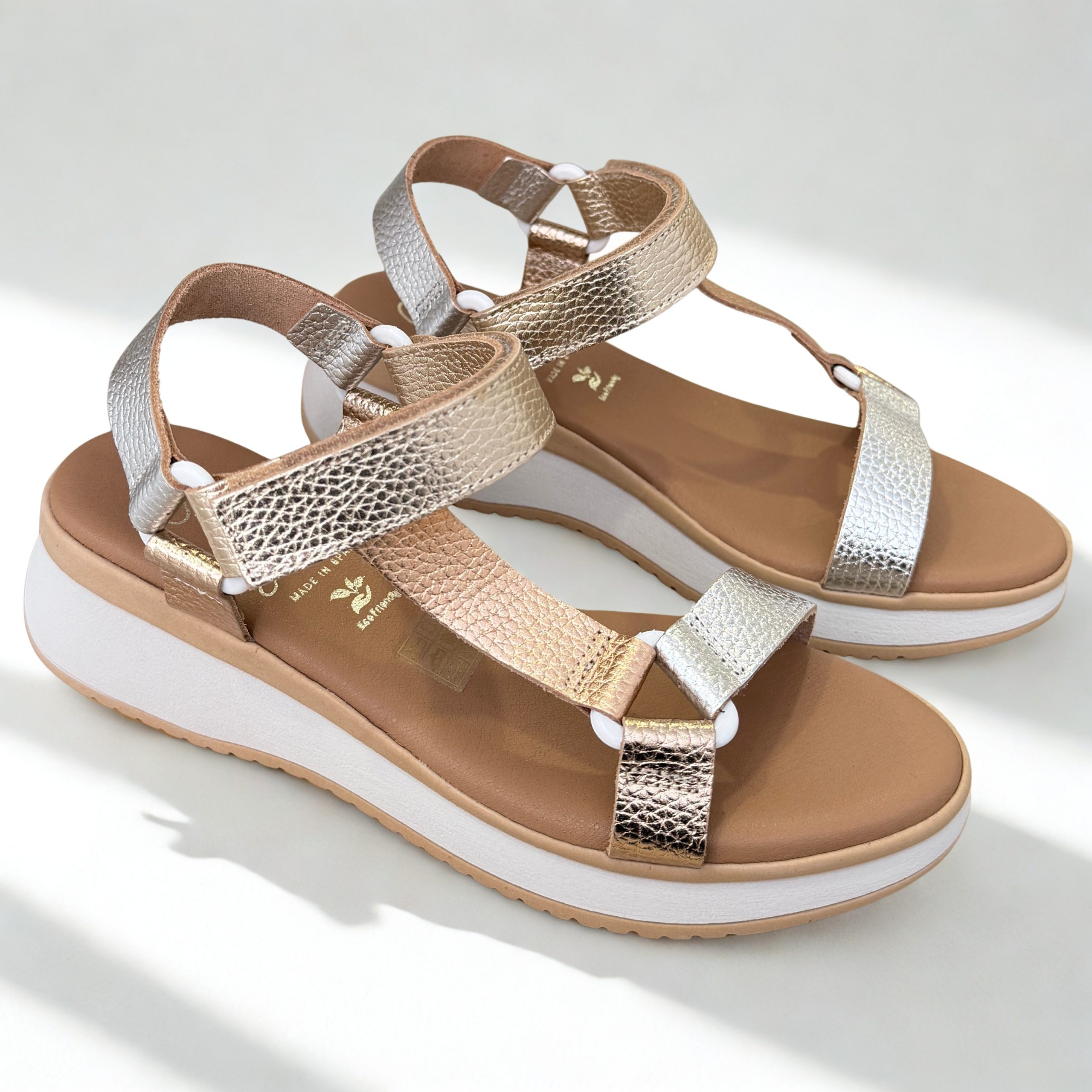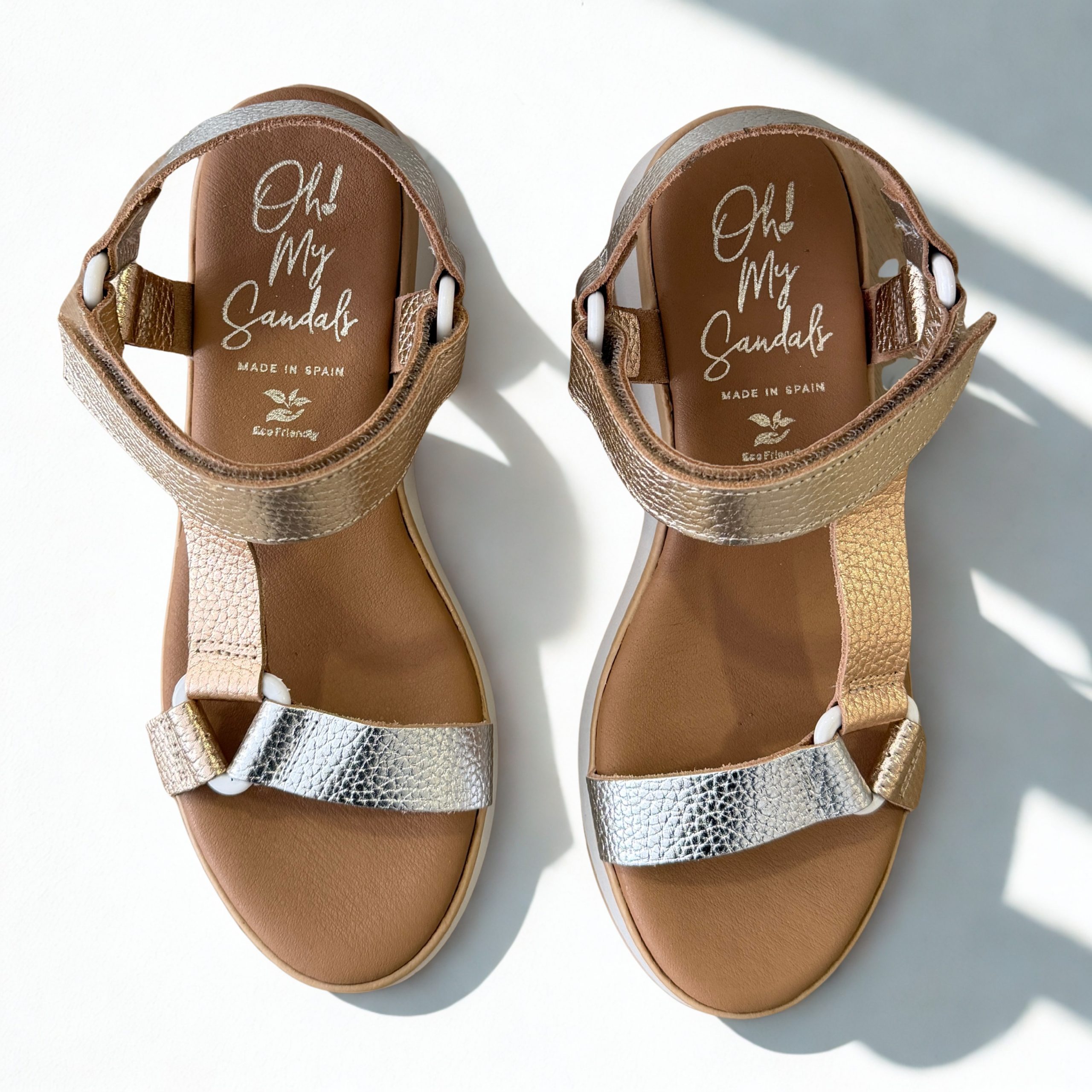Sanalia de Oh my Sandals en piel metalizada. Cierre de velcro al tobillo para un perfecto ajuste. Plantillas de piel acolchadas. Perfectas para uso diario por su gran comodiad.