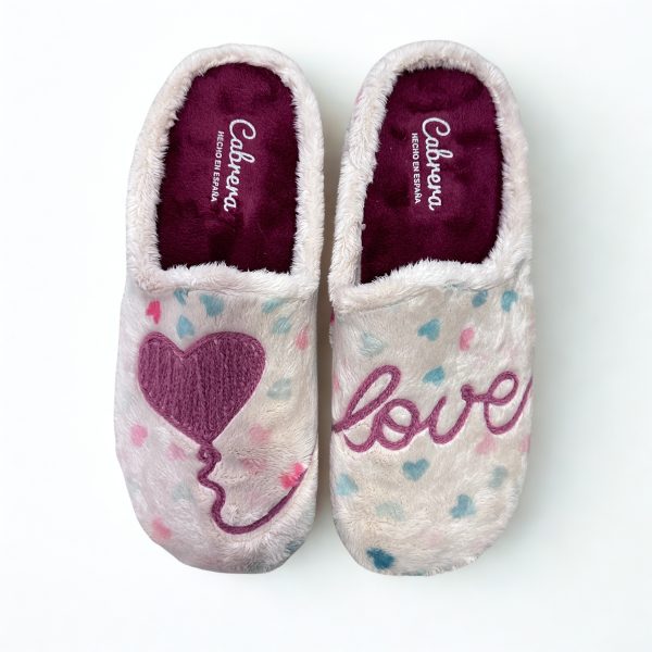 Zapatilla de Cabrera para casa con letrero love, plantillas acolchadas extraíbles y suela de goma antideslizante. 100% fabricadas en España.
