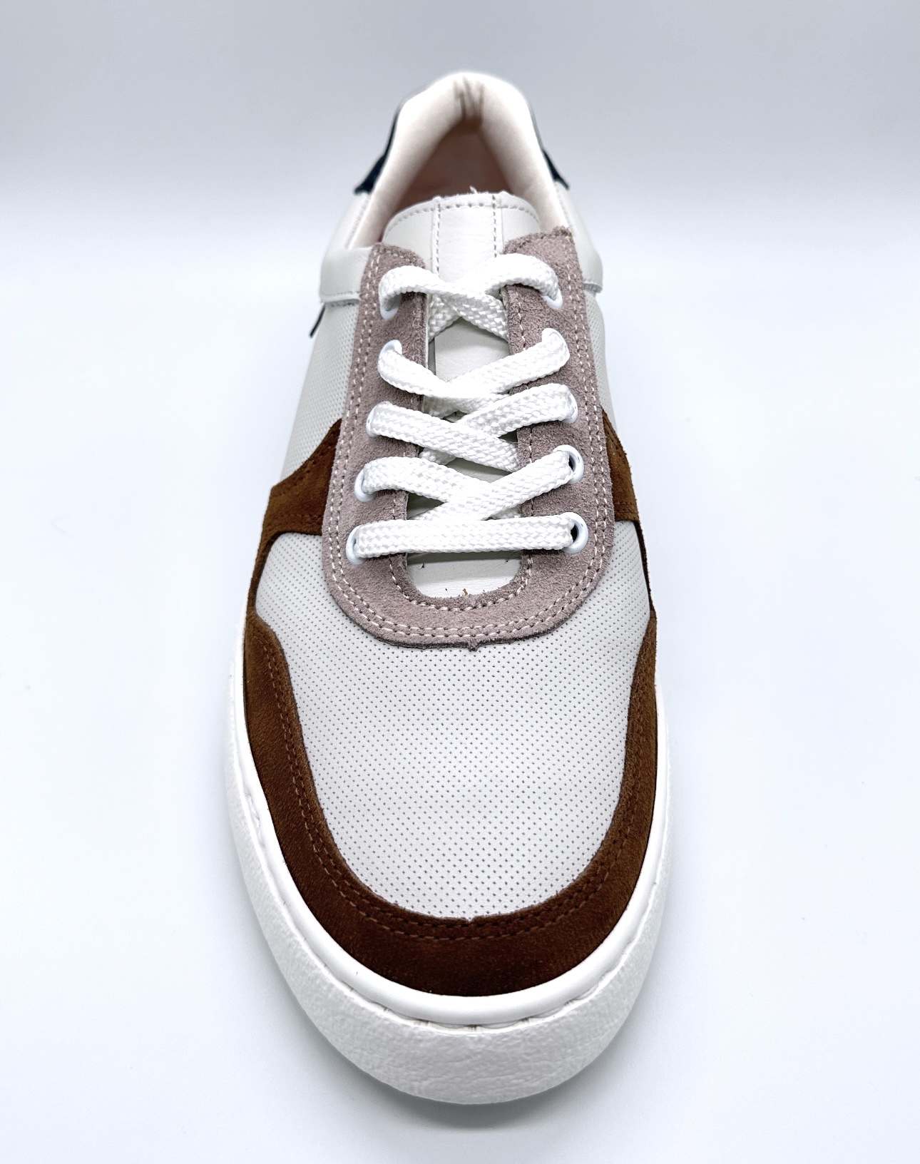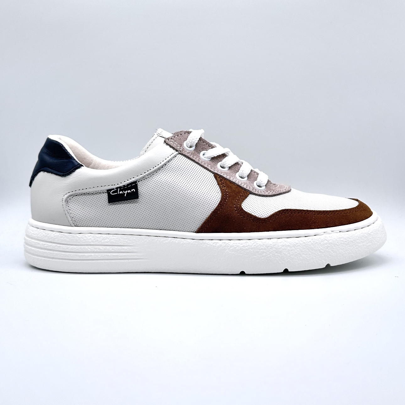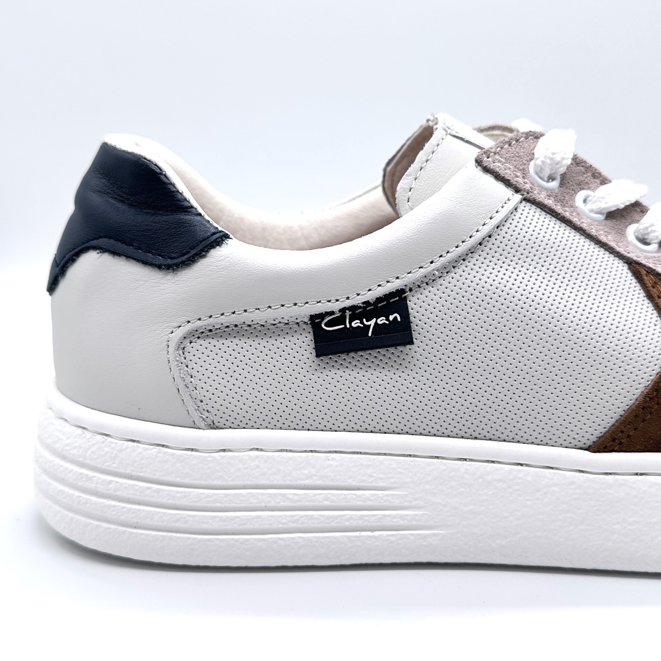 Zapatilla de Clayan para chico fabricada en piel color blanca, detalles en color azul marino y cuero. Cierre con cordones. Plantillas de piel acolchadas. Muy ligero y flexible transpierable. Super ligero.