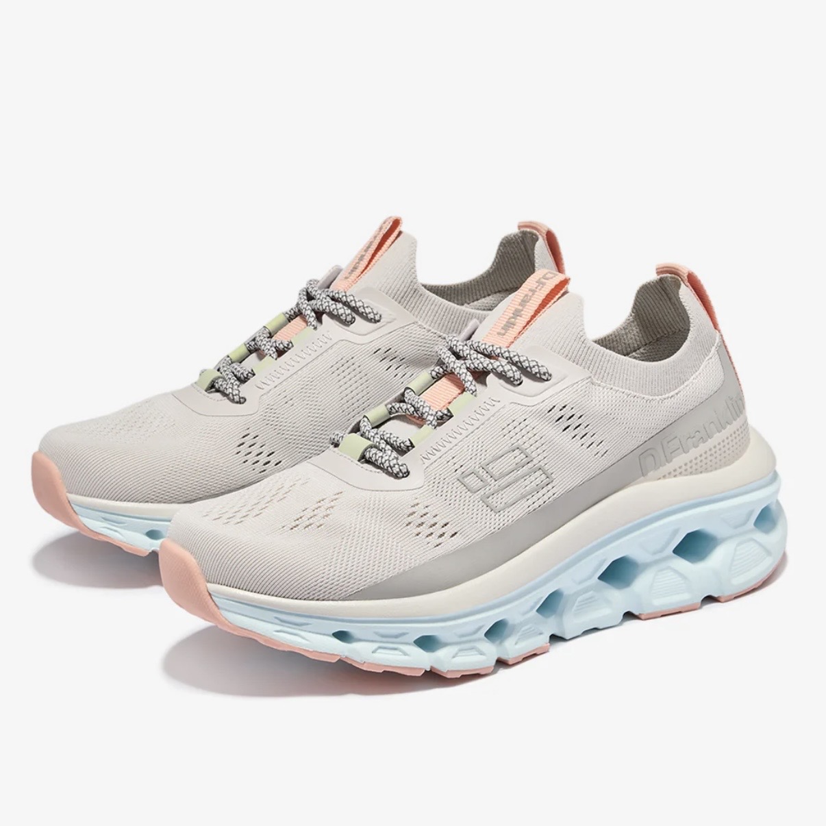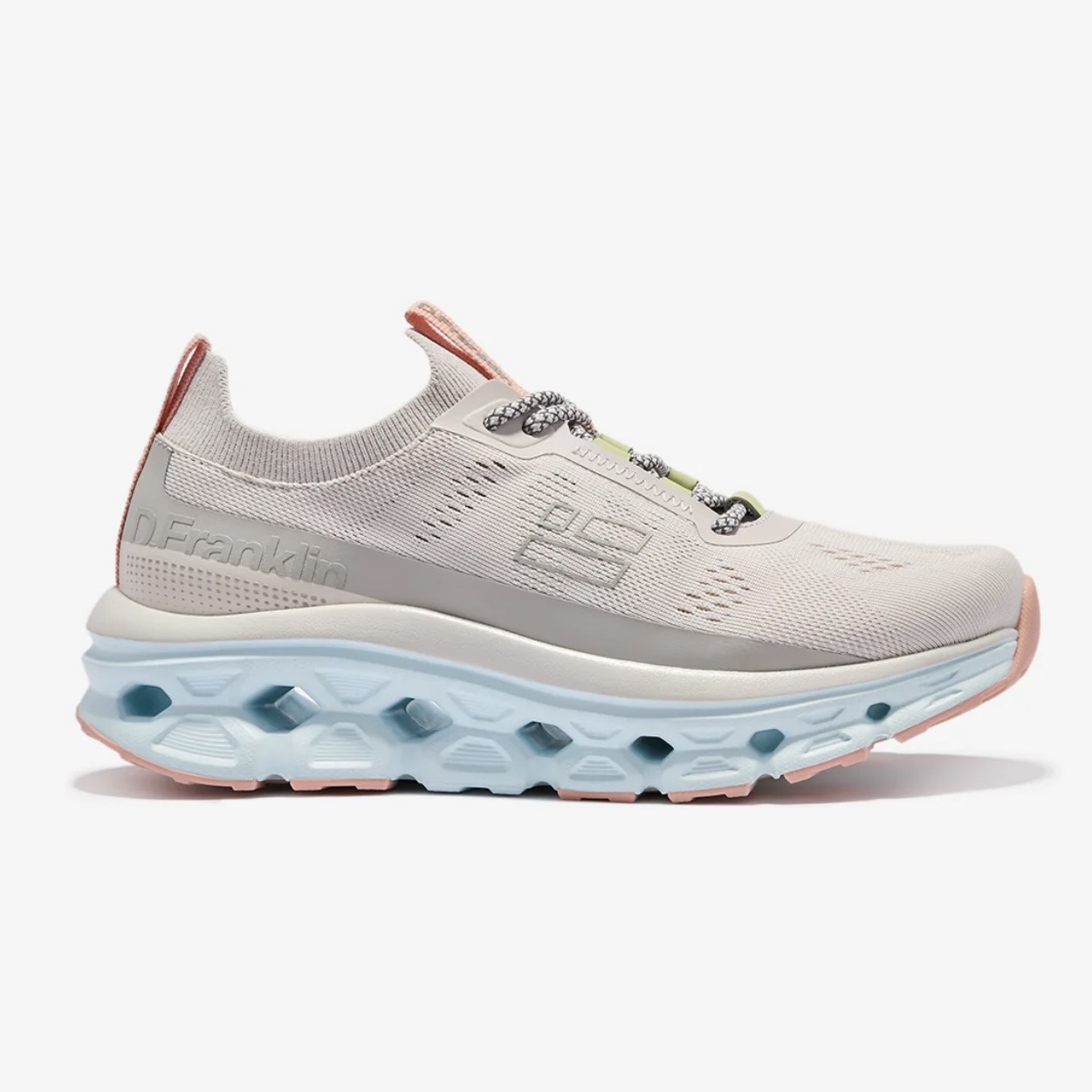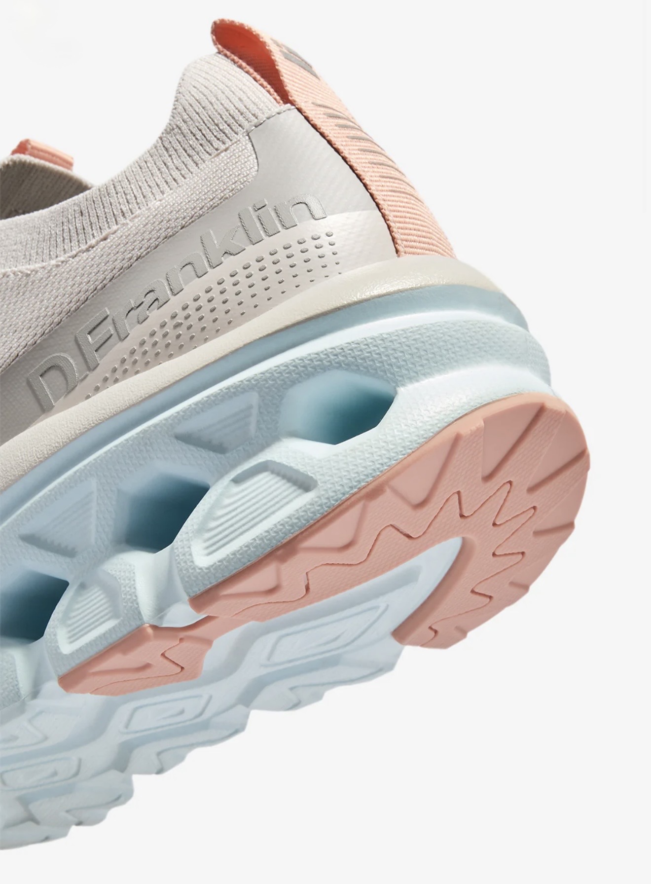 Zapatillas de D.Franklin en color beige con destalles en celeste y coral. Diseñadas para caminar con comodidad, ajuste con cordones para un agarre seguro. Suela con plataforma que ofrece una pisada estable, respaldada por la validación Biomechanical run Confort.