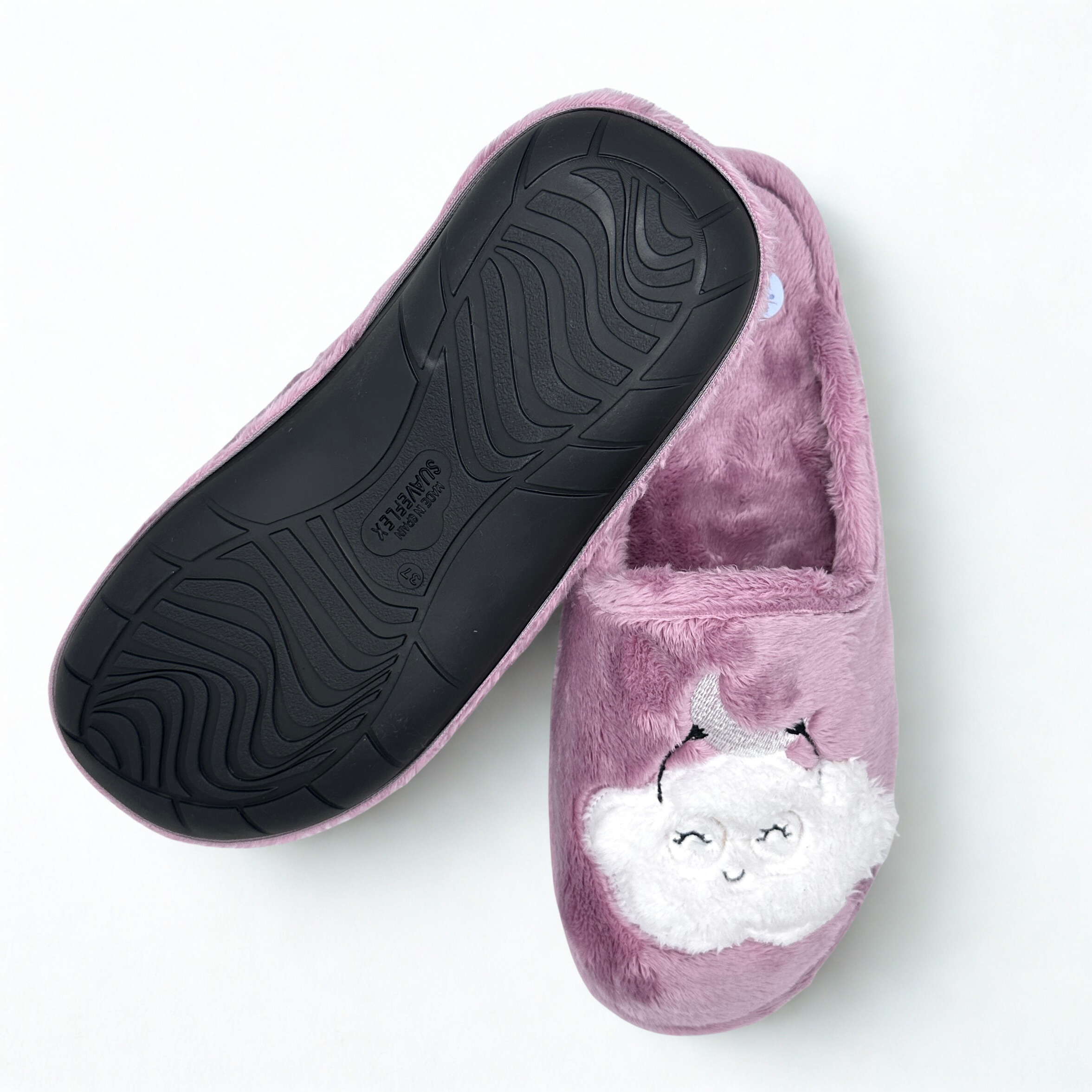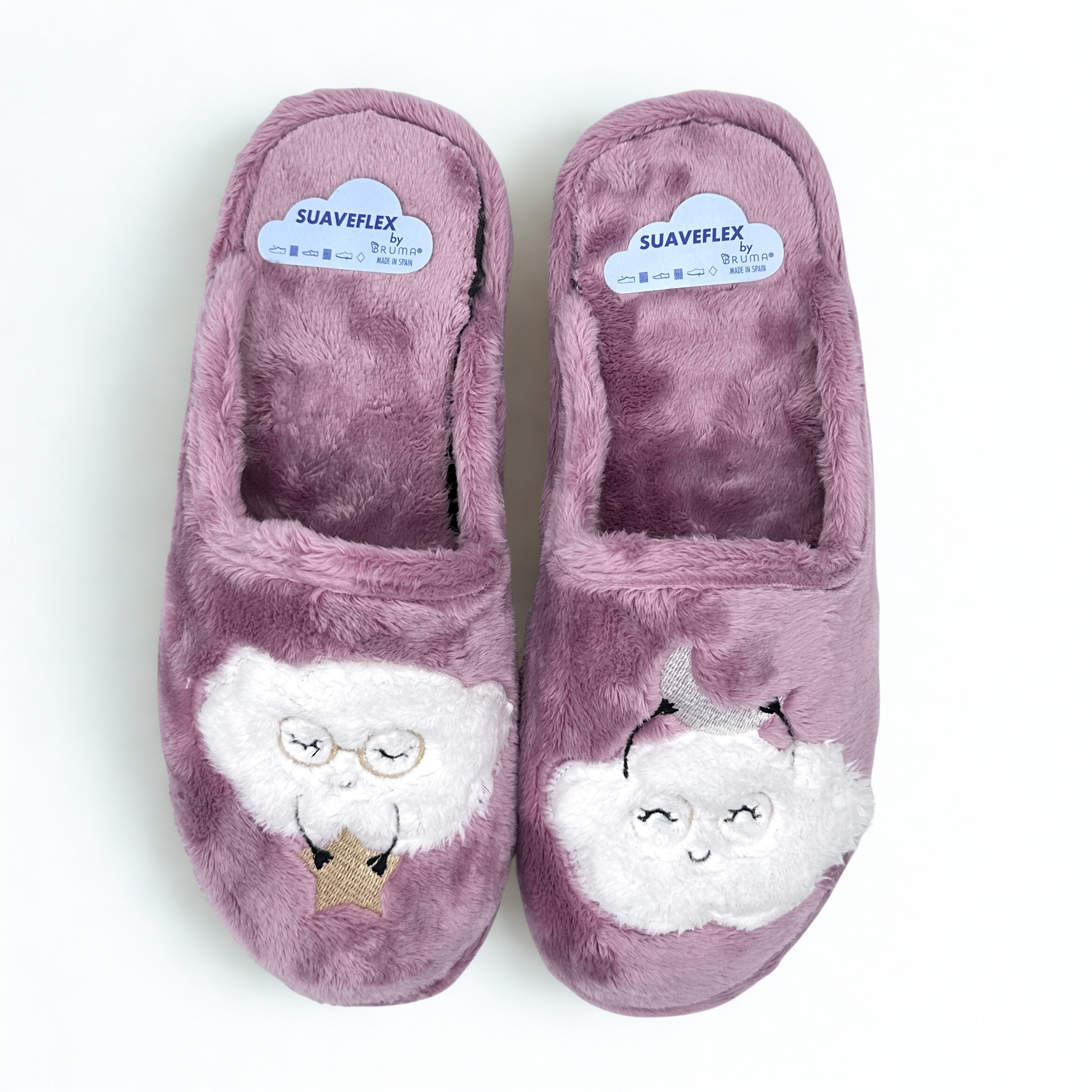 Zapatillas de Suaveflex con dibujo de nube, plantillas muy acolchadas. Suela de goma antideslizante. 100% fabricadas en España. Muy resistentes.