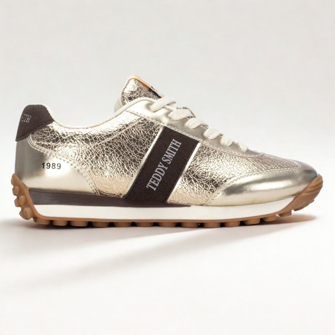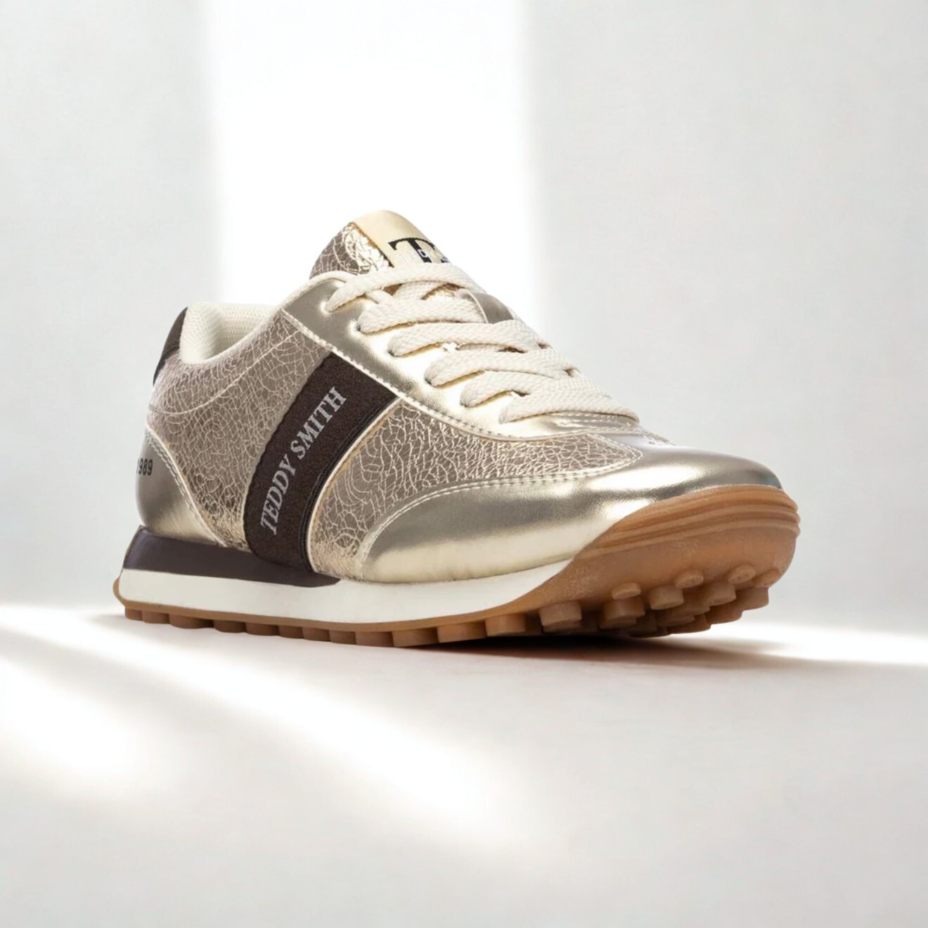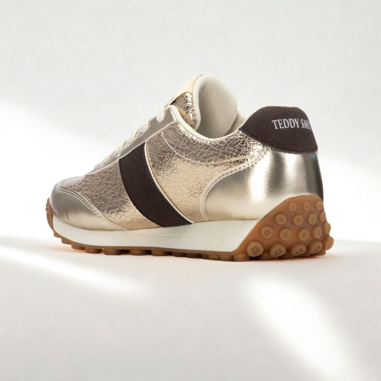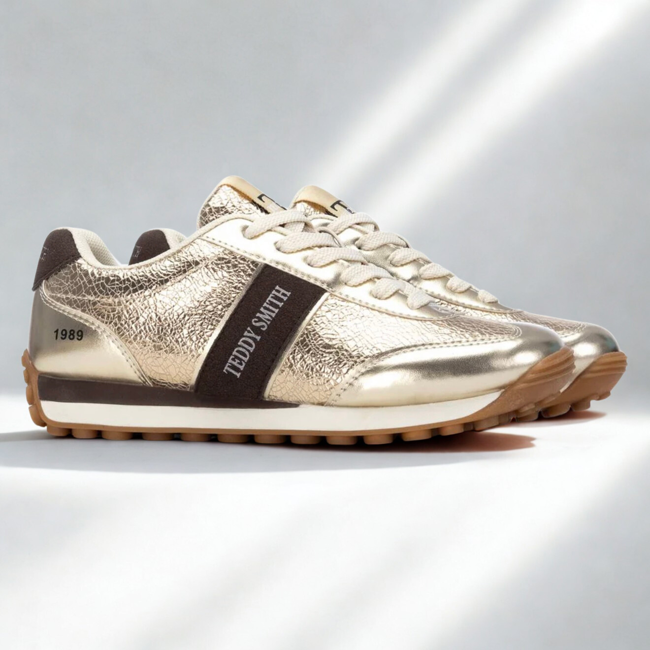 Zapatillas de Teddy Smith fabricadas en polipiel color dorado combinado con chocolate. Cierre mediante cordones ajustable. Diseño retro. Perfectas para looks casual y moderno, pensadas para resistir el uso diario con estilo y comodidad. Vesátiles que unen confort, durabilidad y elegancia.
