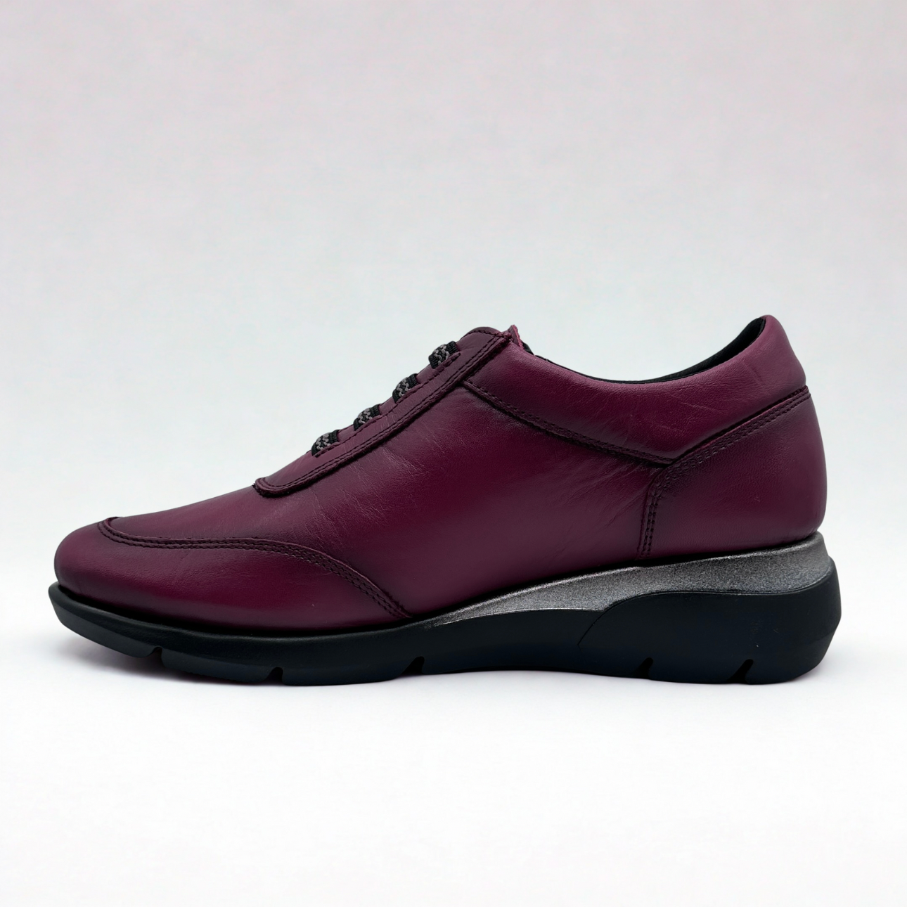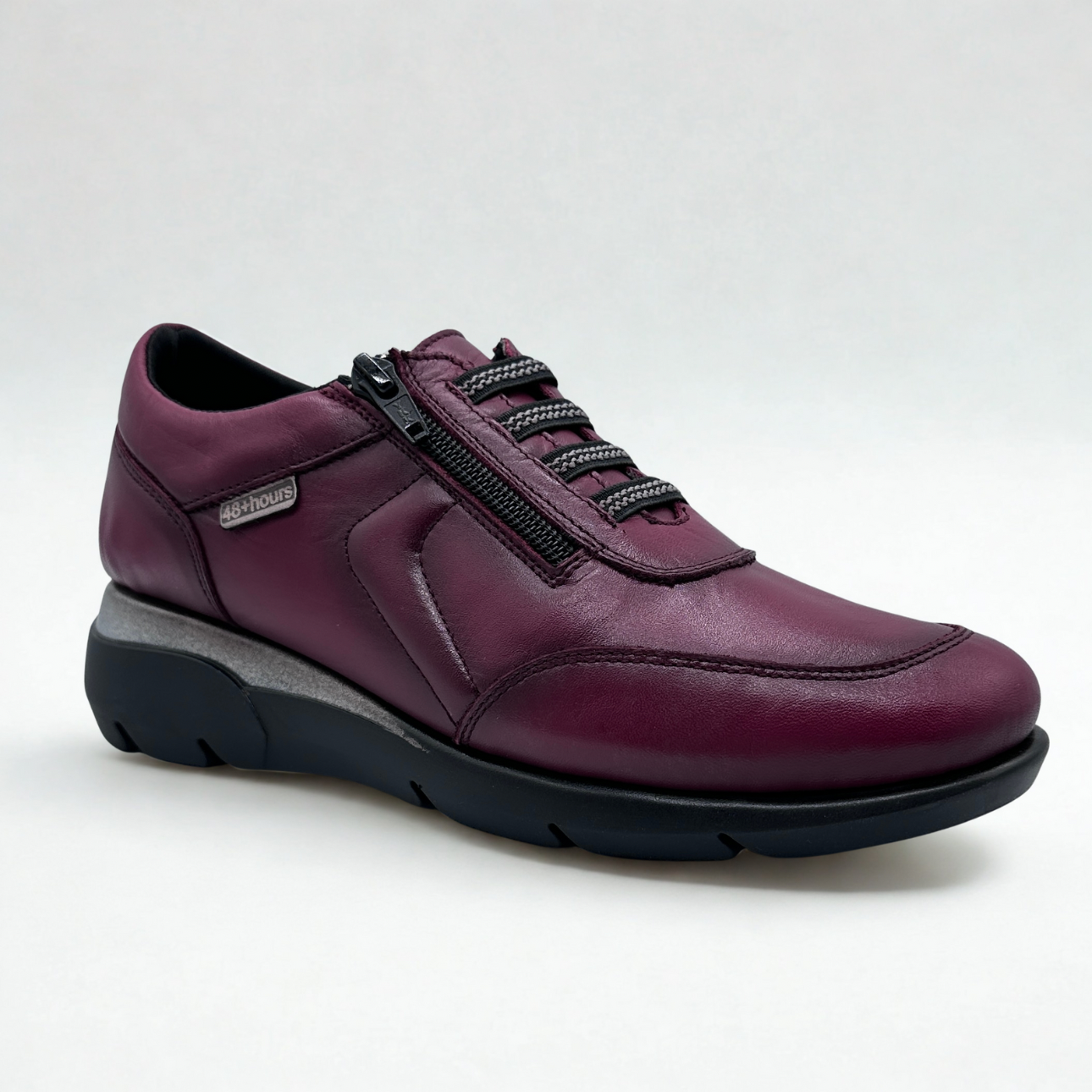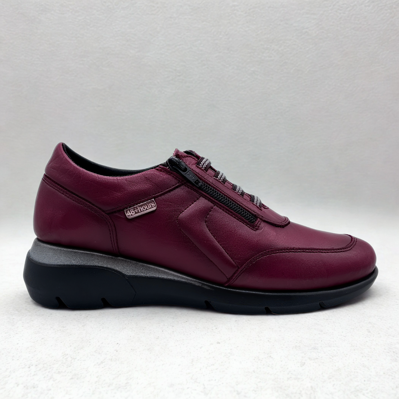 Zapato de 48+Hours tipo deportivo en piel color burdeos, cierre de cordones elásticos y cremallera para facilitar su puesta. Fabricado en piel de primera calidad super flexible. Suela de goma antideslizante muy ligera y flexible. Plantillas de piel acolchadas.