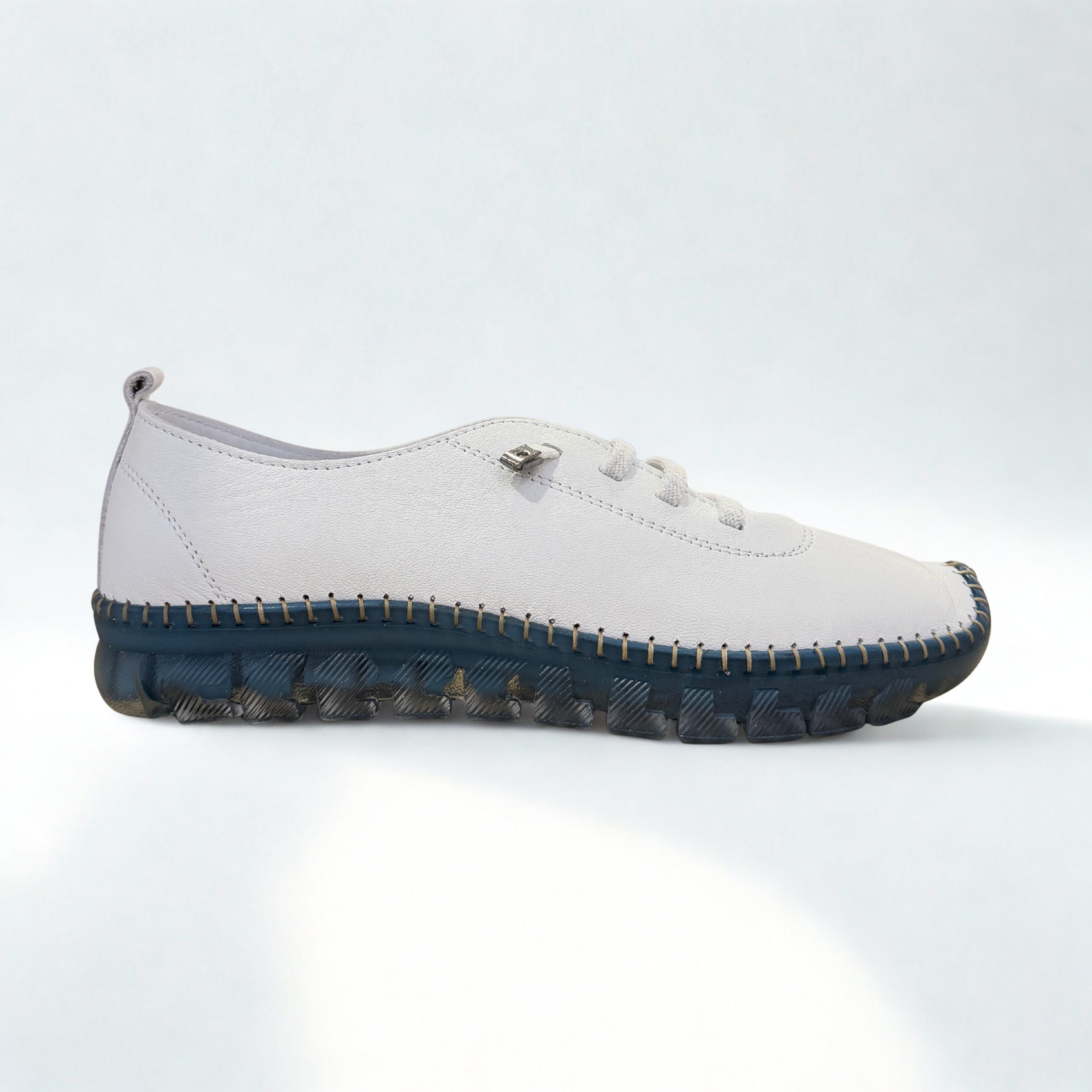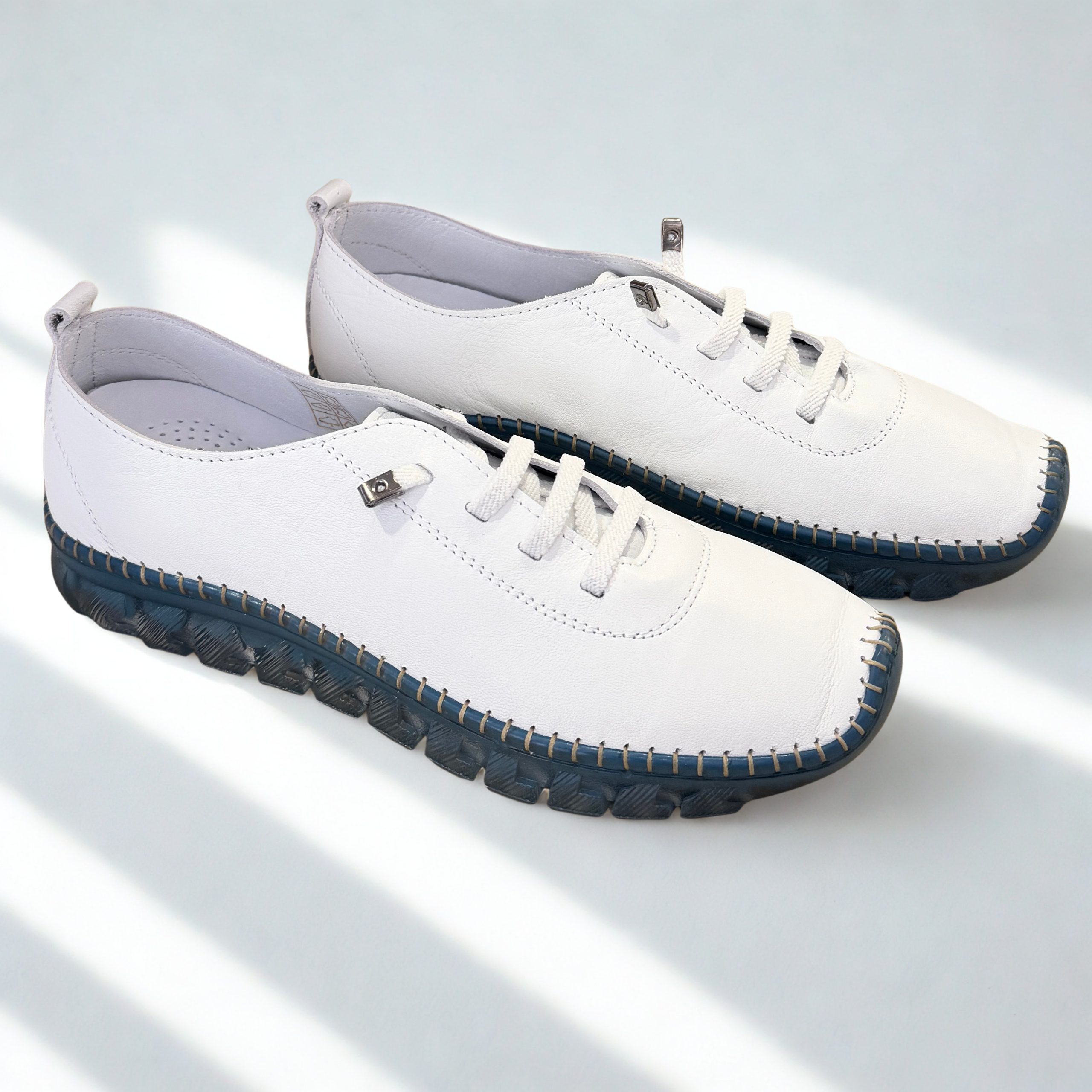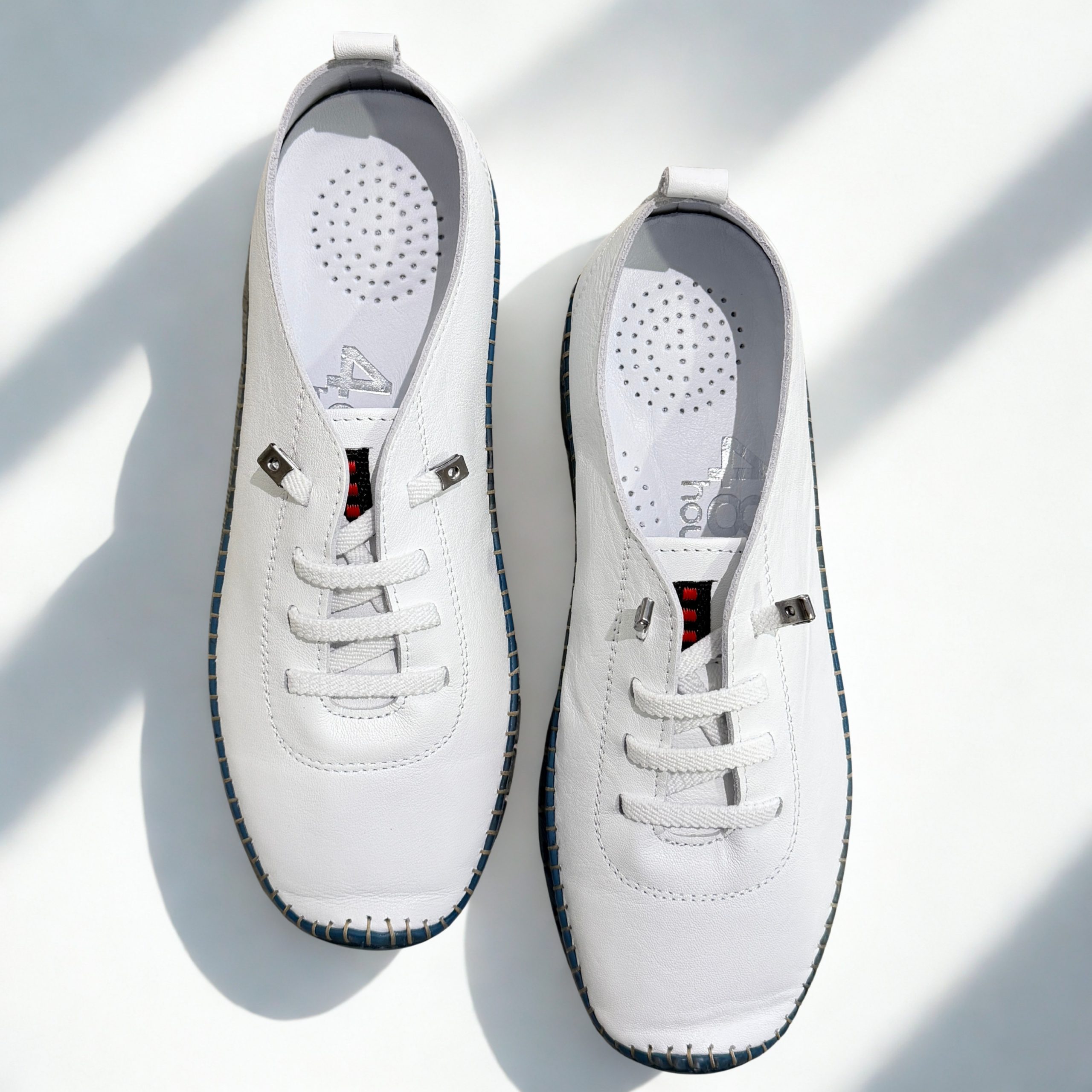 Zapato deportivo de 48+Hours en piel color blanco con suela en azul. Cordones elásticos para mayor comodidad al calzarlos. Plantillas extraíbles acolchadas. Ultra flexibles y sin costuras laterales. Suela de goma antideslizante muy ligera y flexible. Descubre el confort absoluto con este modelo!