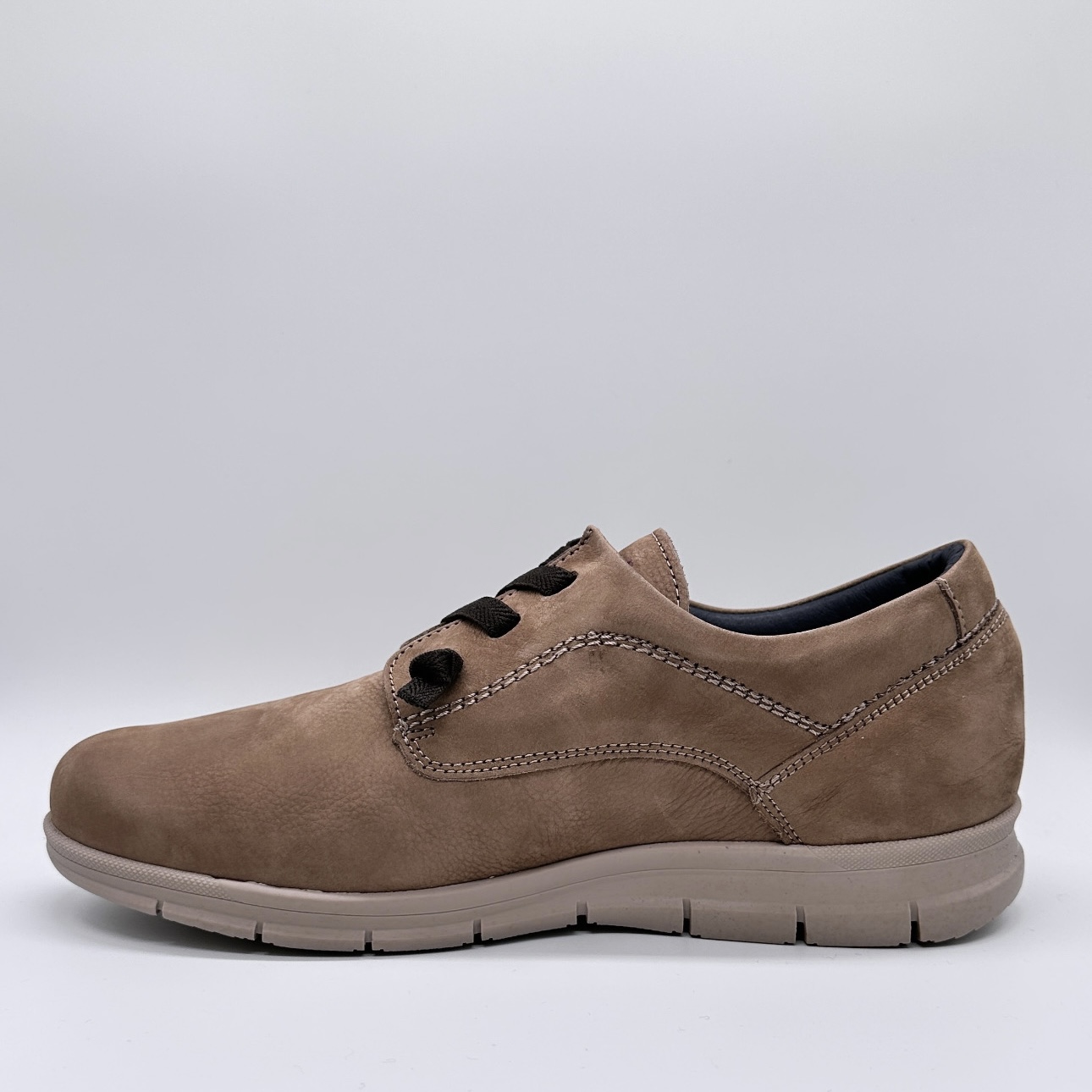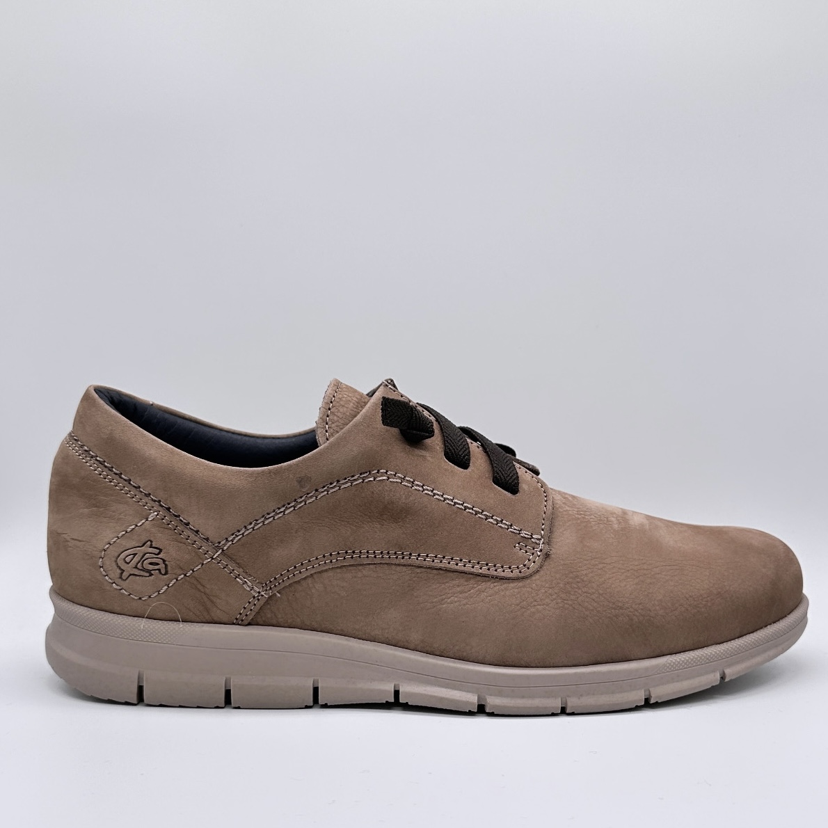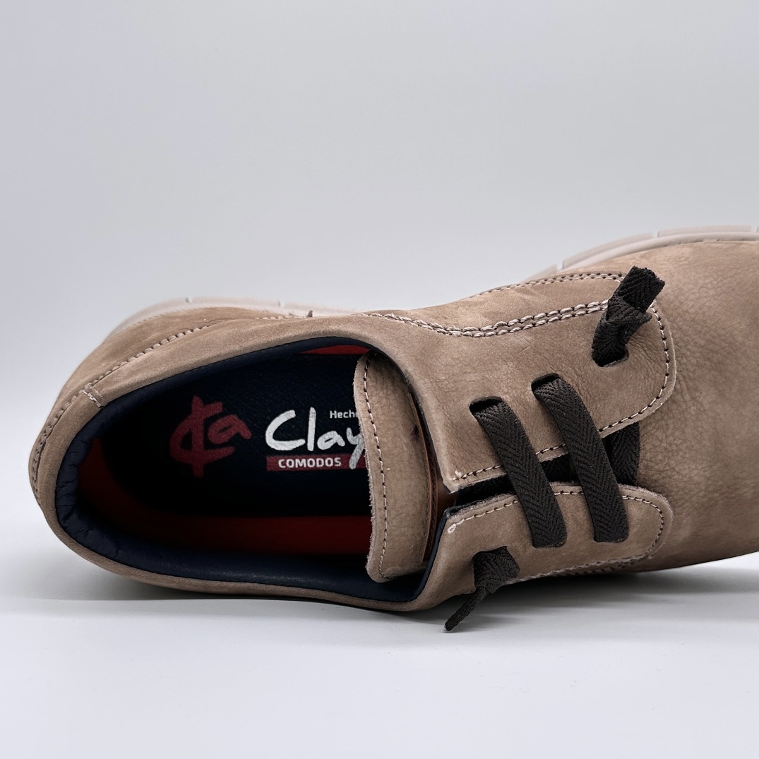 Zapato de Clayan para caballero en piel color taupe, cierre de cordones elásticos, tambien incluye cordones para atar. Plantillas acolchadas extraíbles. Suela de goma anti deslizante muy ligera y flexible.