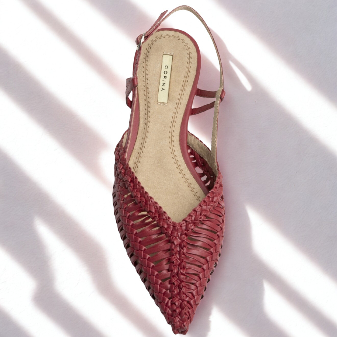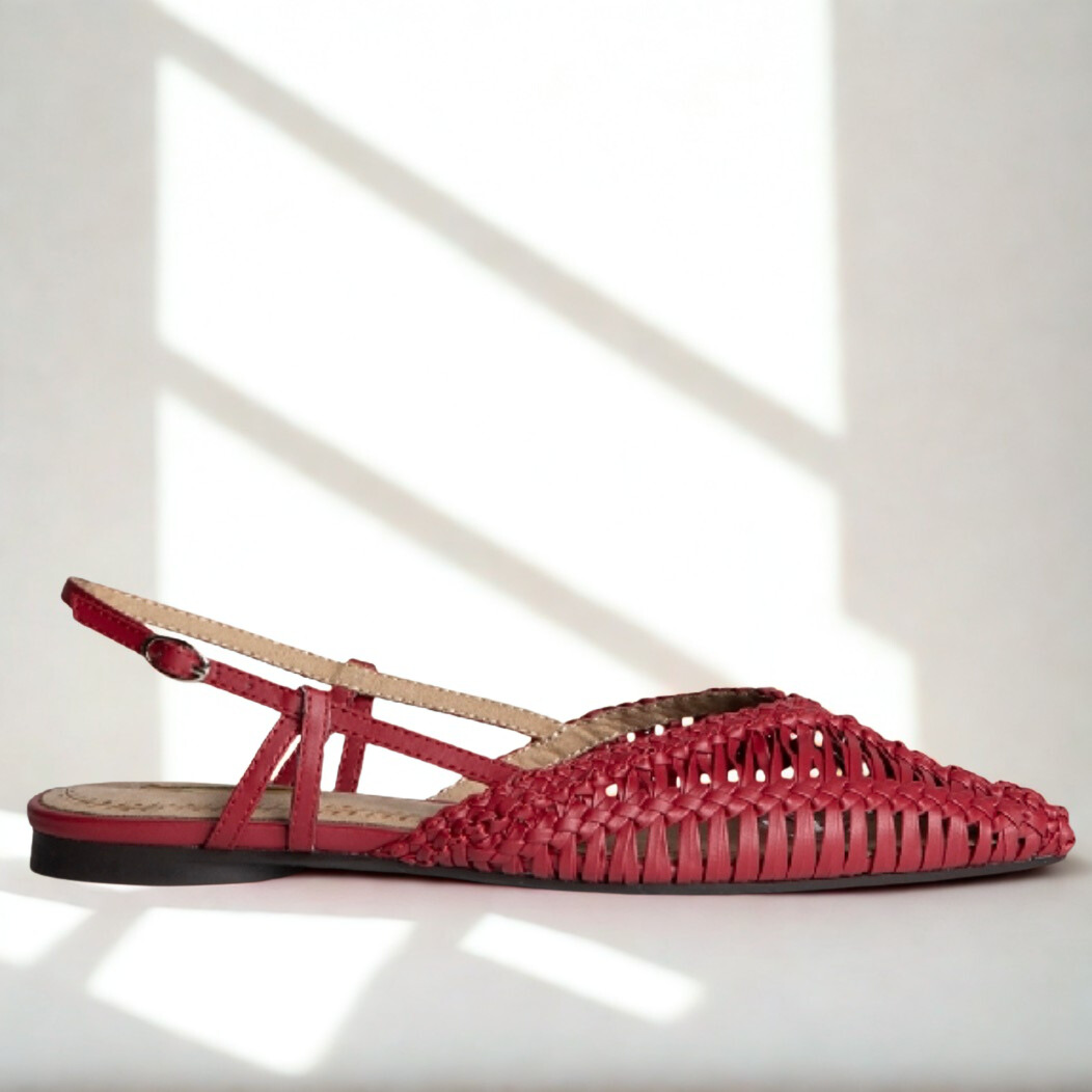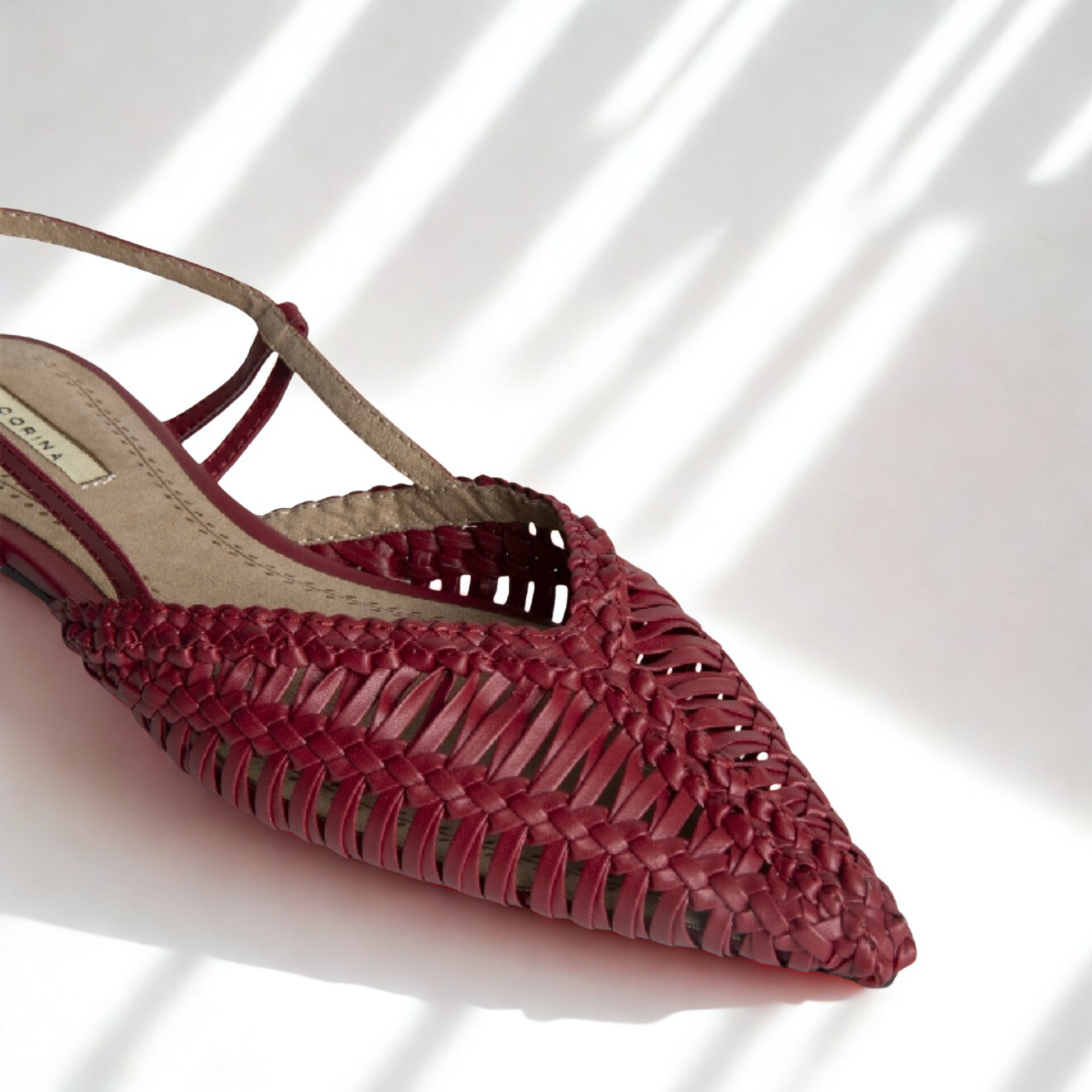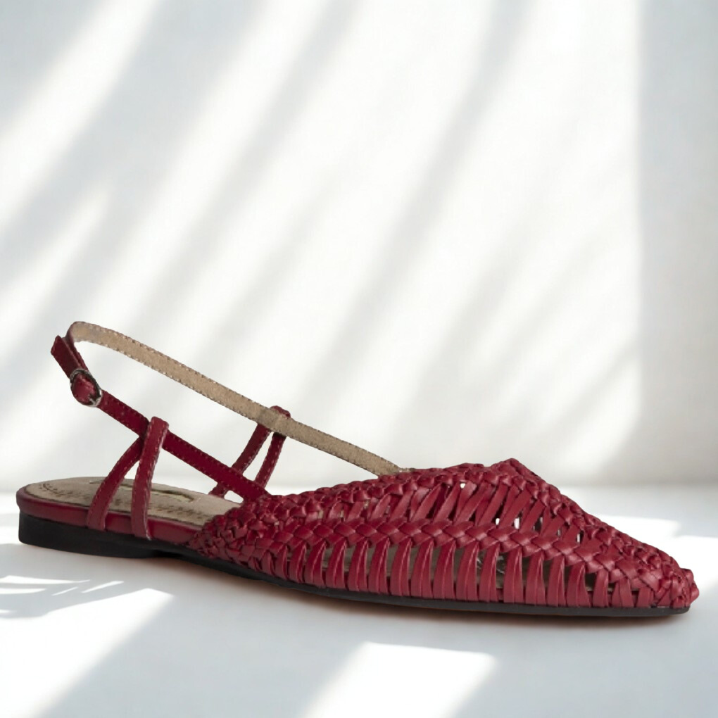 Zapato destalonado de Corina fabricado en polipiel color burdeos. Acabado en punta, hebilla regulable en la parte trasera.