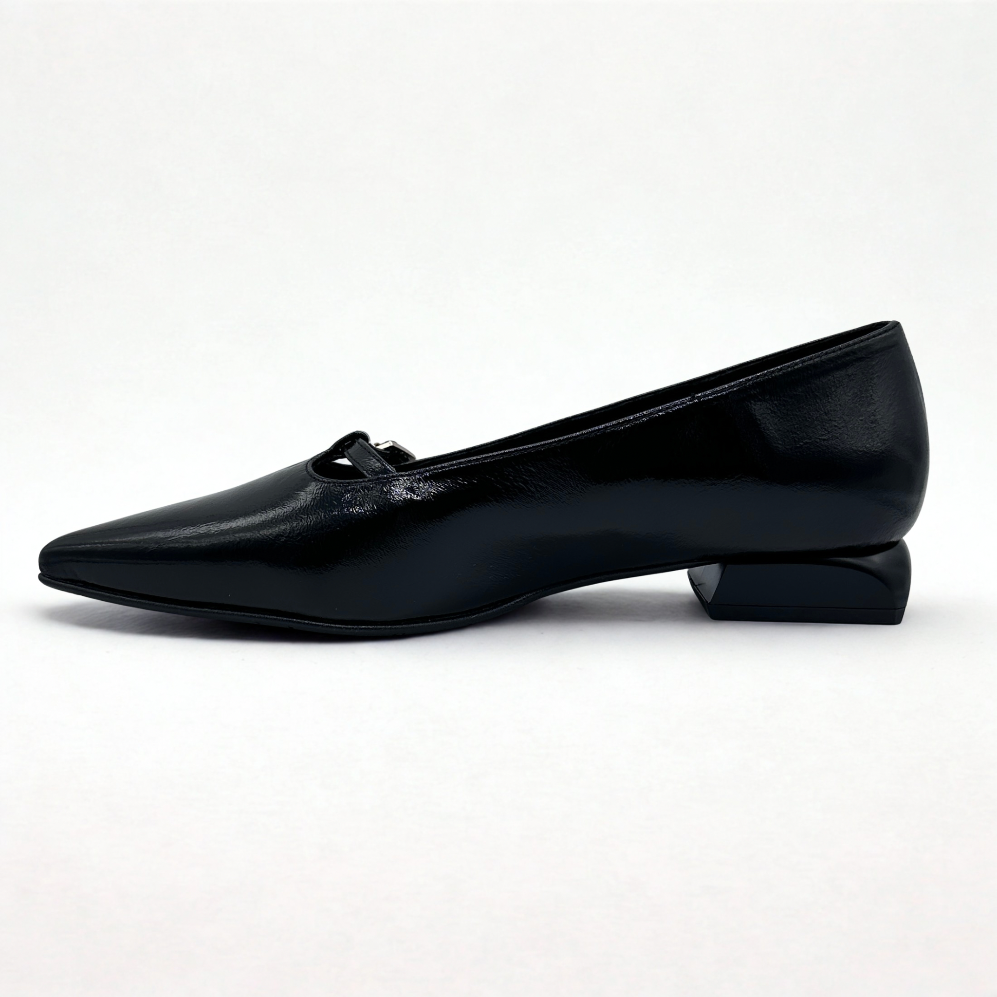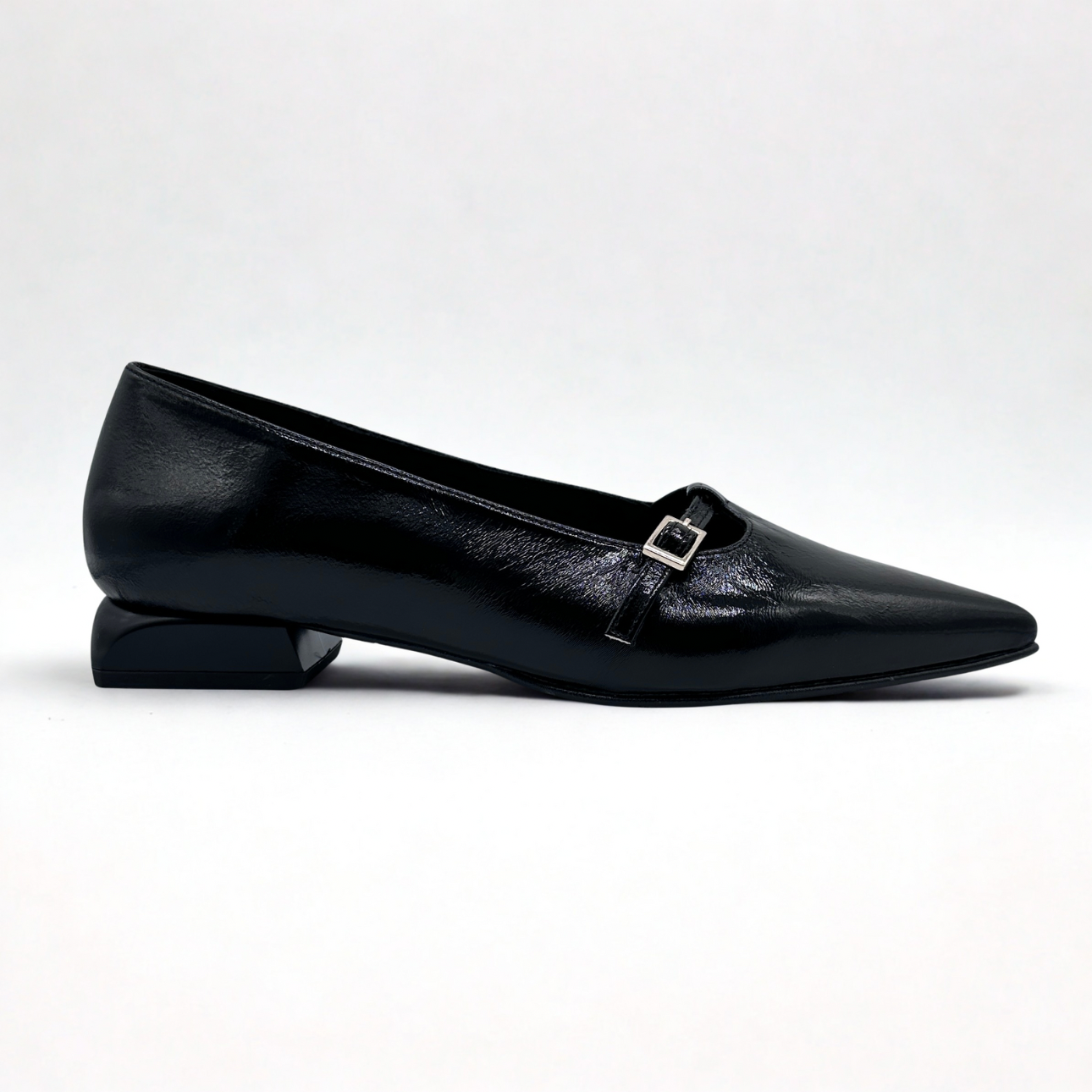 Zapato tipo bailarina de Daniela Vega en piel color negro, acabado en punta para estilizar la siluta. Plantillas de piel acolchadas, suela de goma muy flexible y antideslizante. Pequeño adorno en el empeine con hebilla regulable.