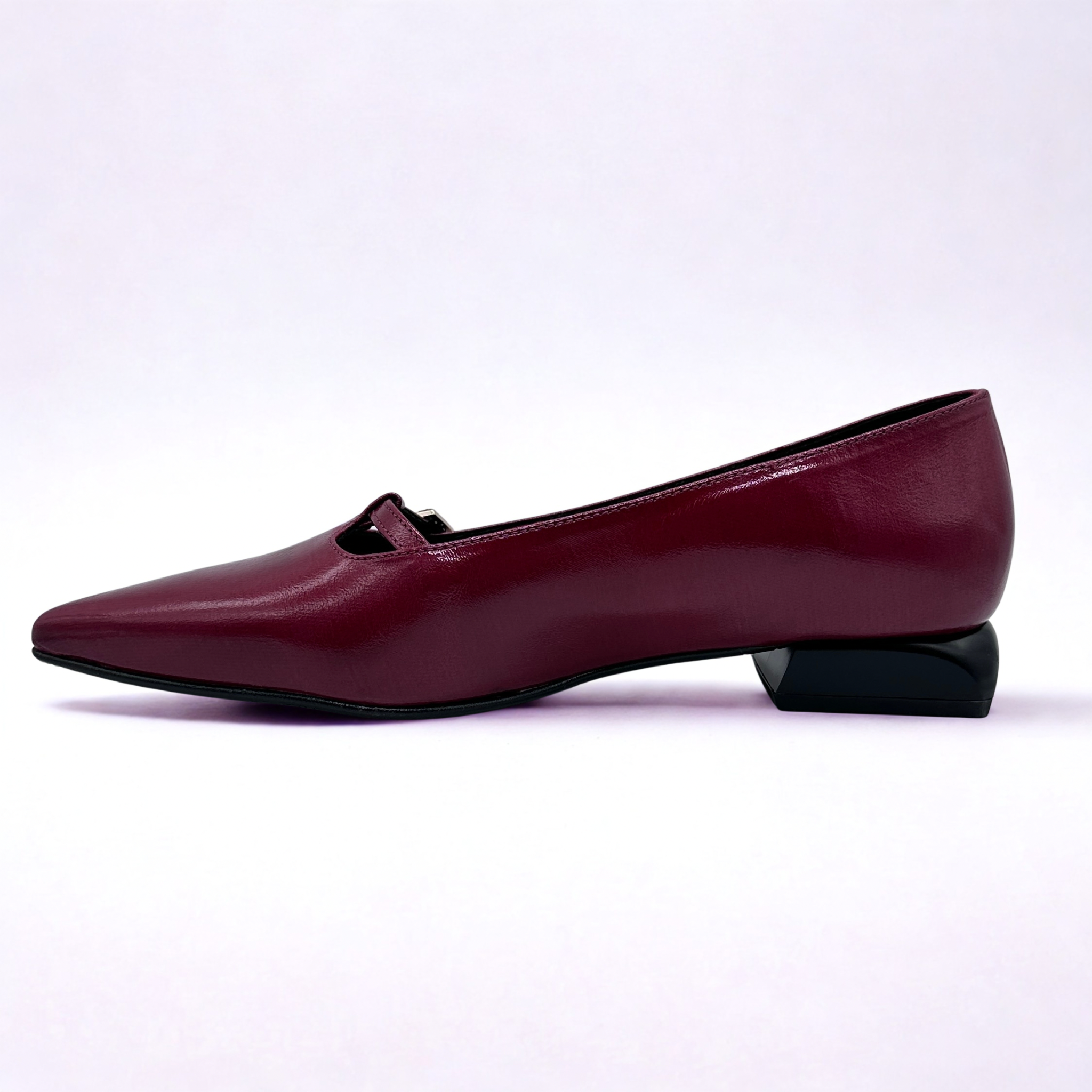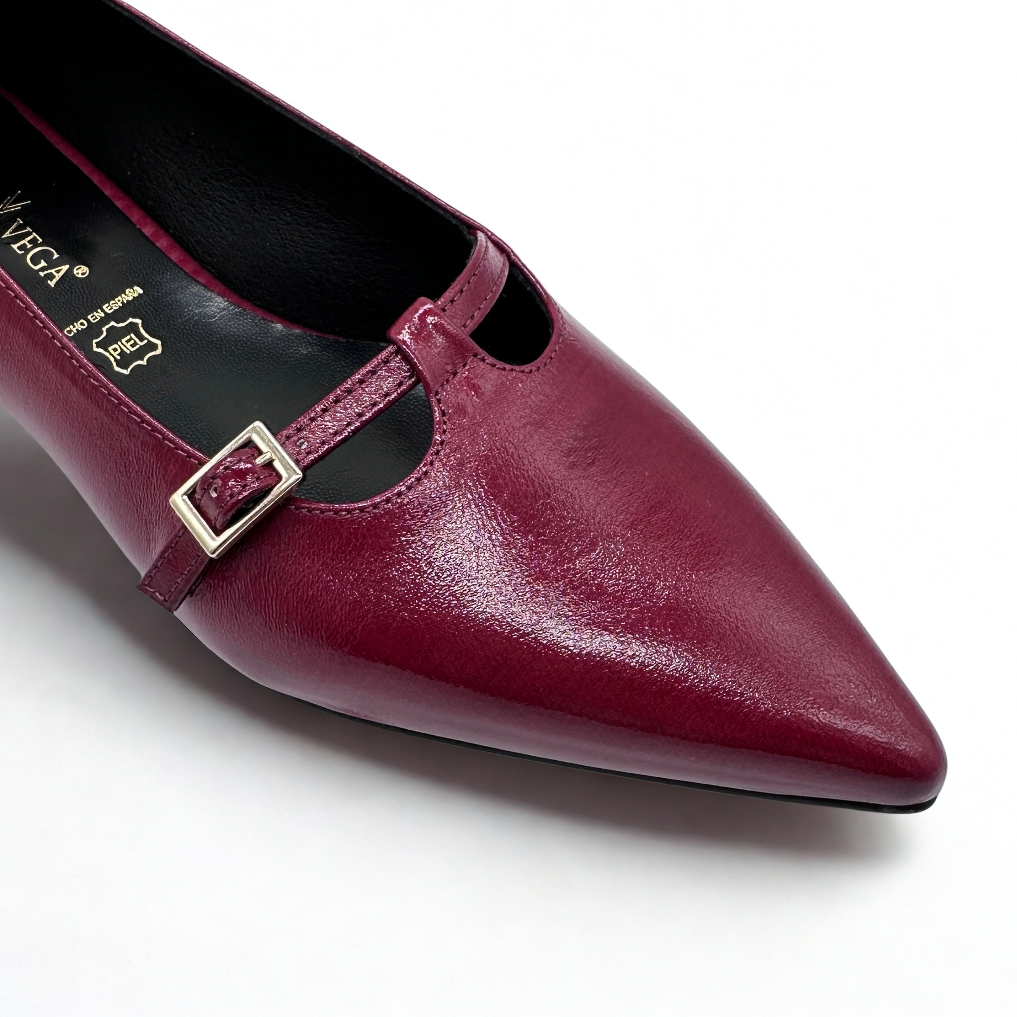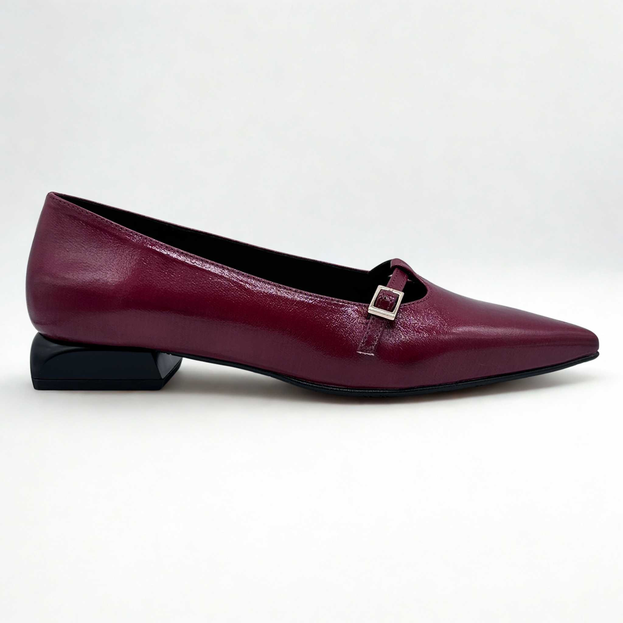 Zapato tipo bailarina de Daniela Vega en piel color burdeos, acabado en punta para estilizar la silueta. Plantillas de piel acolchadas, suela de goma muy flexible y antideslizante. Pequeño adorno en el empeine con hebilla regulable. Tacón bajito y ancho.