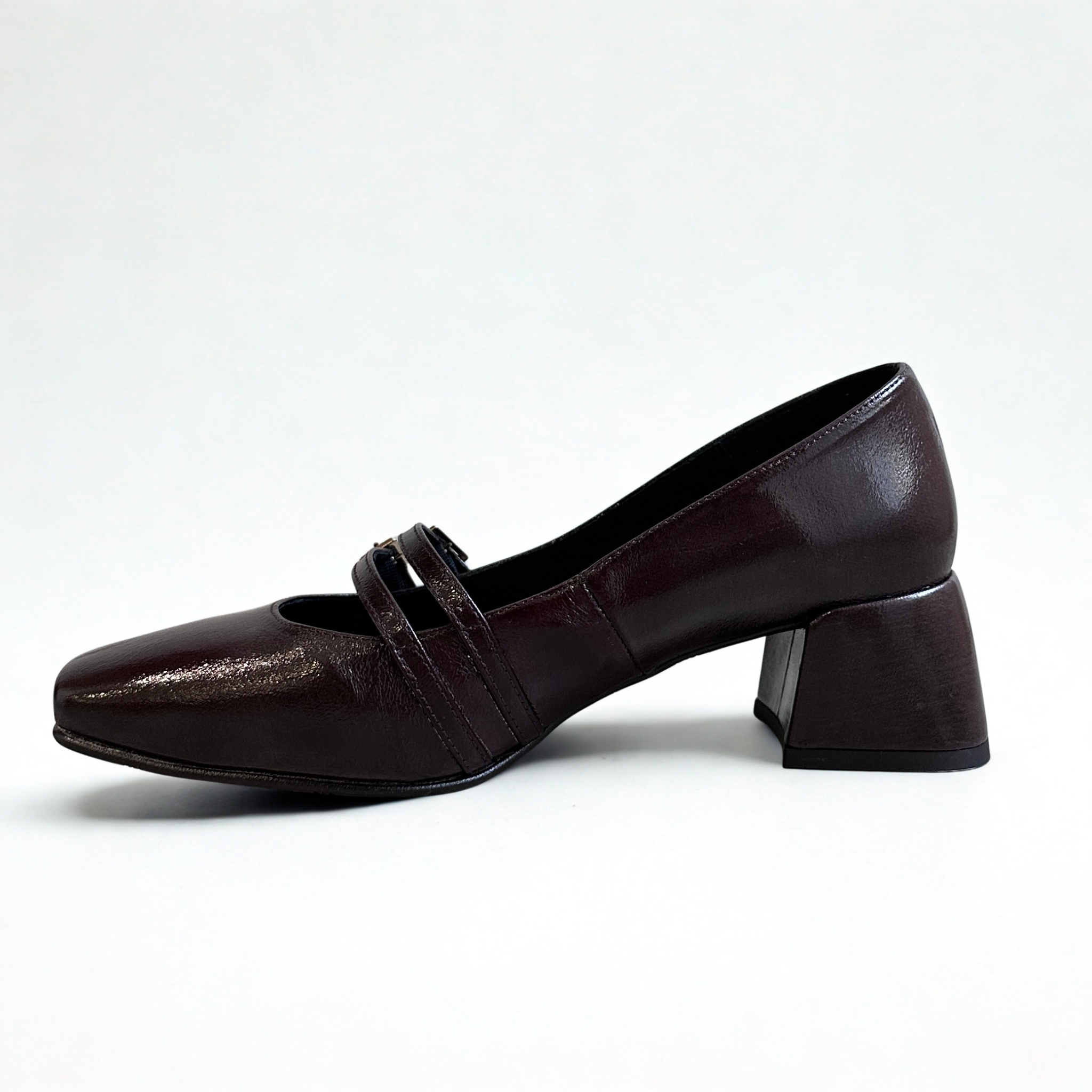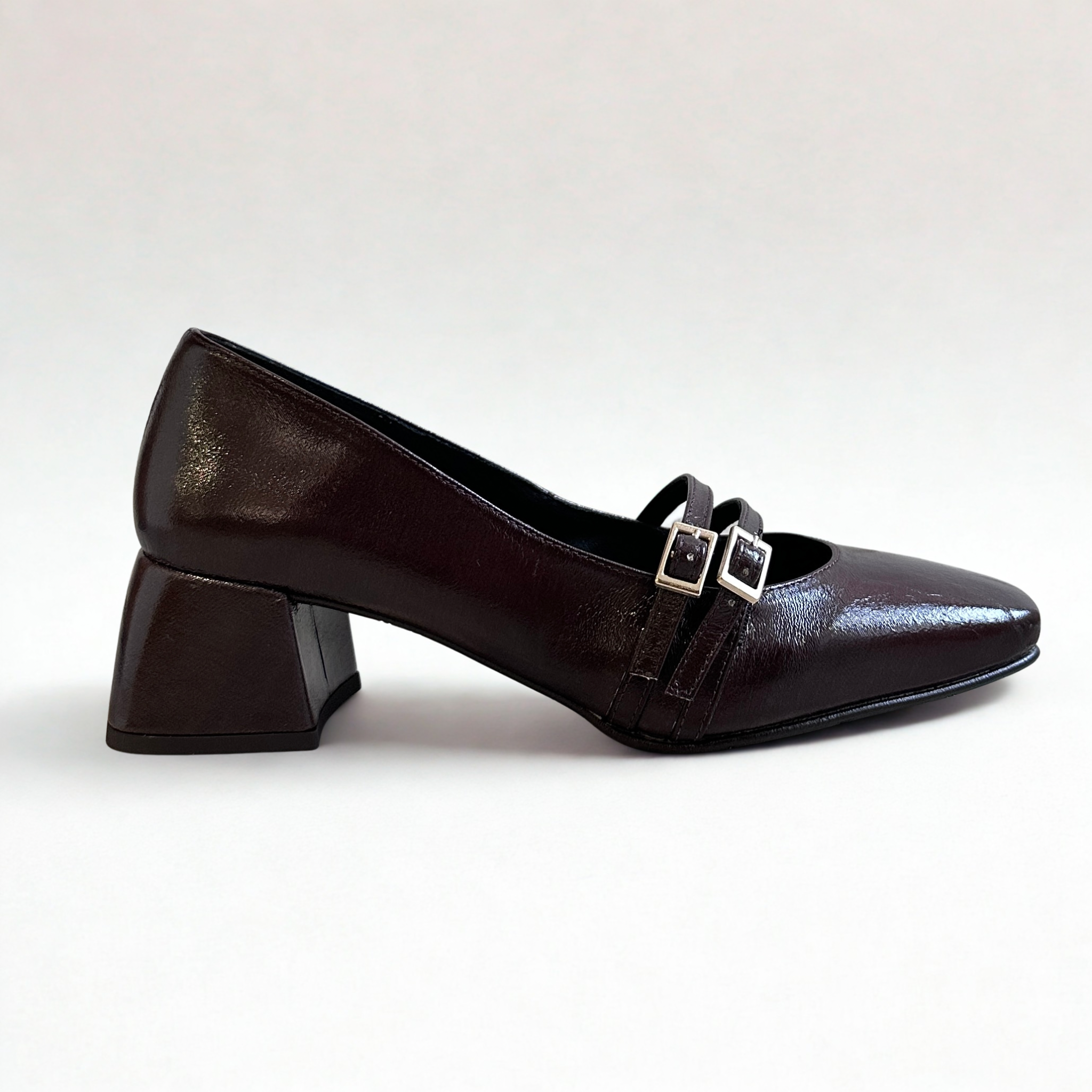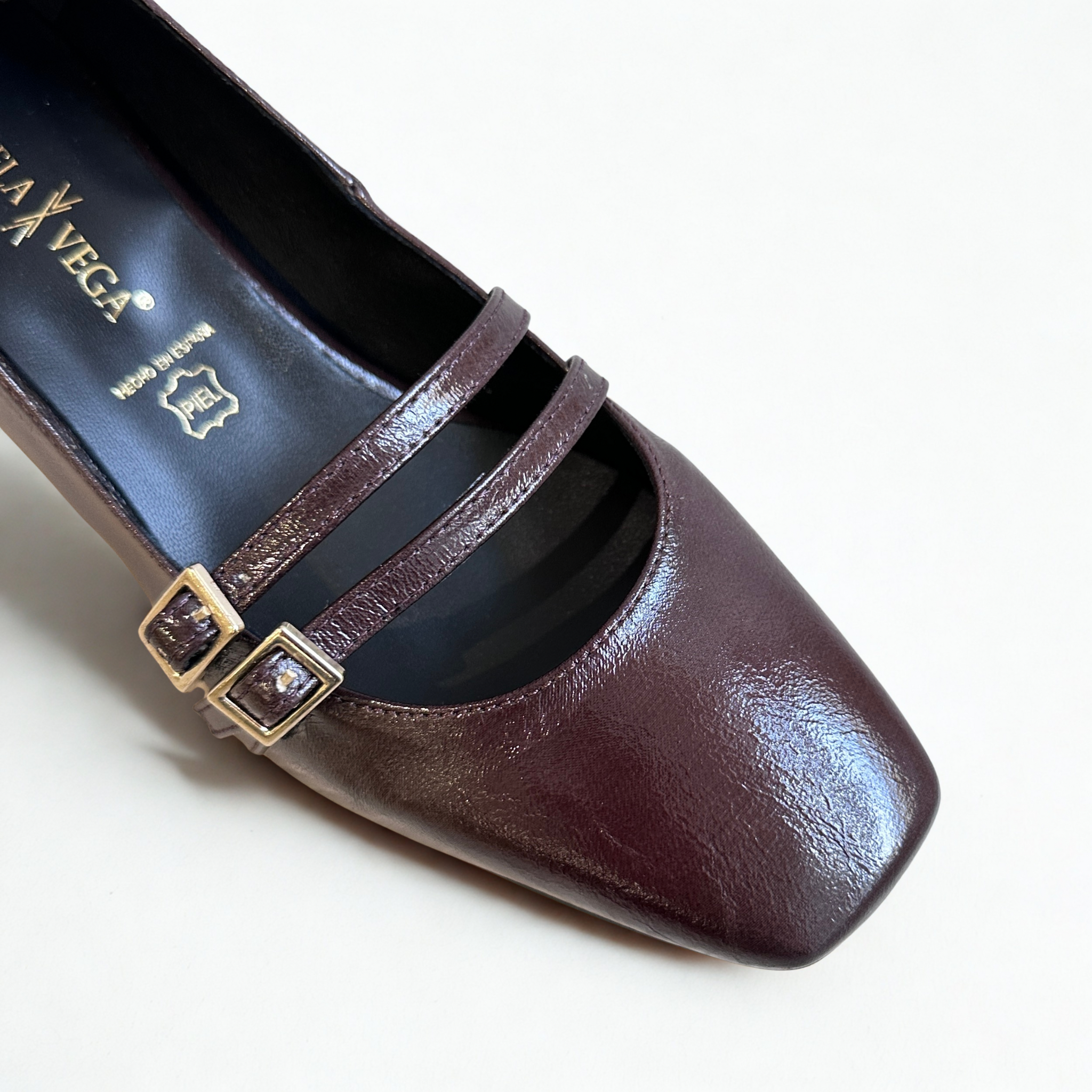 Zapato de Daniela Vega en piel efecto charol color marrón chocolate. Puntera cuadrada y ancha para mayor comodidad, cierre con hebillas regulable para mayor sujeción. Plantillas de piel acolchadas. Suela de goma muy flexible y antideslizante.