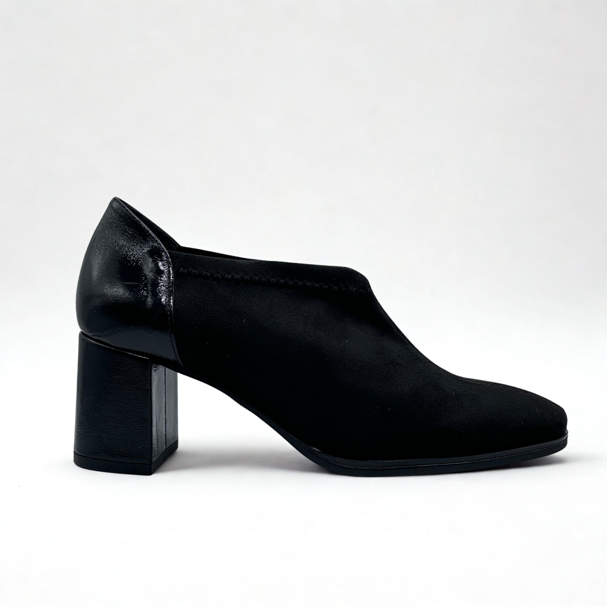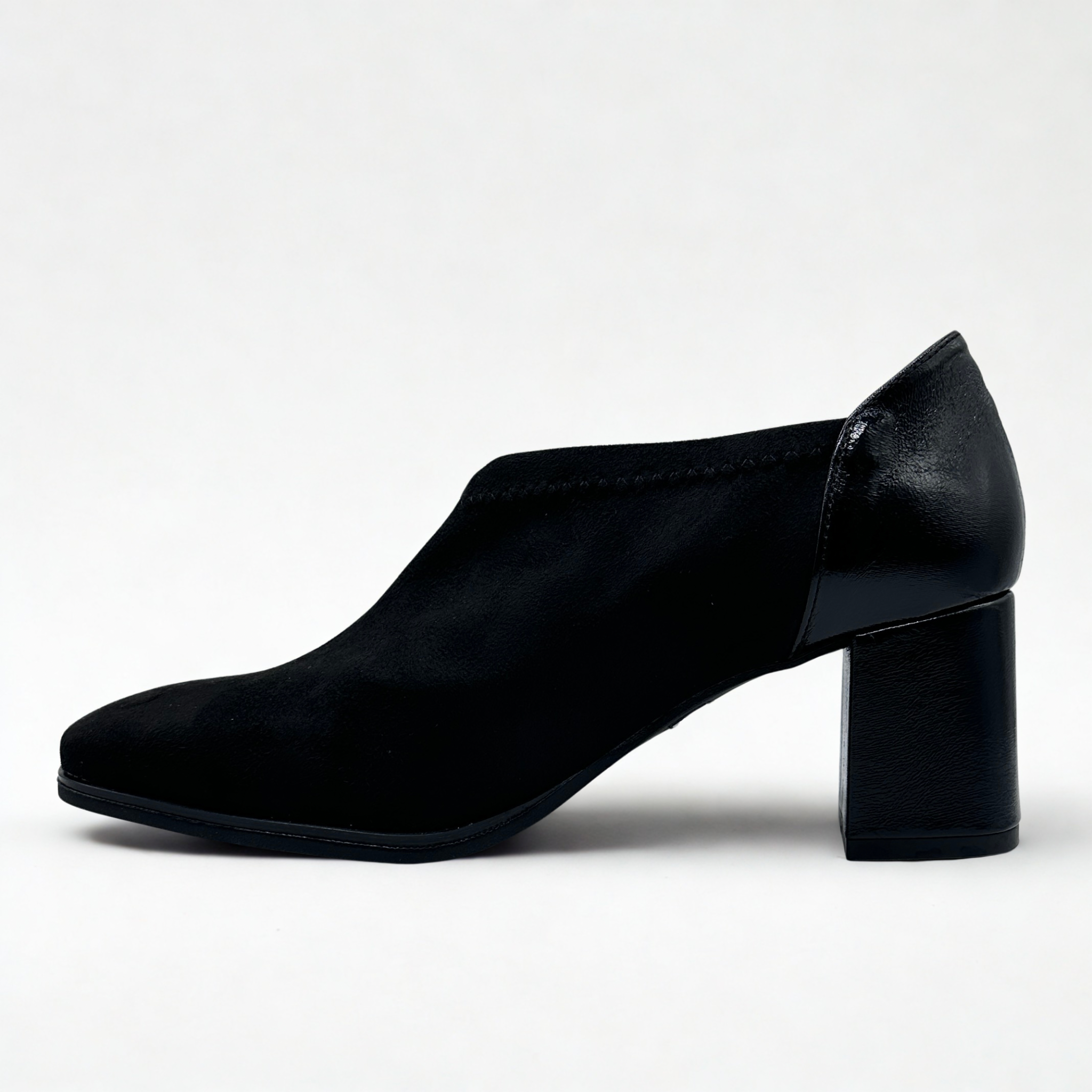 Zapato de Daniela Vega en tejido de ante y licra para un perfecto ajuste al pie. Tacón efecto charol ancho para mayor comodidad. Plantillas de piel acolchadas. Suela de goma muy ligera y super flexible.