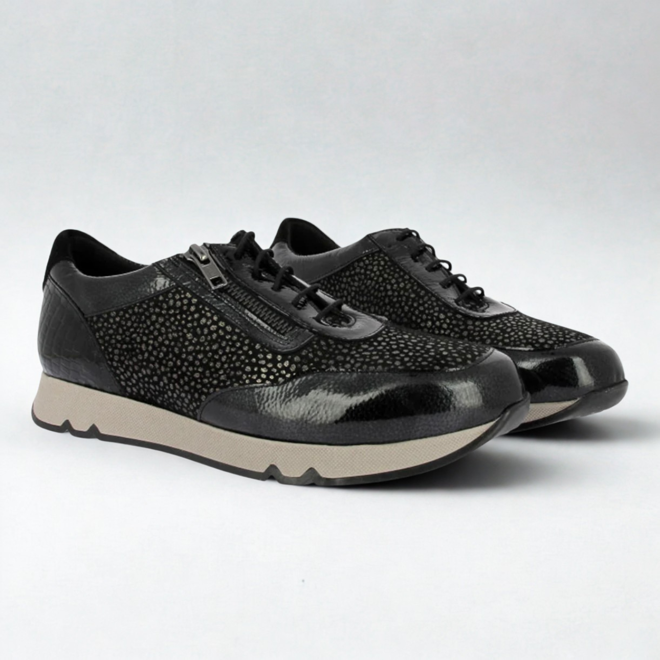 Zapato tipo deportivo de Doctor Cutillas fabricado en combinaciones de licra estampada con pieles lisas y grabadas en color negro. Cuenta con cierre de cremallera y cordones, plantilla extraíble y suela de goma muy ligera antideslizante.