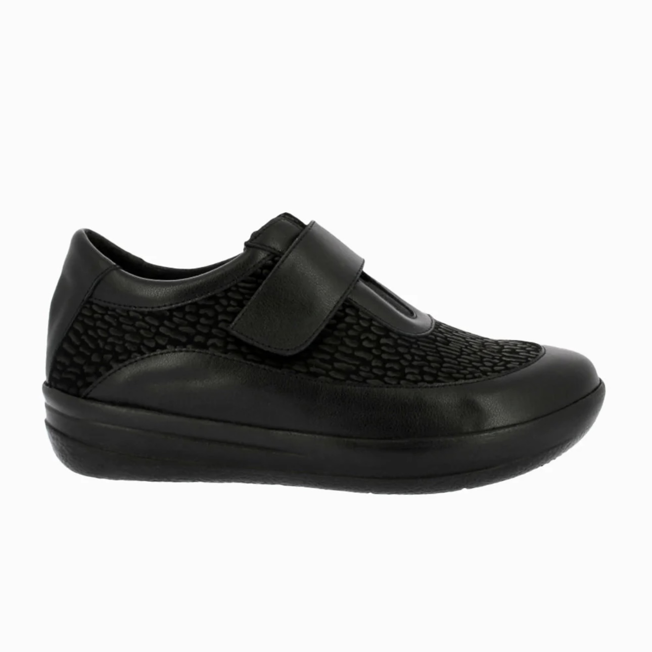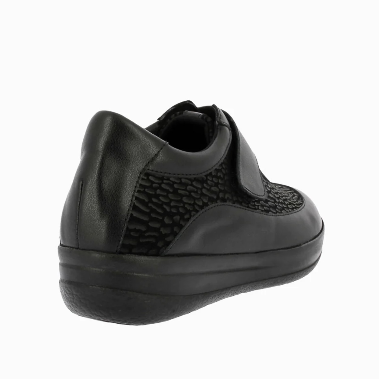 Zapato de Doctor Cutillas de ancho especial en piel color negro y licra estampas, para una gran adapatabilidad y confort. Cierre con velcro y elástico en el empeine, plantilla estraíble y forro suave conrfortable. Suela de goma ultra ligera muy flexible.