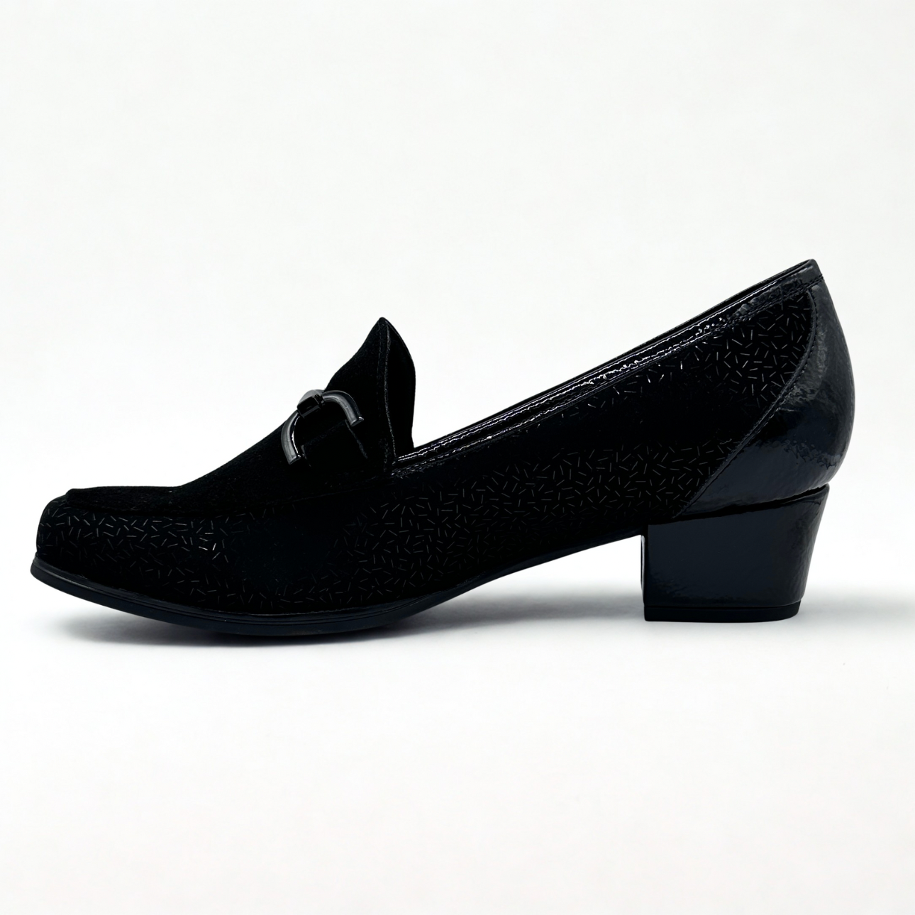 Zapato de Doctor Cutillas de ancho especial, corte mocasín en color negro con detalle de eslabón. Fabricado en una combinación de piel y licra estampada. Tacón forrado y plantilla de piel extraíble. Suela de goma muy ligera y flexible.
