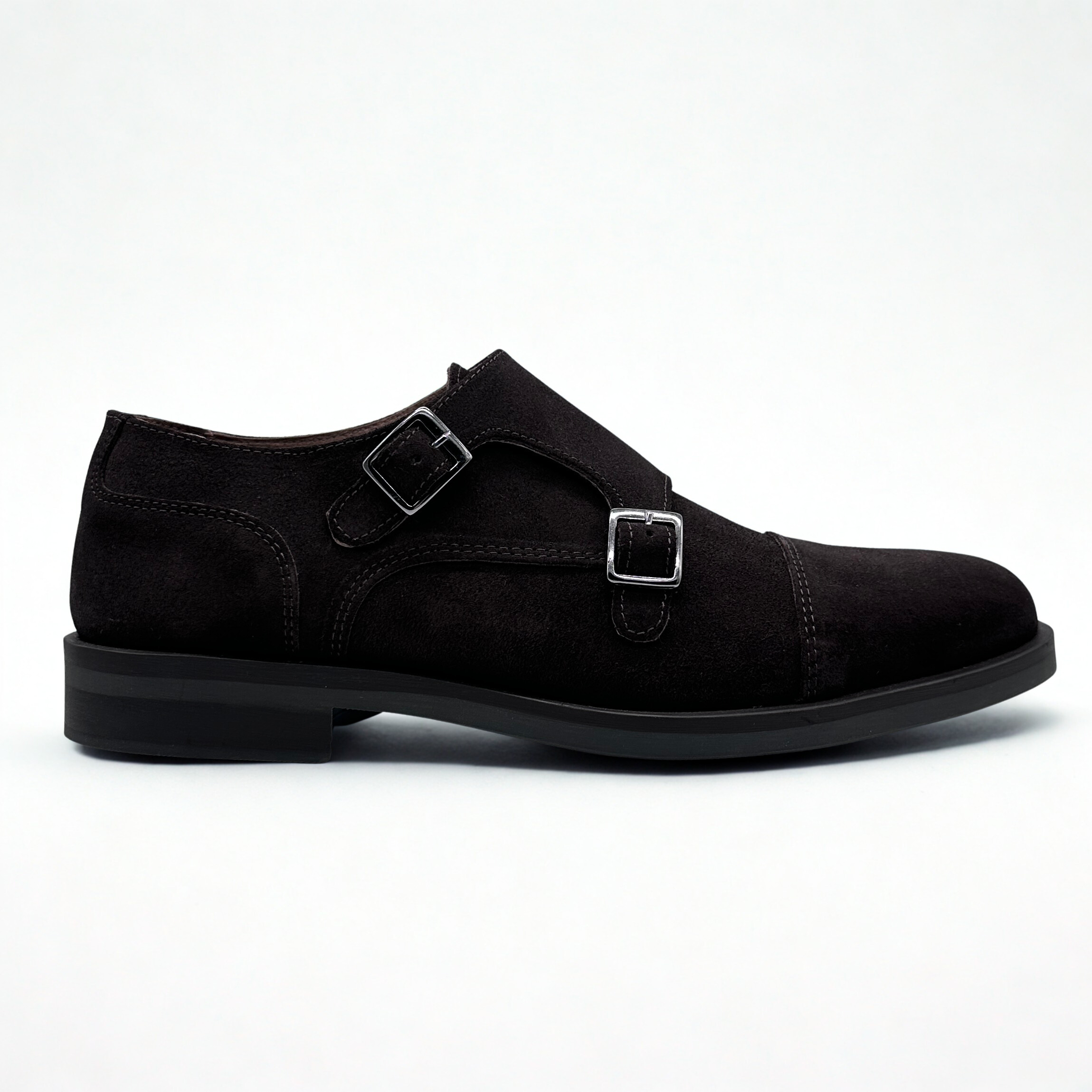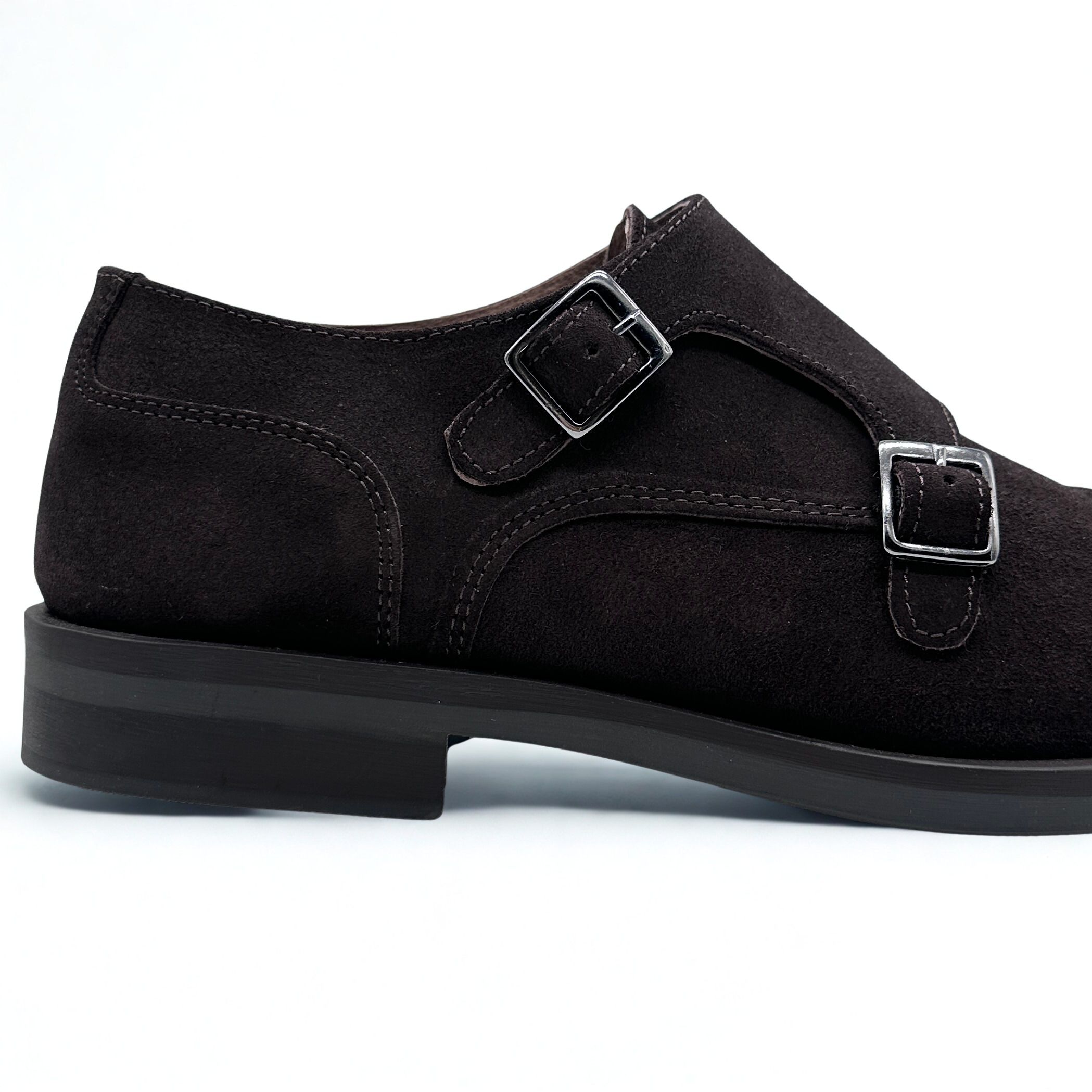 Zapato en piel de serraje color marrón chocolate, cierre con hebillas. Sulea de goma antideslizante.