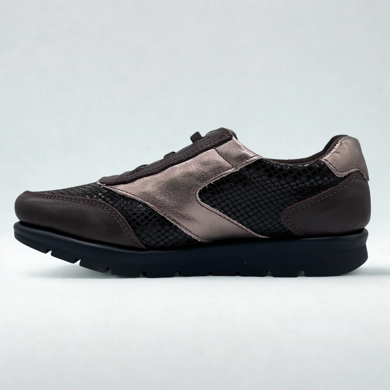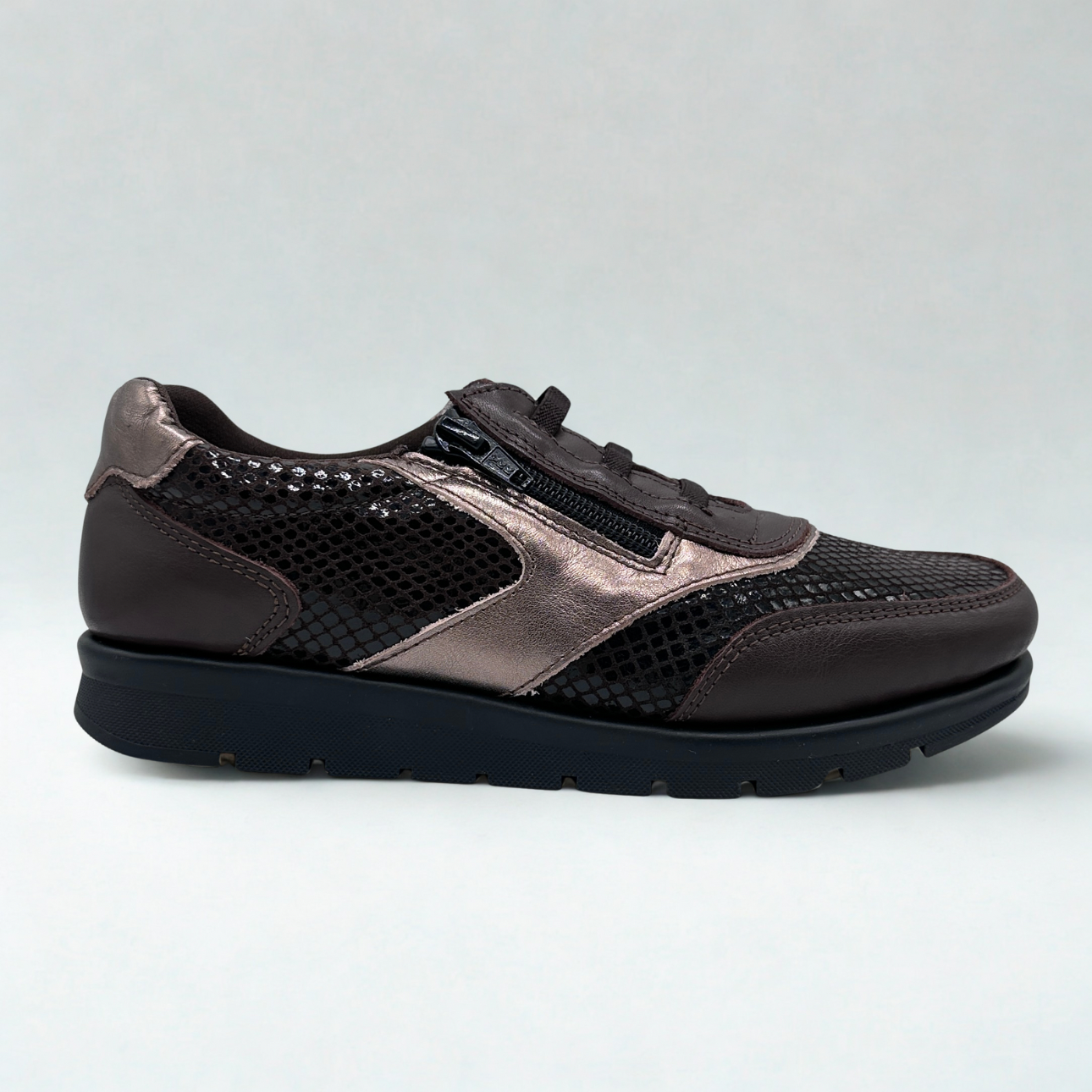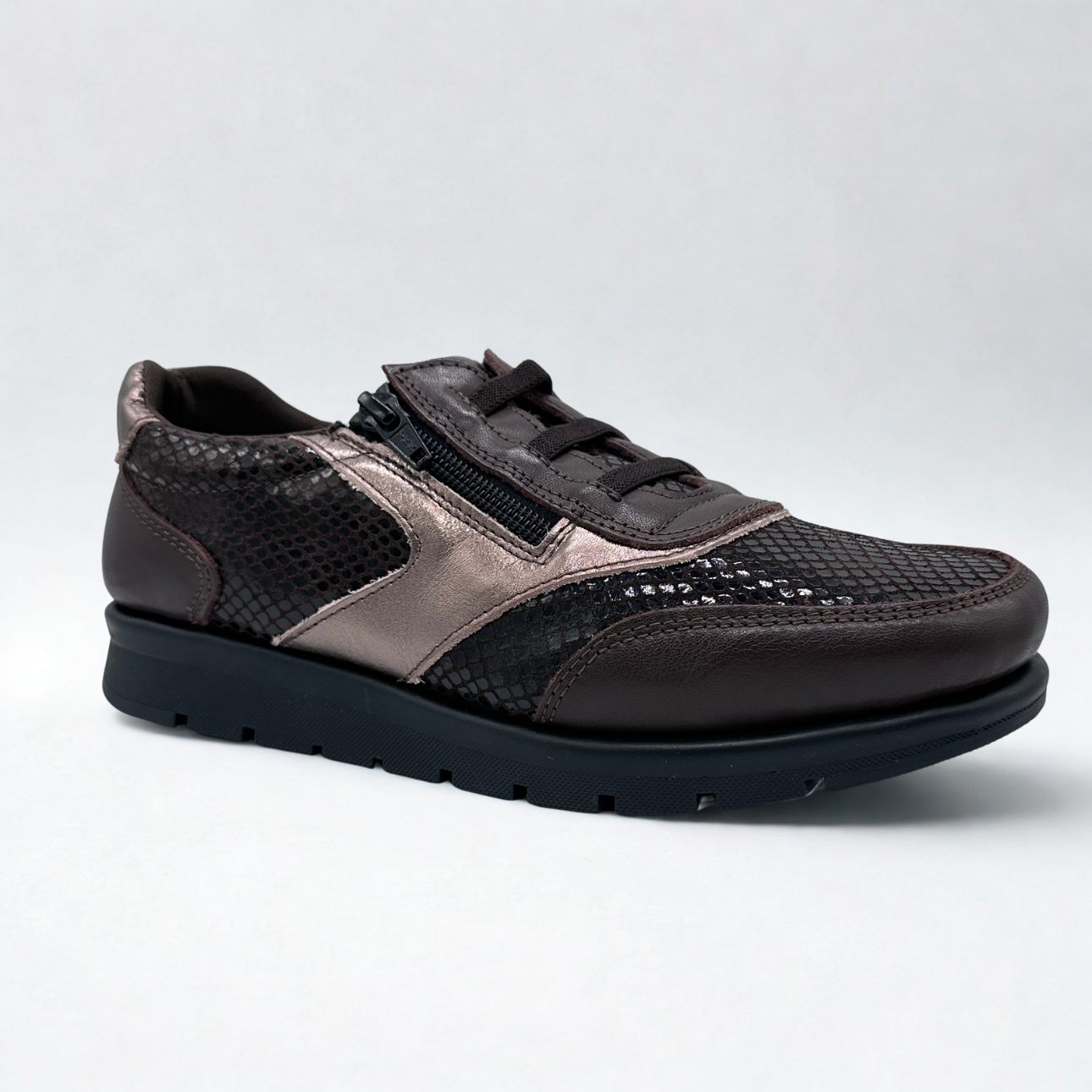 Zapato de Suave by Leyland en piel marrón chocolate combinando texturas en piel de serpiente y bronce. Cordones elásticos y cremallera para facilitar su puesta. Suela de goma súper flexible y antideslizante. Horma ancha. Plantillas de piel acolchadas.